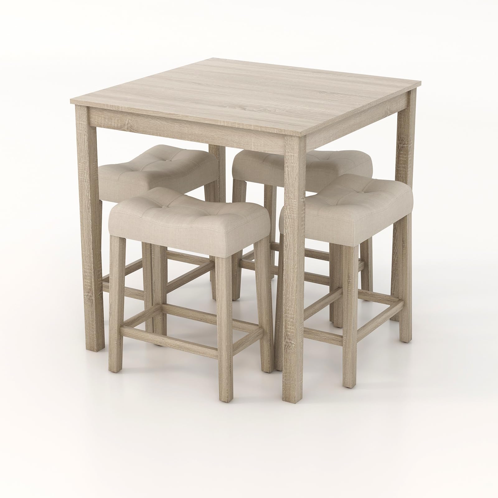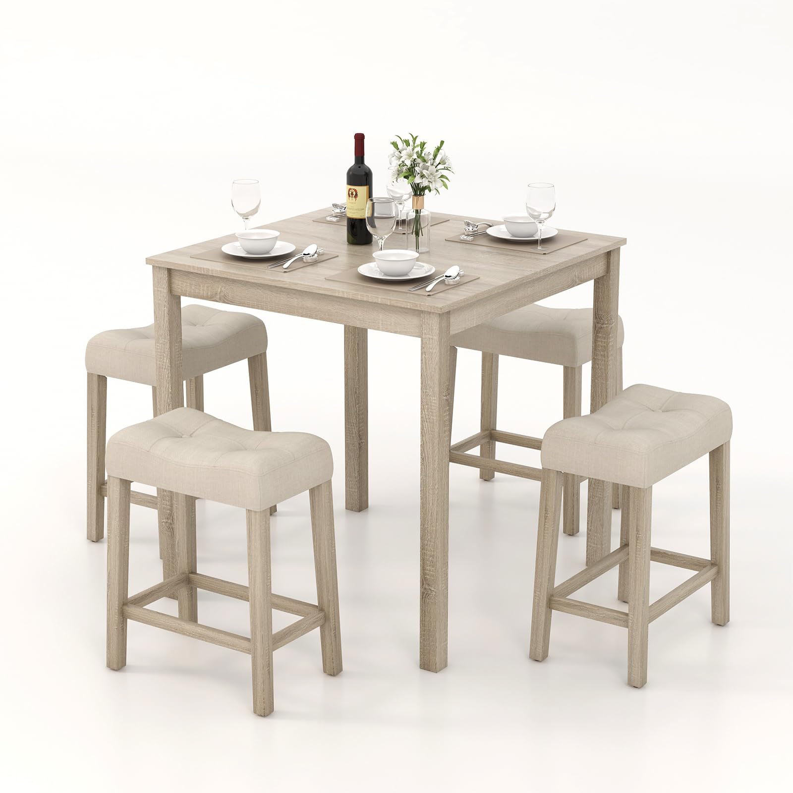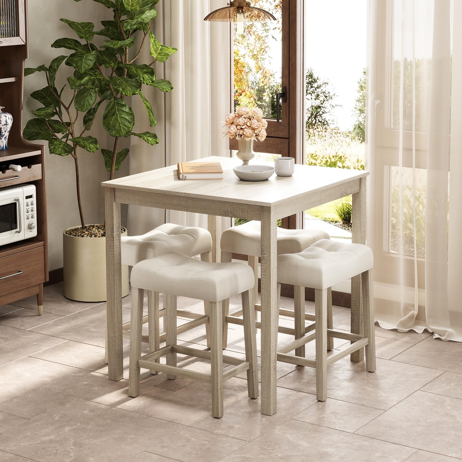 Looking for a stylish and functional bar table set? This elegant dining set features a sturdy dining table and four upholstered stools, ideal for homes with limited space or those who appreciate a minimalist aesthetic. The spacious 35" x 35" MDF tabletop, veneered with wood grain stickers, provides ample space for meals and is both waterproof and wear-resistant for long-lasting use. The premium bar stools, equipped with high-density sponge cushions and comfortable footrests, offer support for extended seating, while their sturdy rubber wood legs ensure stability. This versatile kitchen table set is perfect for living rooms, dining areas, or bars, and its farmhouse design with clean lines and a natural appearance complements various home decoration styles.