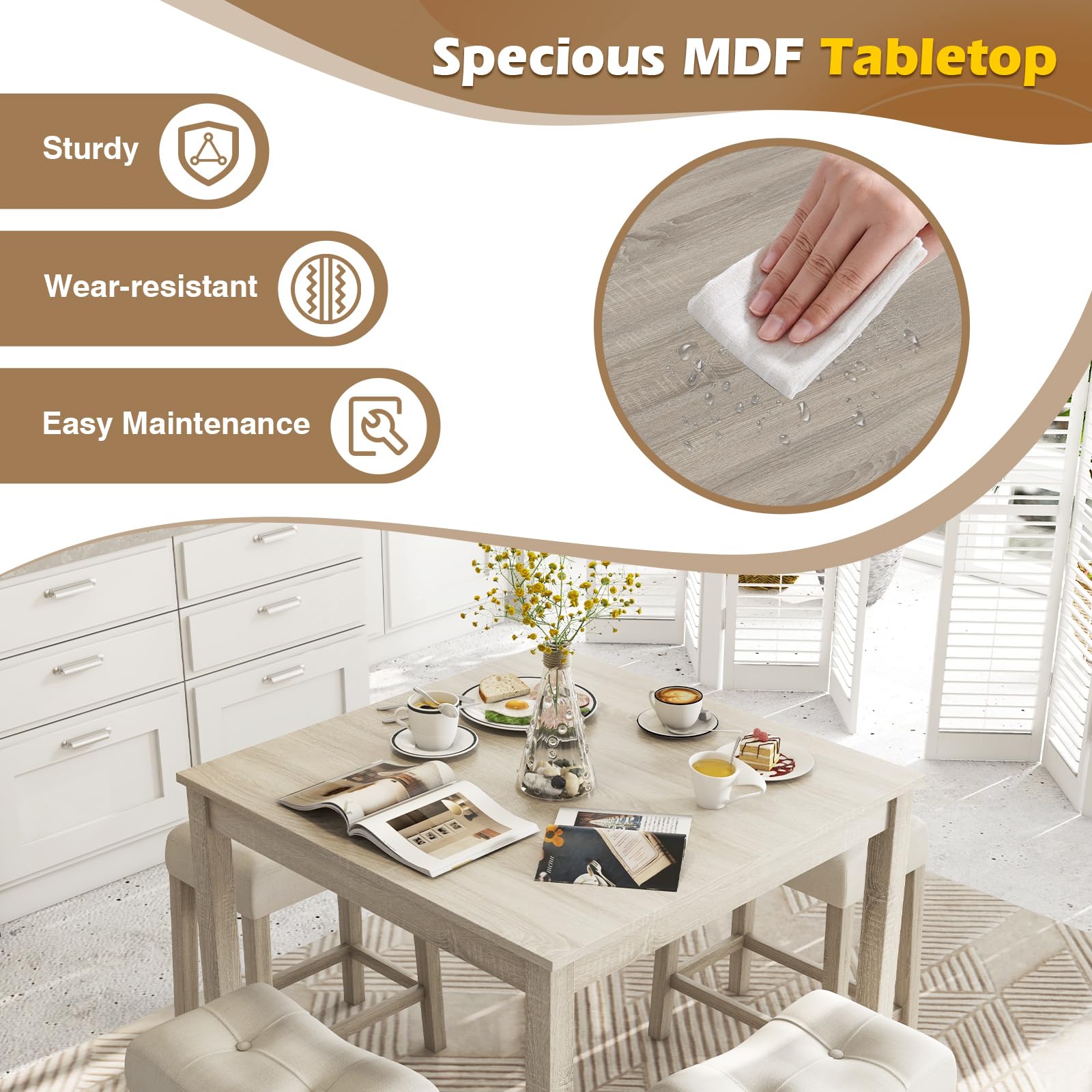 - [Spacious & Waterproof Tabletop]: Enjoy a generous 35”x 35"MDF tabletop veneered with waterproof wood grain stickers on this square dining table, providing ample space for meals and tableware while ensuring durability for long-term use.