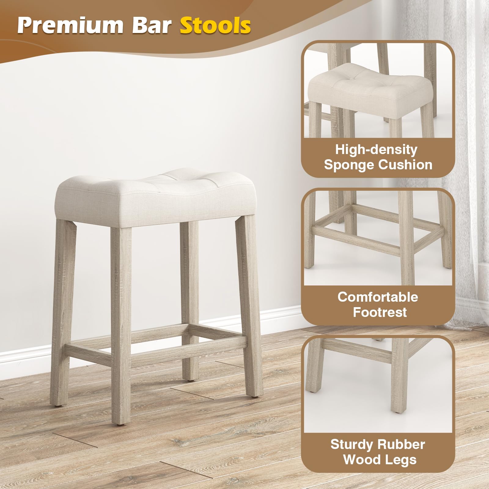 - [Comfortable & Stylish Stools]: Enhance your dining experience with 4 premium bar stools featuring high-density sponge cushions, footrests for comfort, and sturdy rubber wood legs for stability, making them both stylish and functional for extended seating comfort.