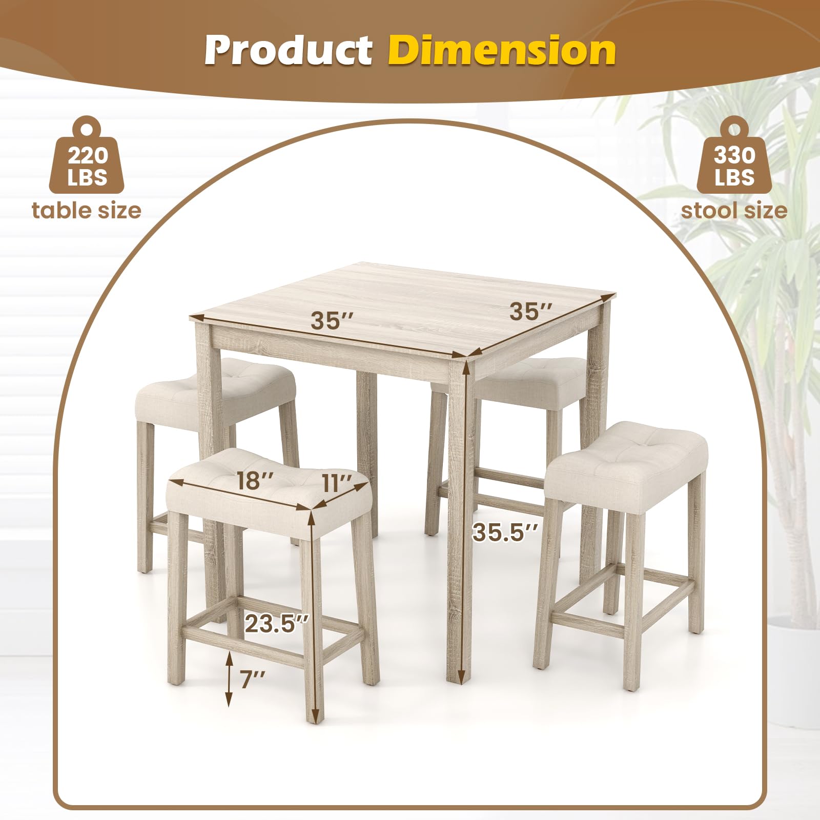 - [Easy Maintenance & Dimensions]: Cleaning and upkeep are a breeze with wear-resistant surfaces. The dining table measures 35"x 35"x 35.5" and supports up to 220 lbs, while each bar stool measures 18"x 11"x 23.5" and can bear up to 330 lbs, providing both durability and comfort.