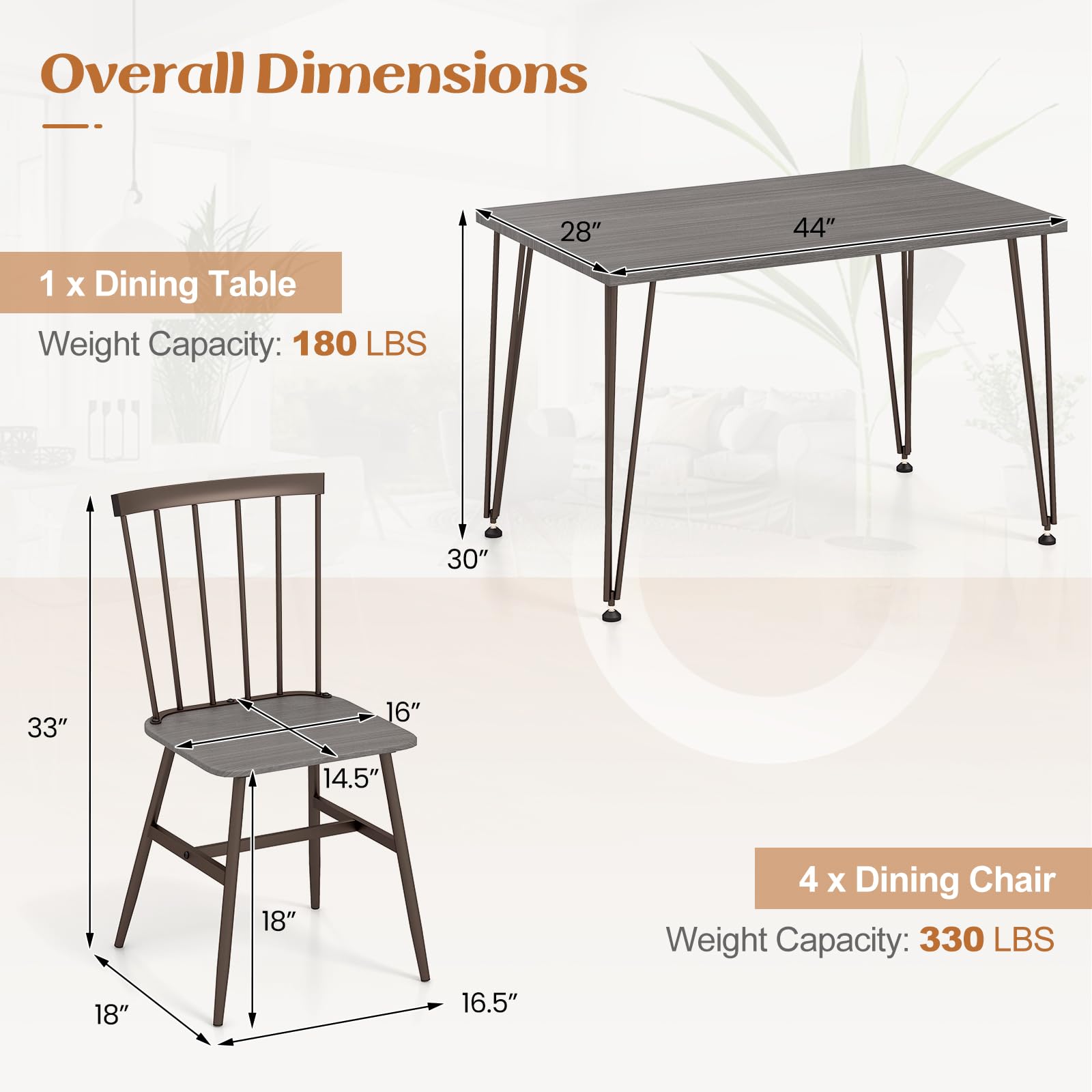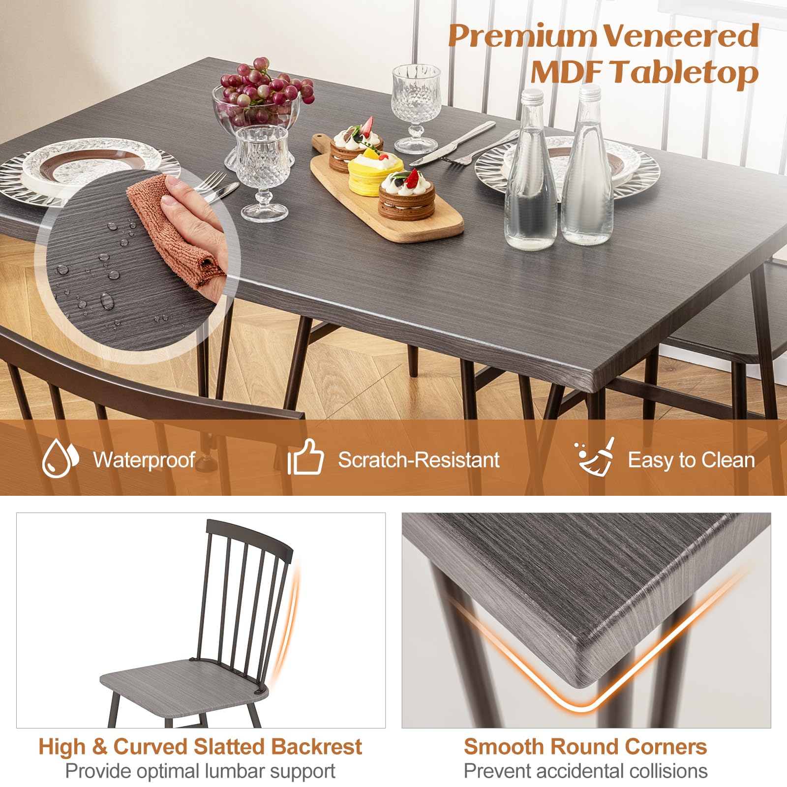 Create a warm and inviting dining space with our versatile 5-piece dining table set. Perfect for family meals or hosting guests, this dining table set includes a table and 4 chairs. The dining chairs can be conveniently tucked under the table when not in use, saving valuable space. Enjoy stability on any surface with the table's 360° swivel oversized feet, providing balance on uneven floors. Crafted for longevity, the dining table boasts reinforced metal legs, while the chairs feature an H-shaped metal structure. The tabletop is made from durable MDF with PVC veneers, creating a waterproof and effortless to clean surface. Enhance your dining experience with this chic and practical dining set.