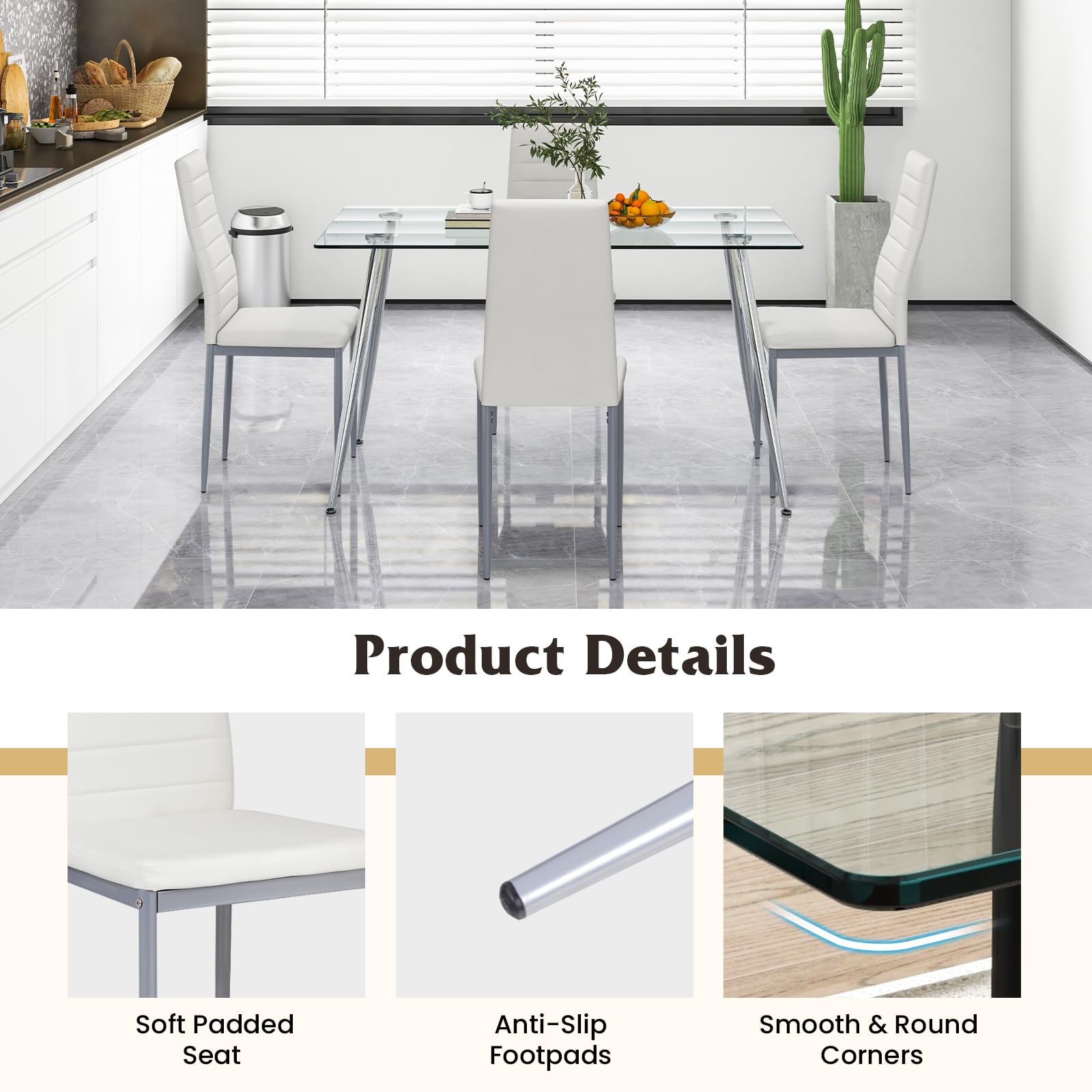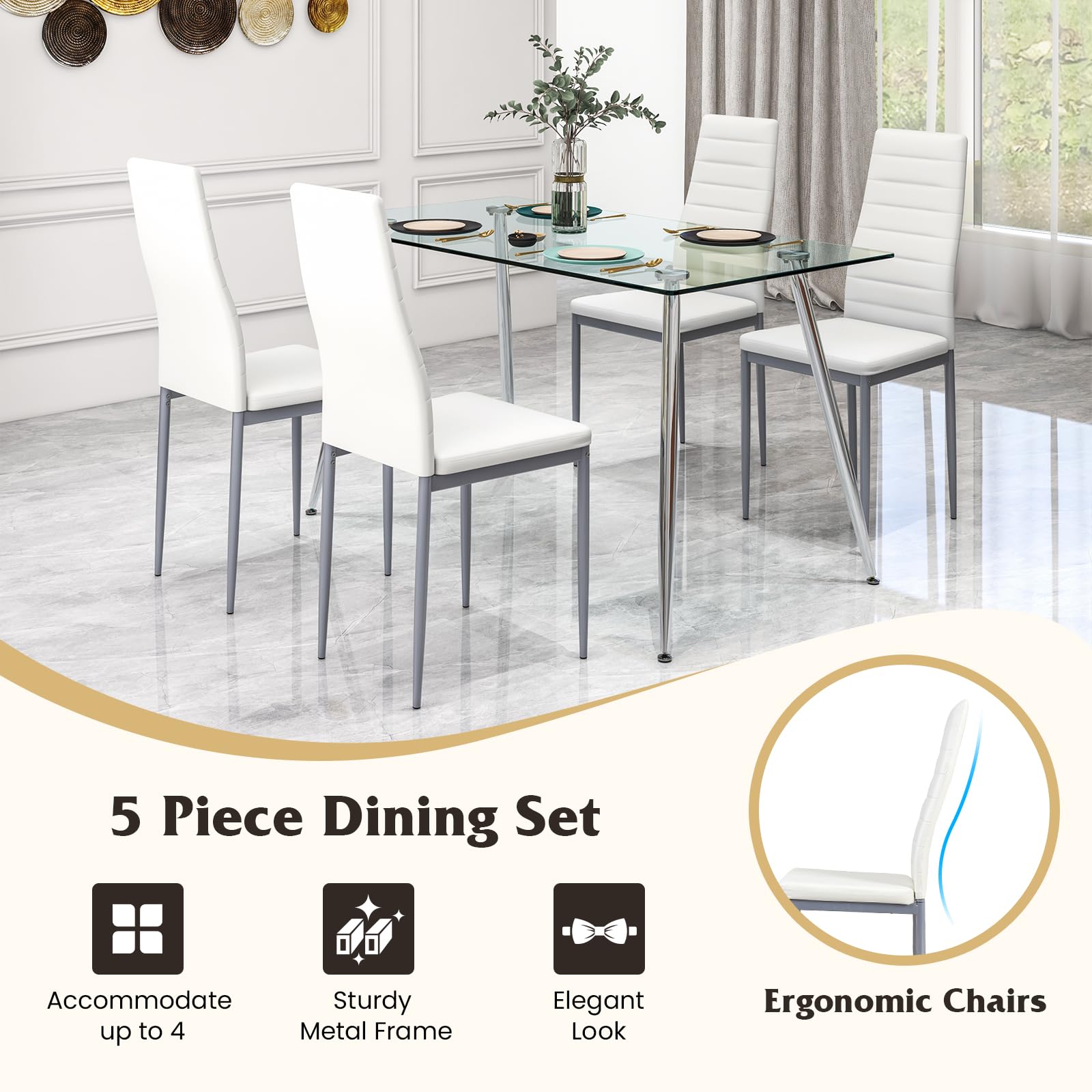 Upgrade your dining area with our sleek 5-piece modern dining set. This dining table set includes a spacious table and 4 comfortable dining chairs, accommodating up to 4 individuals. Crafted with a sturdy metal frame and adjustable footpads for durability and stability. The chic tempered glass top adds a contemporary touch while simplifying cleaning. The dining chairs feature high backrests and padded seats for maximum comfort. Easily save space by tucking the chairs under the table. Perfect for family meals or intimate gatherings, this dining set is a stylish addition to any home. Enjoy stylish dining with ease and comfort!