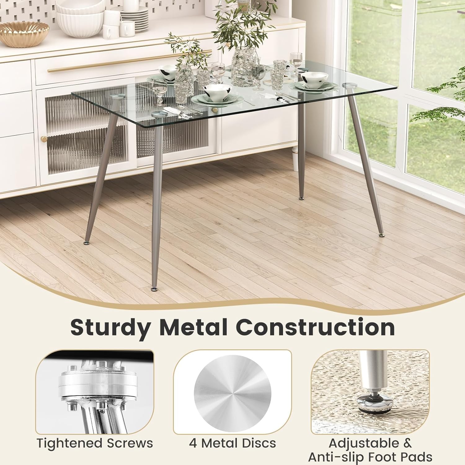 【Spacious Glass Tabletop with Rounded Corners】: Measuring 51” x 27.5” x 0.3” (L x W x Thickness), the tabletop offers plenty of space for storing various meals and kitchenware. The elegant glass surface not only adds a touch of sophistication but is also easy to clean and maintain. And the smooth and rounded corners ensure added safety.