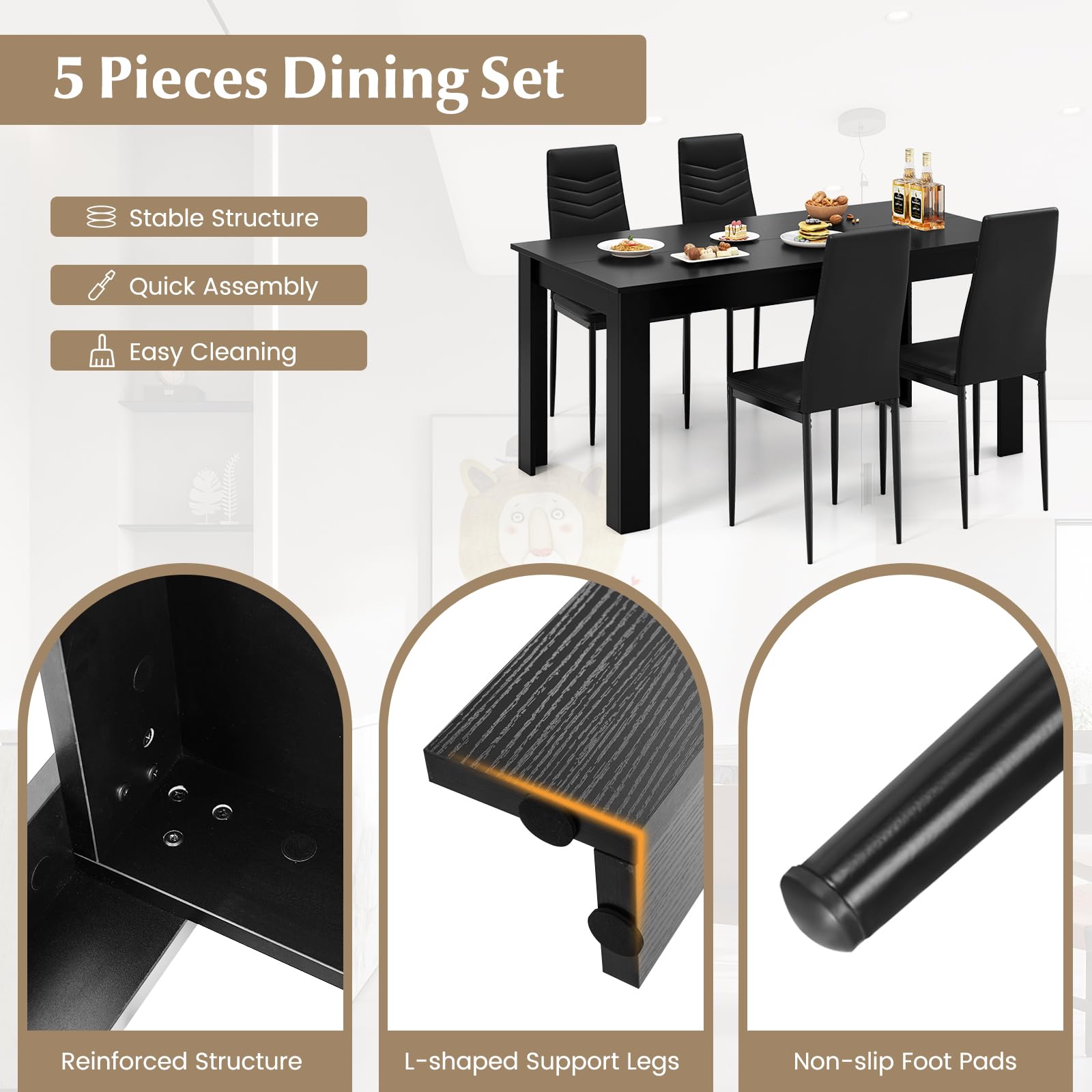 Use our 5 pieces dining set to create a welcoming atmosphere in your dining space. This stylish yet practical dining table set provides 1 rectangular table and 4 dining chairs to entertain your guests. Large tabletop offers enough space for your tableware, food, fruits, vases, books, cups, etc. Besides, the ergonomic backrest holds your back and relieves your fatigue, while the sponge padded seat ensures ultra comfort. With L-shaped table legs and metal chair legs, our kitchen table set keeps stable and steady on the ground. Moreover, there are anti-slip foot pads to further add steadiness and avoid scratching the floor.