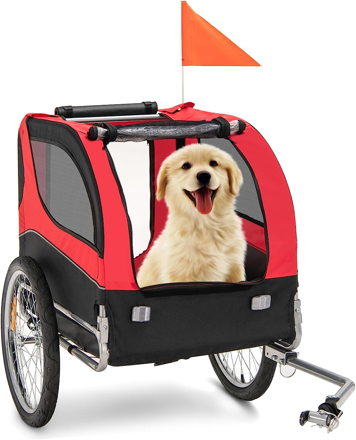 - RED FLAG & 8 REFLECTORS: The dog bike trailer is equipped with a red safety flag and 8 bright reflectors for enhanced night visibility. It also features a D-shaped buckle inside to secure your dog leash and prevent any potential accidents on the road.