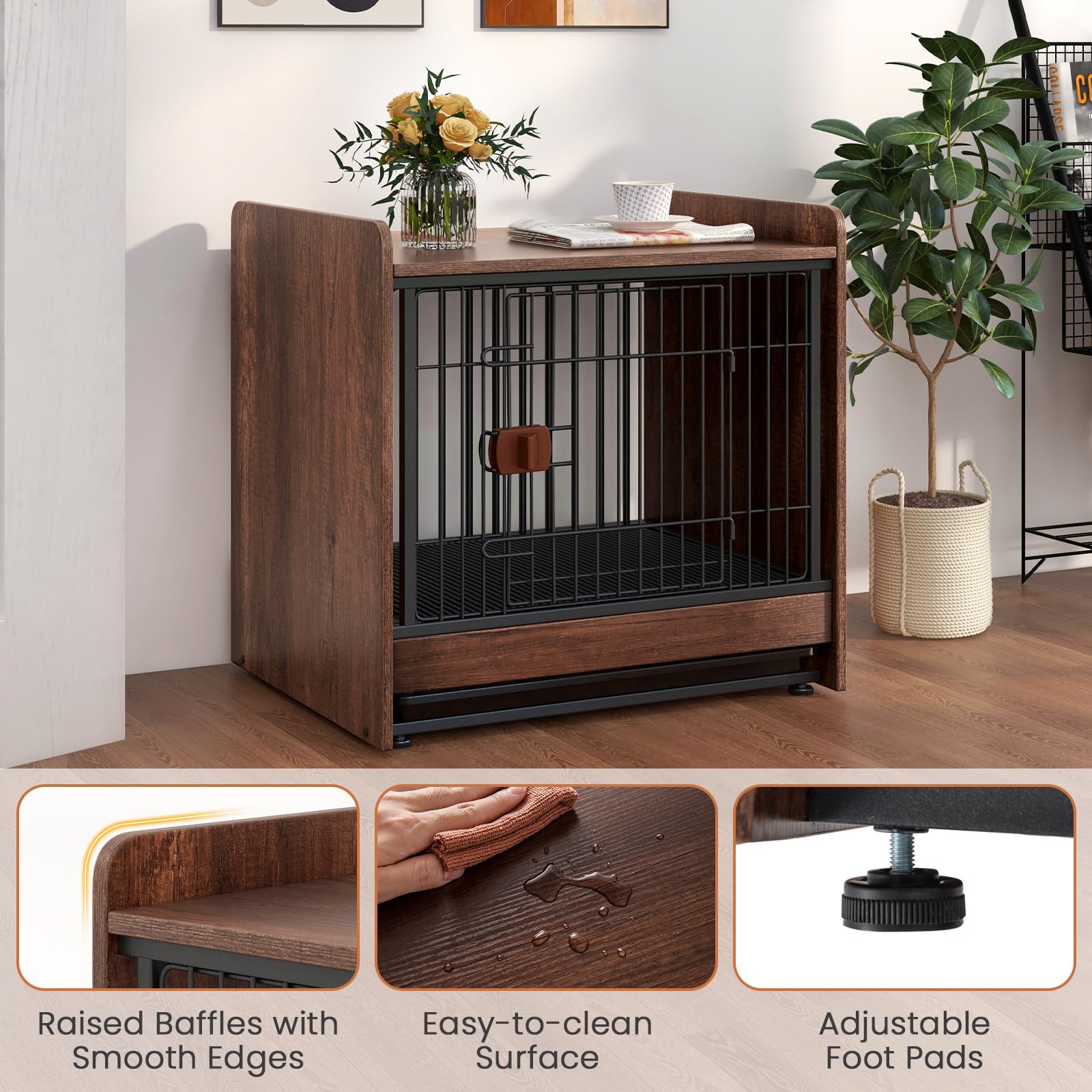The 2-in-1 dog crate with rustic brown finish will effortlessly merge with your room styles. Therefore, the pet house can double as a end table to showcase your decorations. With a removable tray to simplify the task of cleaning up fur and crumbs, your puppies can lye on a clean space. Moreover, the metal door with latch will prevent your dog from wandering off. Plus, the back wall of the small dog cage is reinforced with 0.4" thickened metal pipes, ensuring sturdy construction that resists wear and tear. Equipped with adjustable foot pads, the indoor pet house not only protects your flooring but also adapts to uneven surfaces. The easy-to-clean surface requires only a gentle wipe, making it hassle-free to keep your pet's area fresh.