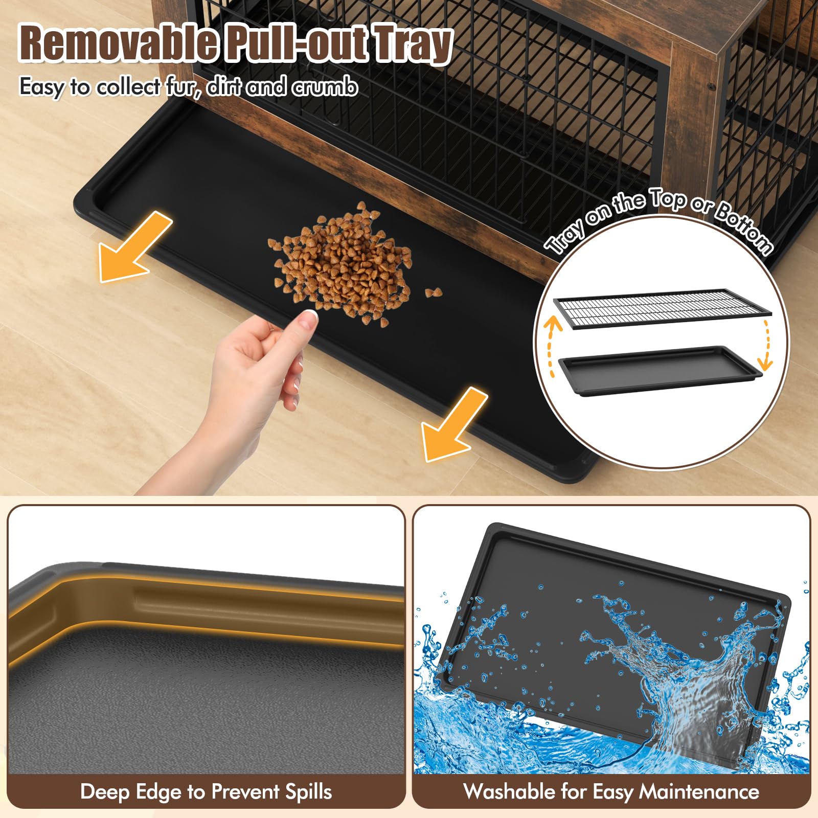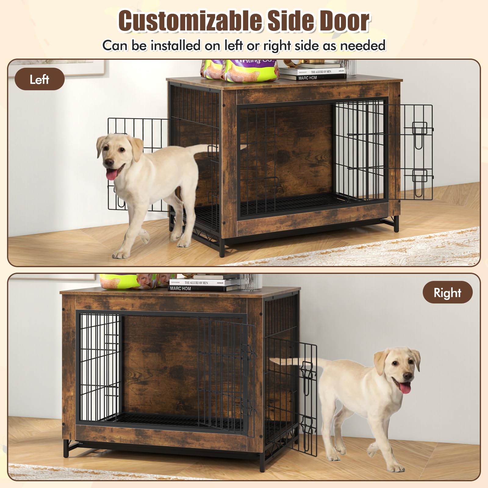 Our dog crate serves a dual purpose, seamlessly transitioning from a safe and secure space for your furry friend to a stylish end table for your living space. With a removable pull-out tray, it is easy to collect fur, dirt and crumb. Moreover, the bottom grid panel is removable, allowing you to install the tray on the top or bottom as needed. Plus, the front door and side doors boast double latches for improved safety. With a customizable side door that can be installed on either the left or right side, this dog cage offers flexibility to suit your spaces. Coming with 3-sided chew-proof metal mesh wall, the industrial dog kennel can resist the damage of your puppies. Additionally, thanks to adjustable foot pads, the decorative pet crate house can remain stable any grounds.