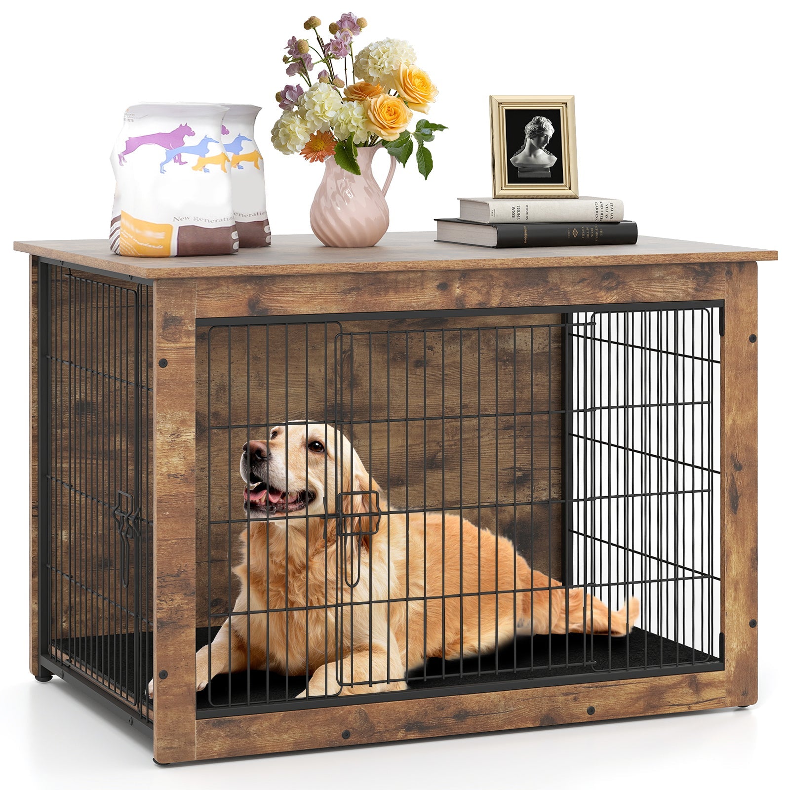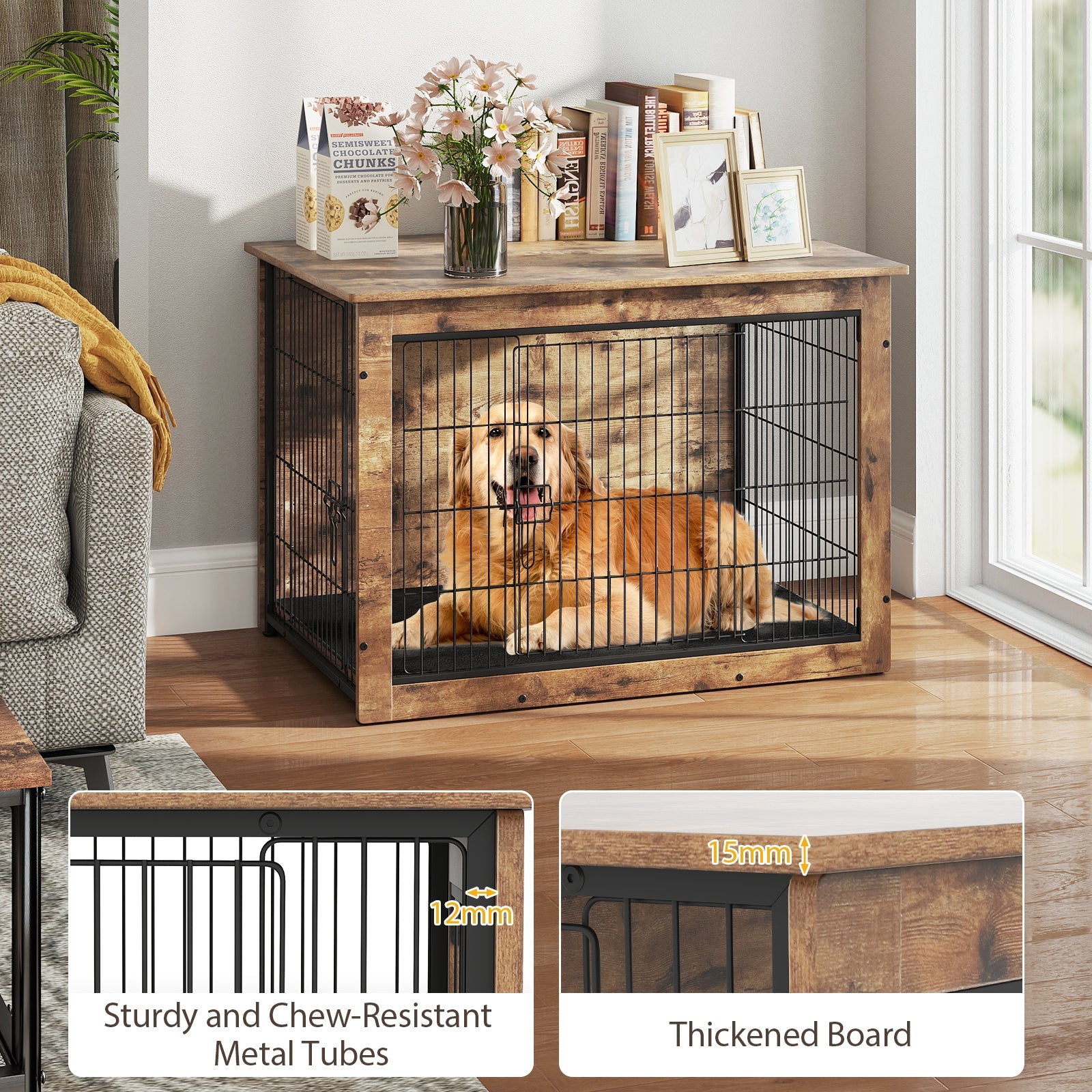 Upgrade your pet's space with this modern dog crate furniture, blending functionality and style. Crafted with a chew-resistant metal frame and a waterproof veneered board, this indoor dog kennel ensures lasting durability and sturdiness. The spacious interior, paired with a soft, washable mat, offers ultimate comfort for your furry friend. Double doors with secure latches provide easy access, while the customizable side door adapts to your layout. Perfect for small to medium dogs, this wooden dog crate also doubles as a chic side table, ideal for displaying decor. Enhance your space with this versatile and stylish addition your pet will love!