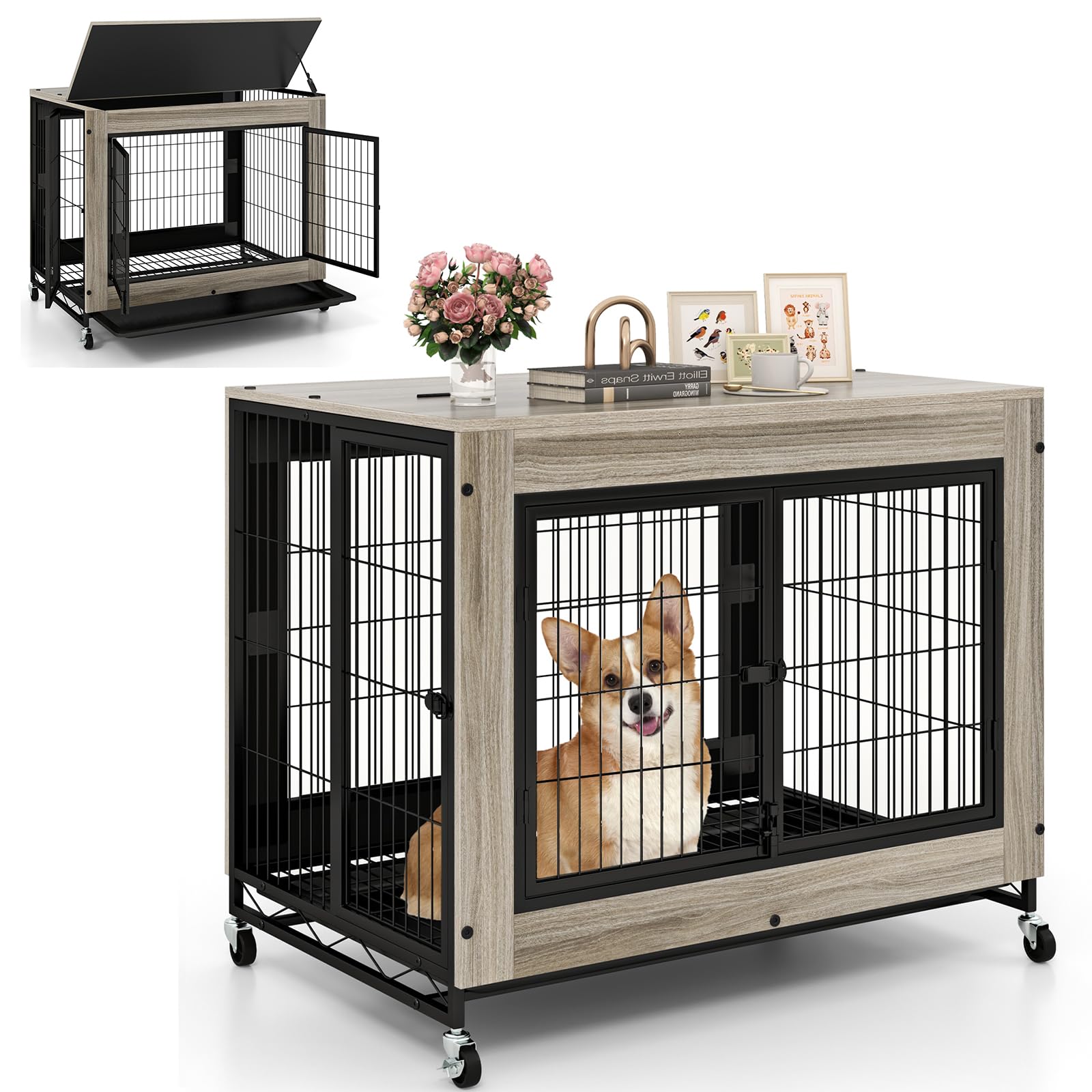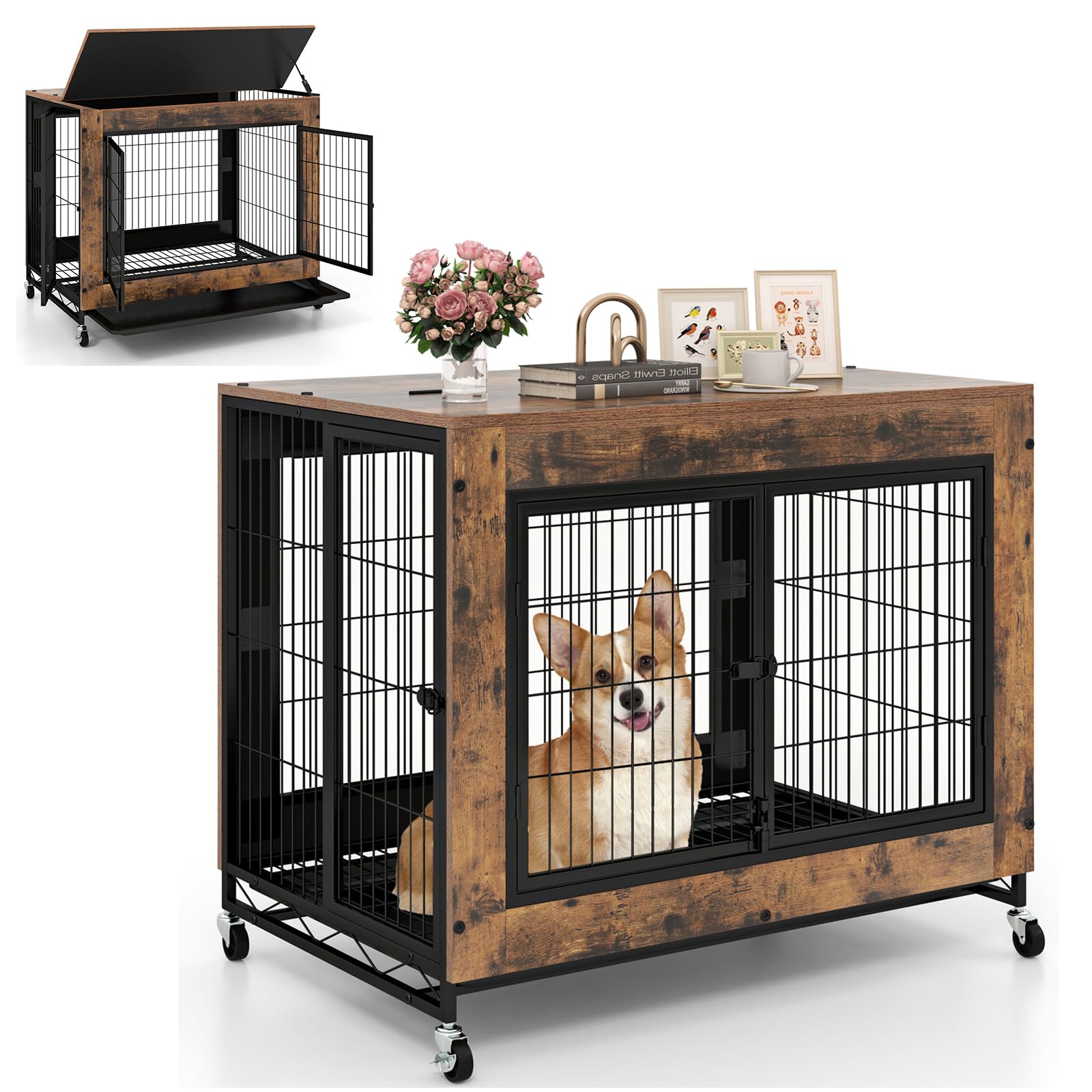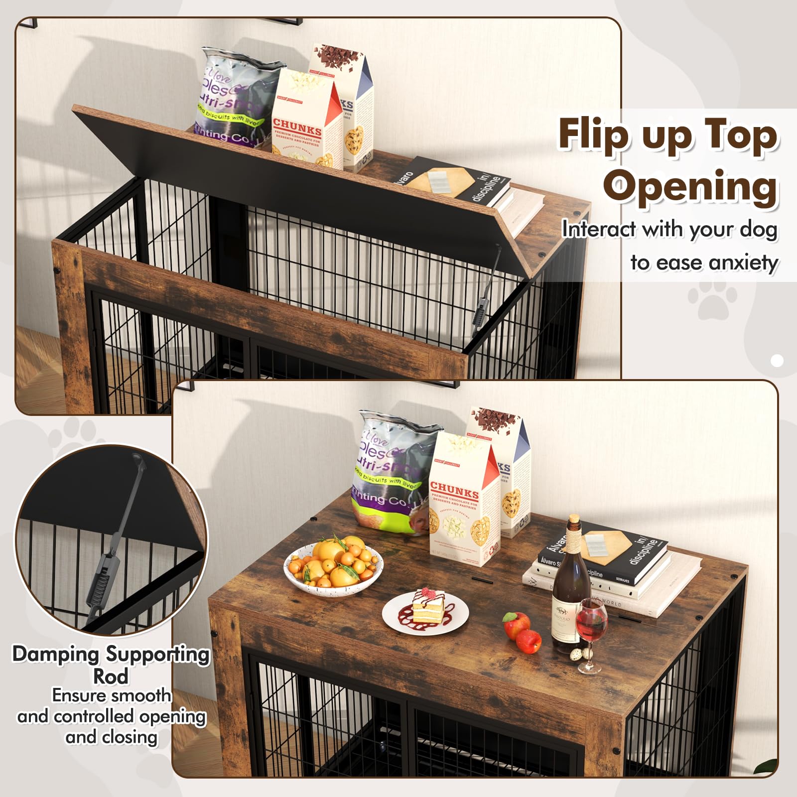 Our multifunctional dog crate furniture serves as a comfy dog crate or a handy end table, which is designed to flawlessly integrate into any room. It measures 38" x 25" x 30.5" (L x W x H), providing ample resting space for small, medium, or large dogs. Constructed with chew-resistant metal tubes and premium MDF board, the crate provides a safe and secure environment for your pet while standing up to daily wear and tear. For easy access, it is equipped with double front doors and a side door, all secured with robust locks, making it convenient for your dog to get in and out from both directions. The innovative flip-up top opening, supported by damping rods, ensures smooth and controlled operation, enhancing the bond between you and your furry friend. Moreover, it boasts 4 universal wheels and 2 lockable, thus you can effortlessly move it from room to room. Thanks to its pull-out tray and waterproof surfaces, cleanup is also a breeze!