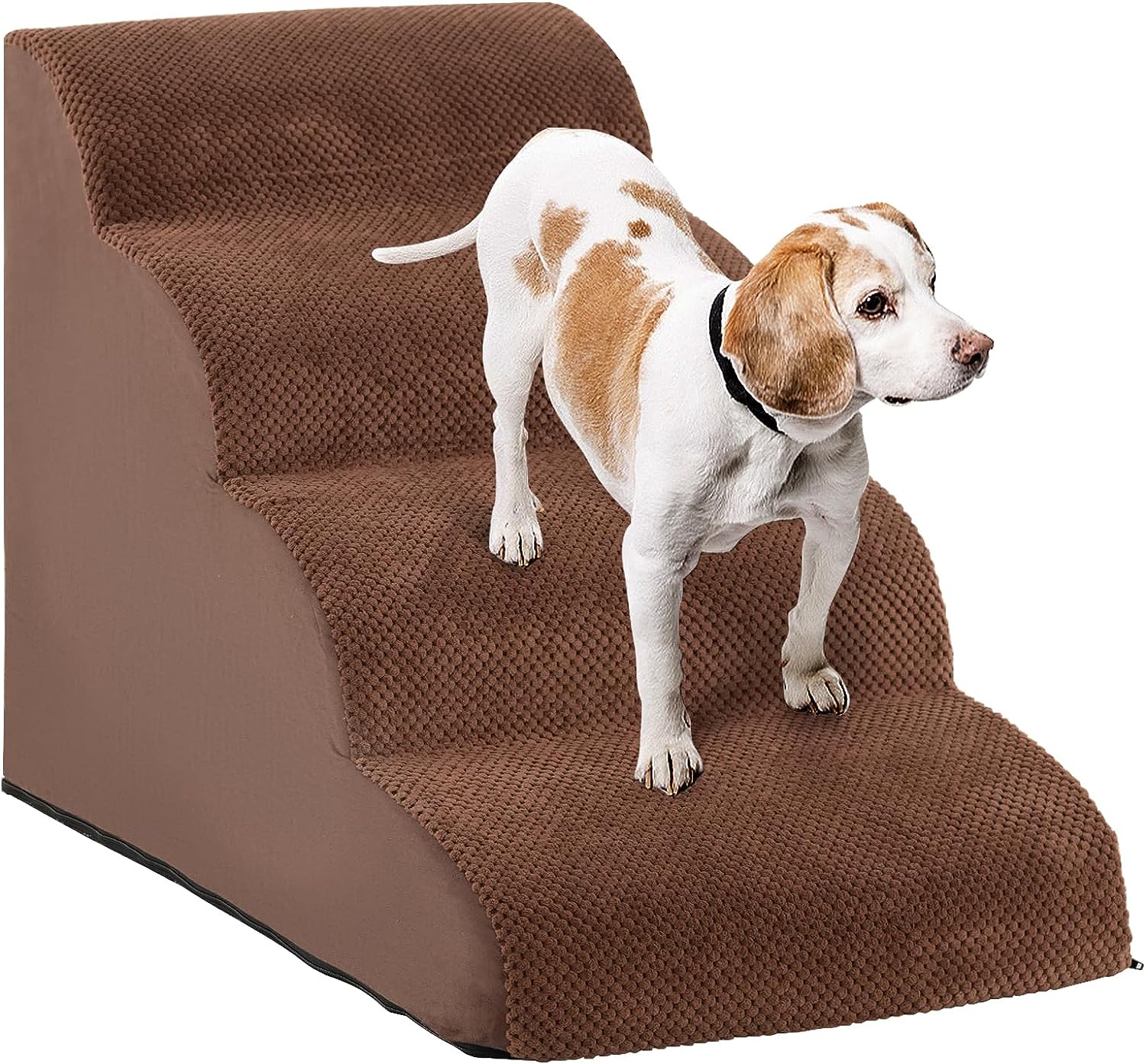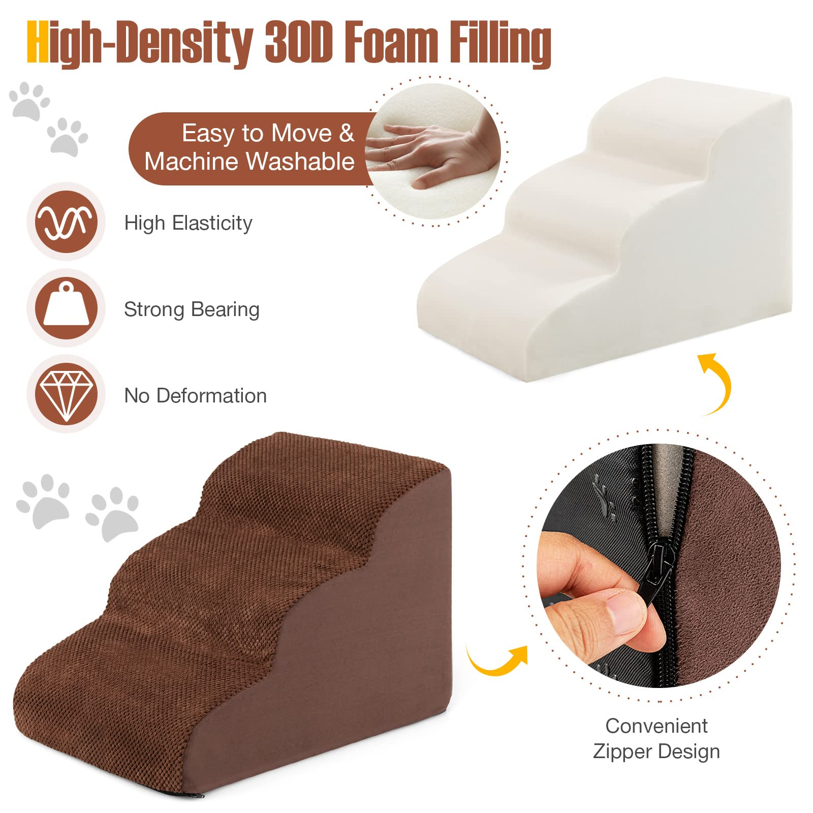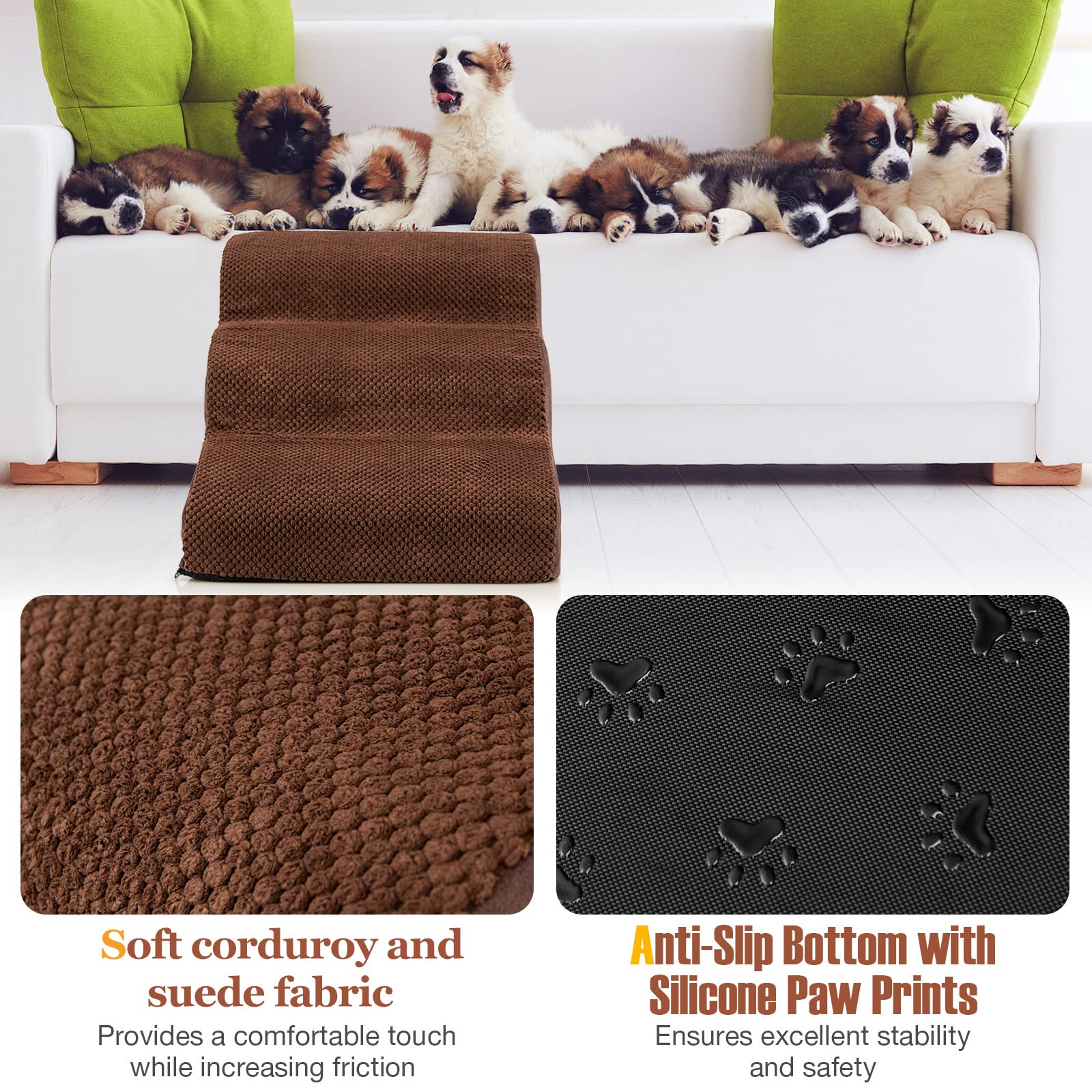Our 3-tier foam dog ramp measures 23'' x 16.5'' x 15.5'' (L x W x H) and loads up to 66 lbs, which is suitable for short-legged dogs or pets who suffer from arthritis, joint stiffness, or other mobility impairments, allowing them to climb up or go down the bed, sofa, or stool at will. The pet stairs ladder is filled with thick foam with high resilience and strong support, which is not easy to deform. And it is covered by premium corduroy and suede fabric to improve friction, so the pet would not slip when moving on it. Moreover, the bottom cloth with silicone paw prints can also add friction to prevent the ramp from moving, ensuring safety during use. The ramp’s cover is equipped with zippers that allow you to detach the cover for cleaning, and it is machine washable.