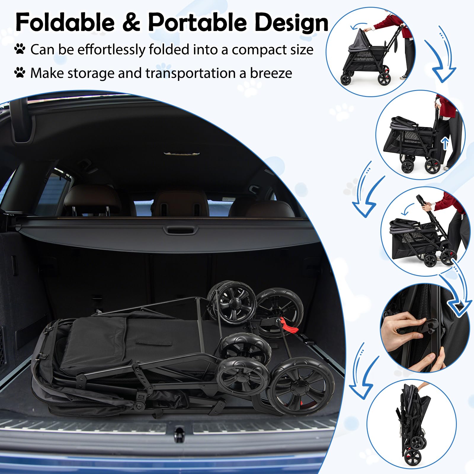 - [Quick and Easy Folding]: The stroller features a one-click folding mechanism—just lift the handles on both sides to flatten it down and secure it with locking buckles. This space-saving design makes storage and transport a breeze, perfect for busy pet parents on the move.