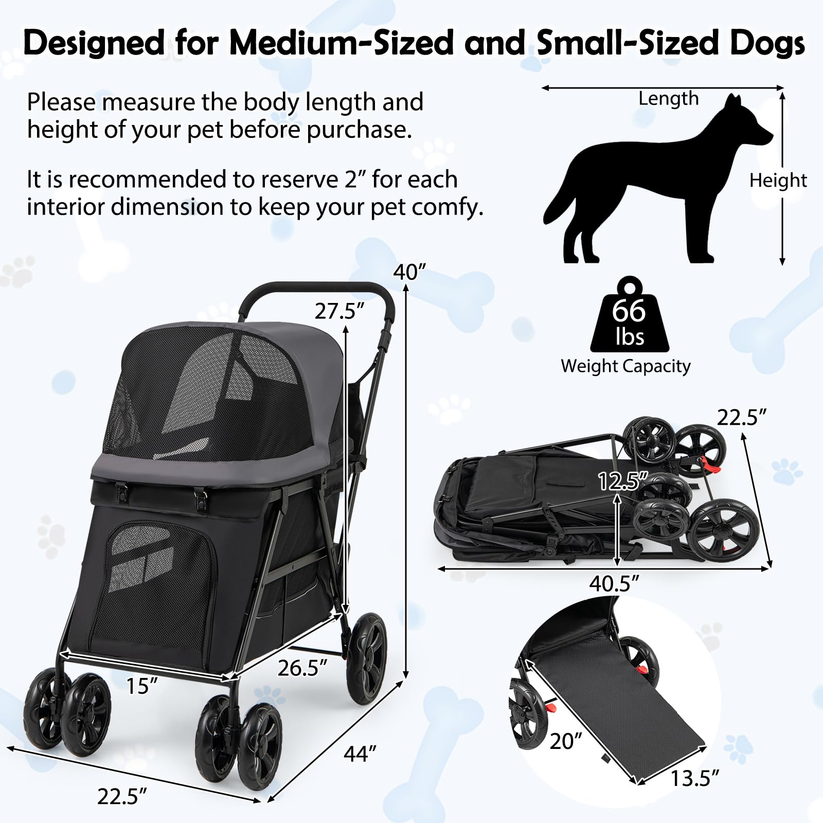 This thoughtfully designed dog stroller provides a cozy and secure travel solution for medium and small-sized pets, especially those with limited mobility. With dimensions of 44'' x 22.5'' x 40'' and a weight capacity of 66 lbs, it features a low-entry design and a detachable back door ramp for stress-free entry and exit.