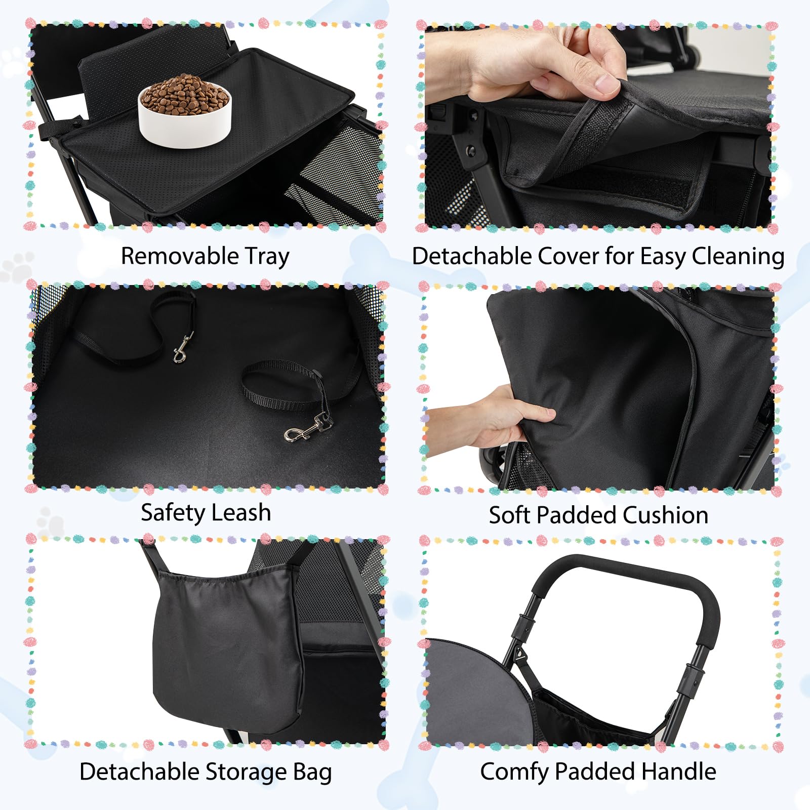 - [Thoughtful Features for Convenience and Comfort]: This folding dog stroller is packed with user-friendly extras: a removable snack tray, a detachable storage bag for pet essentials, a padded handle for comfortable pushing, a soft interior cushion for your pet’s relaxation, and a safety leash to keep them secure.