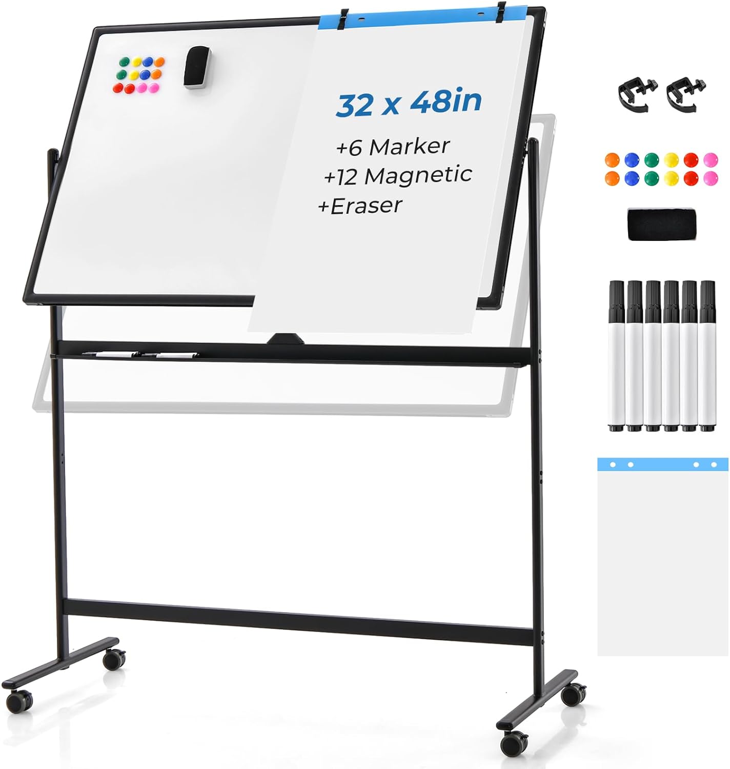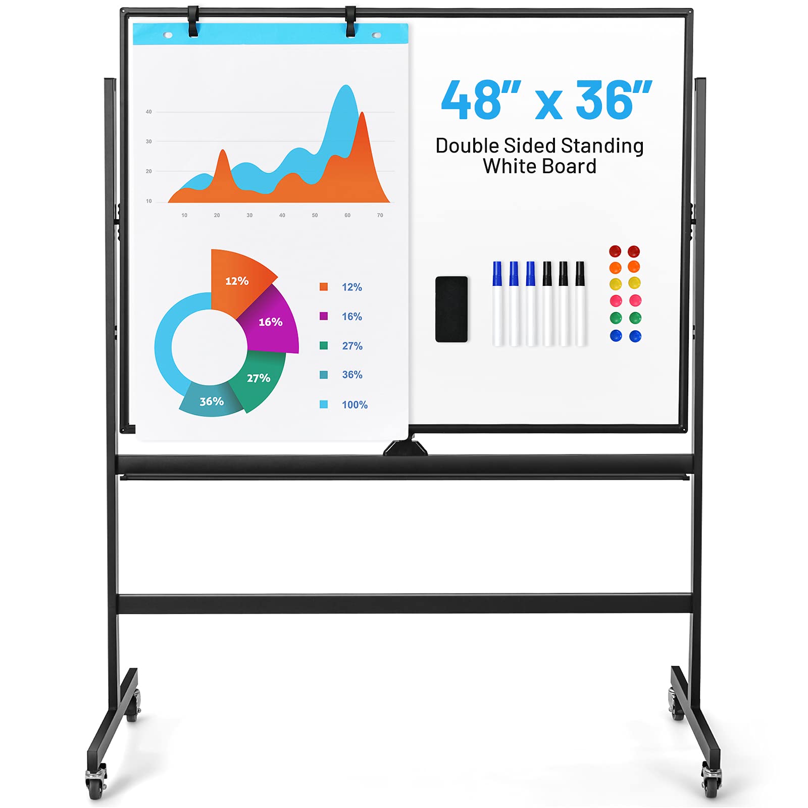 - 360° Double-Sided Whiteboard with Flip & Lock System: This reversible mobile whiteboard comes with 2 writing boards and a button that allows the board to be rotated and locked in place when you write. Flip the magnetic double-sided whiteboard with the ease of your hands and continue to write down your thoughts on the other side. Great help for making your presentation, teaching, or training more efficient and orderly.