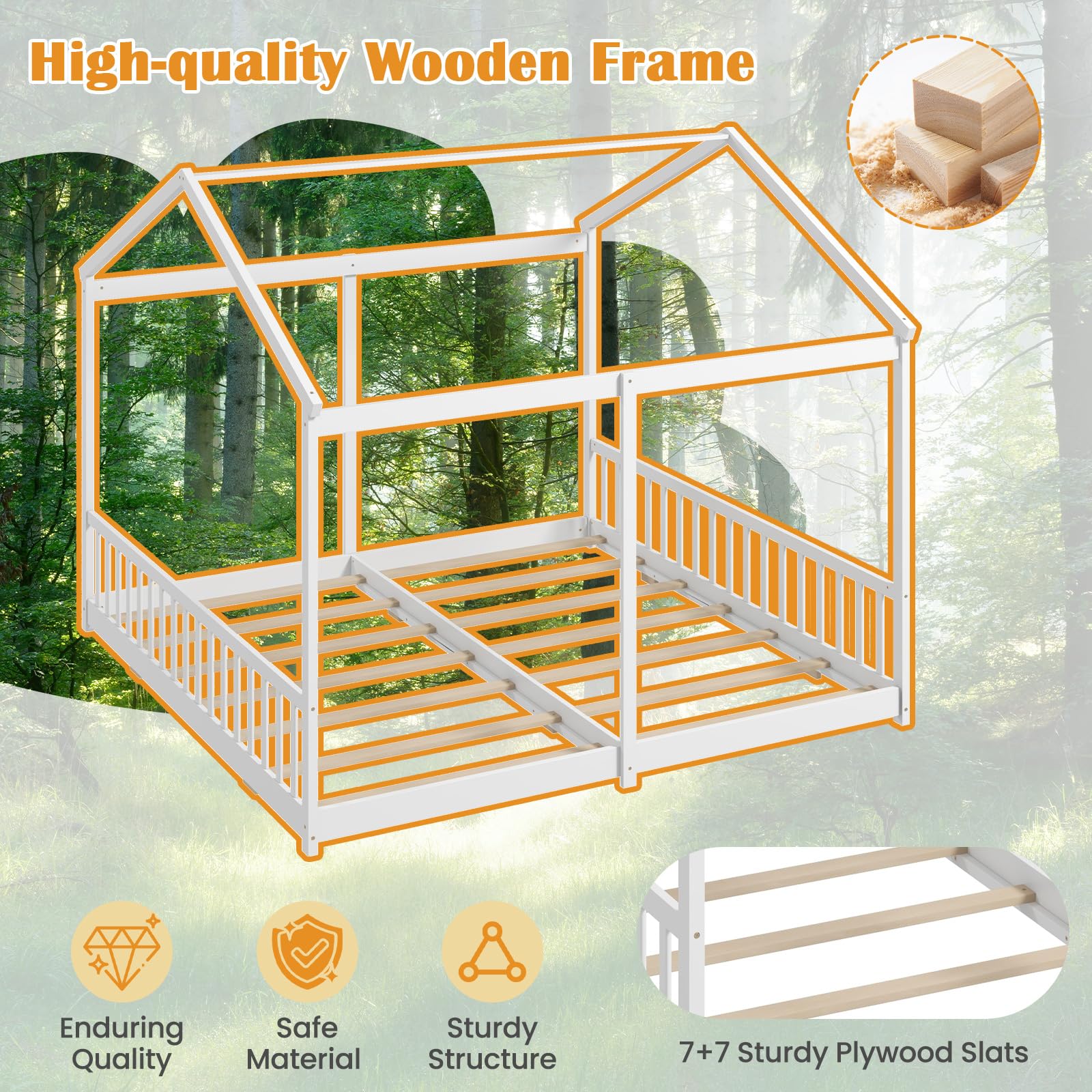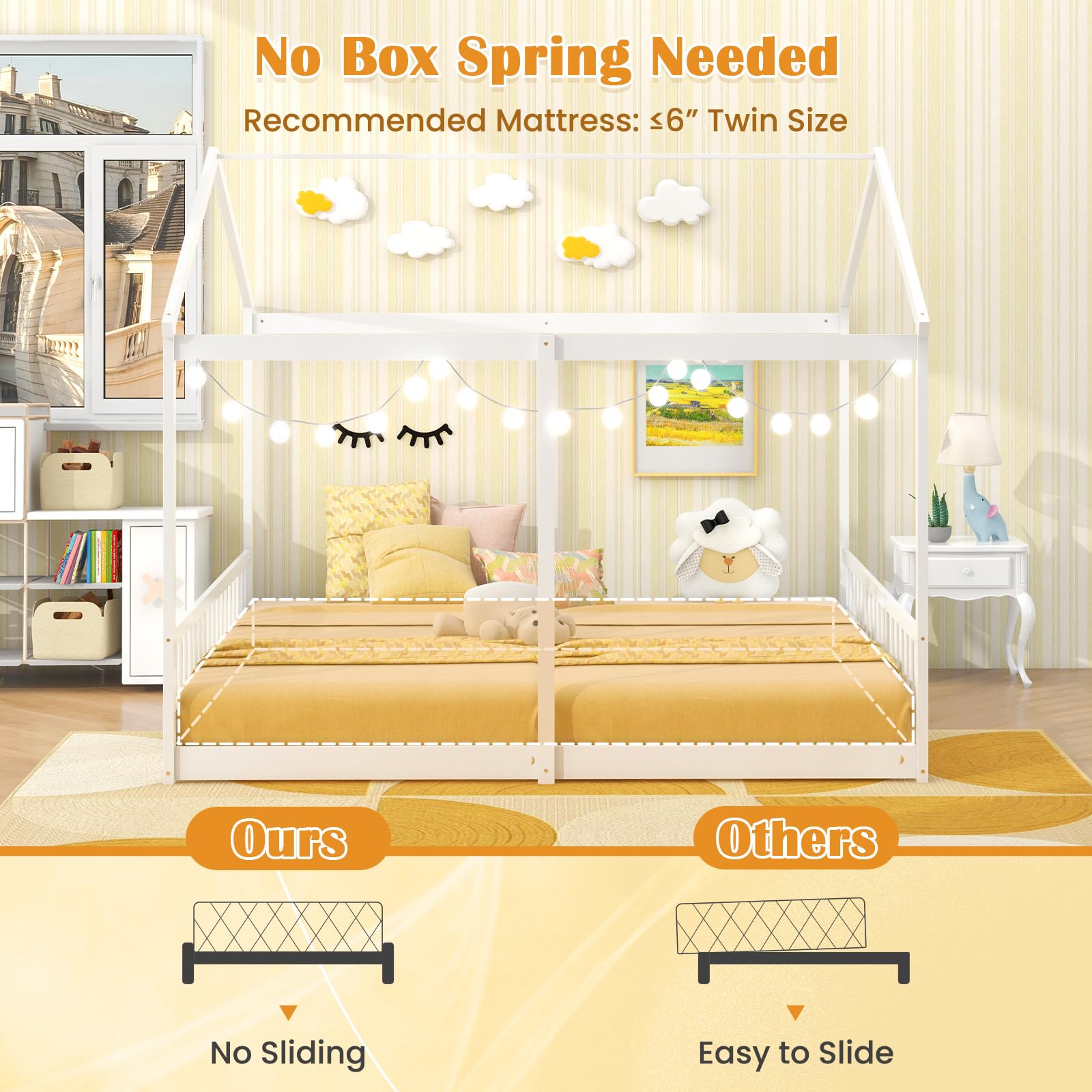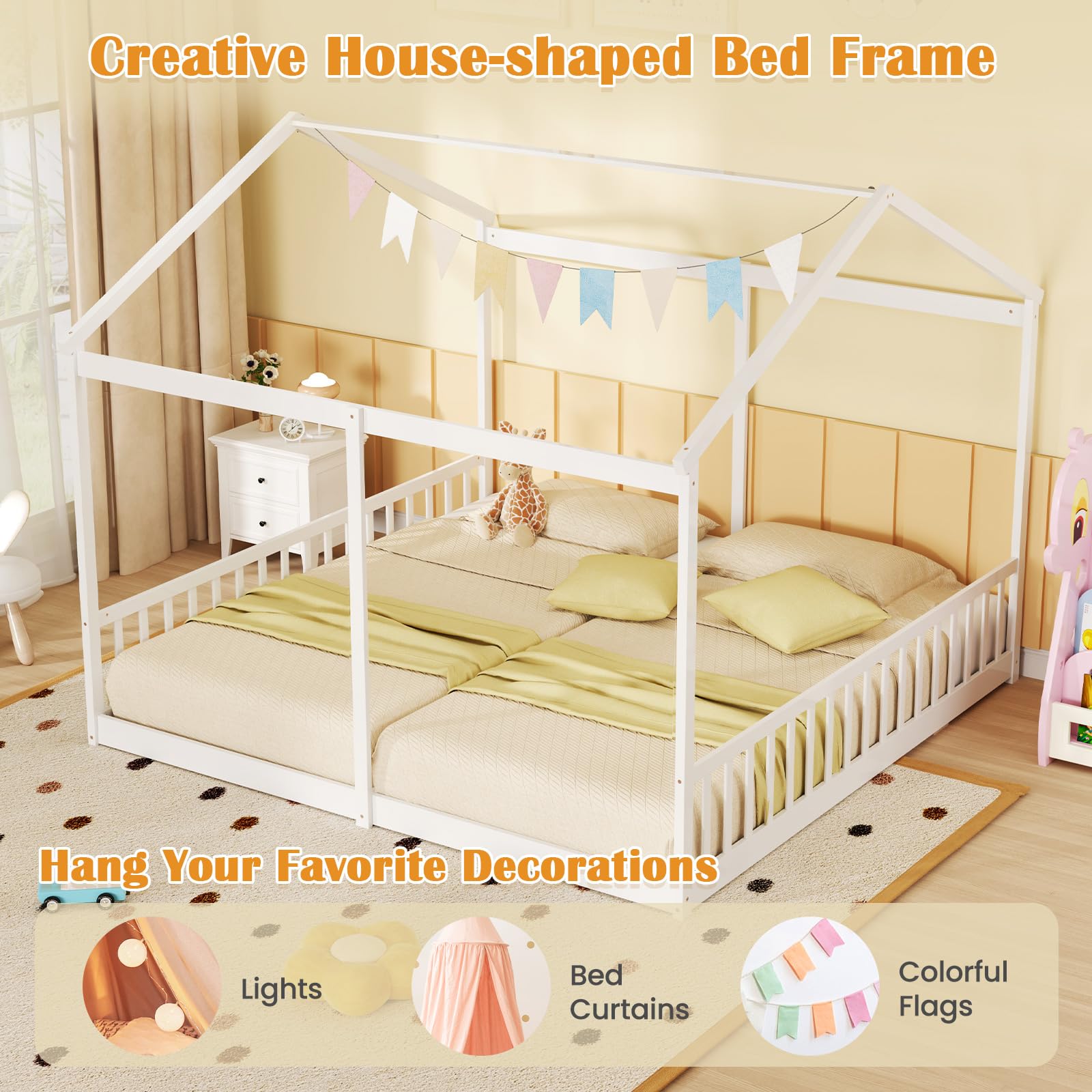 Excite your children’s bedtime with this enchanting double twin kids bed, the perfect centerpiece for any playful, imaginative bedroom! It’s a space for dreams, featuring a delightful house-shaped frame where your kids can hang decorations and make it their own personal haven. Ideal for siblings or twins, this spacious bed promotes togetherness while providing safe, individual sleeping spots with 17" safety guardrails ideal for the little rollers! Crafted with a sturdy wooden construction and roomy enough to skip the box springs, it’s built to withstand lively play and provide restful sleep. Transform their room into a magical space where dreams come alive with this charming, durable bed!
