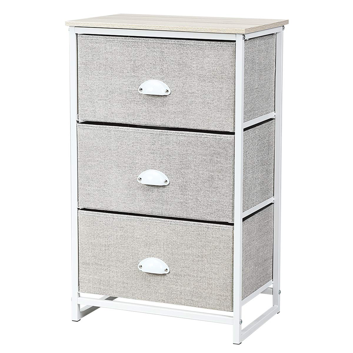 • Stylish and Chic Design: A perfect mix of white frame and beige grey drawers adds unique attraction to your room. Spacious table top with natural wood grain is not only suitable for place lamps, books, but brings a warm touch. More use-friendly mental handles is a gorgeous and practical combination.
