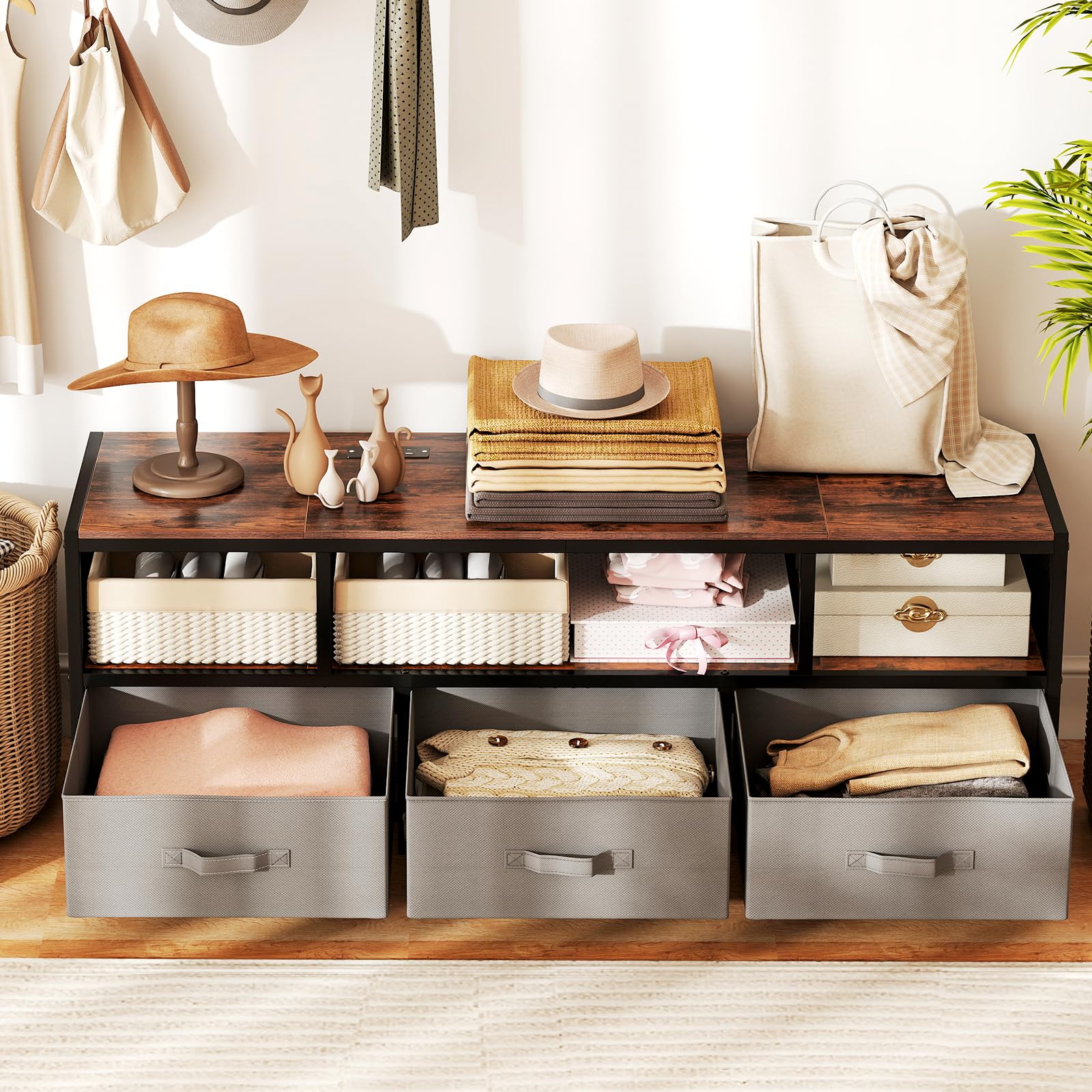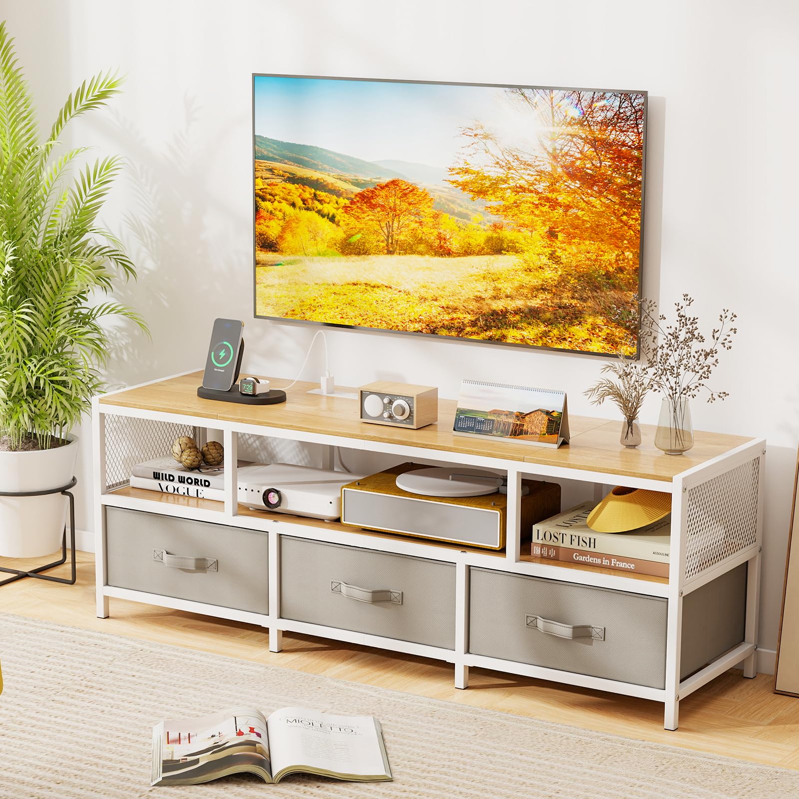 The TV stand is equipped with a built-in charging station for keeping devices powered up. This sleek and reliable piece features a sturdy metal frame capable of supporting up to 175 lbs, ensuring the stability of your valuable electronics. With ample storage space including a large top surface, open shelf, and 3 fabric drawers, this media console table perfectly accommodates your TVs up to 65" and helps you organize DVDs, game consoles, headphones, remote controls, magazines, photos, and more. As needed, the entertainment center can work as a display stand or storage shelf. In addition, its versatile design seamlessly fits into any decoration and its smooth surface makes for easy maintenance.