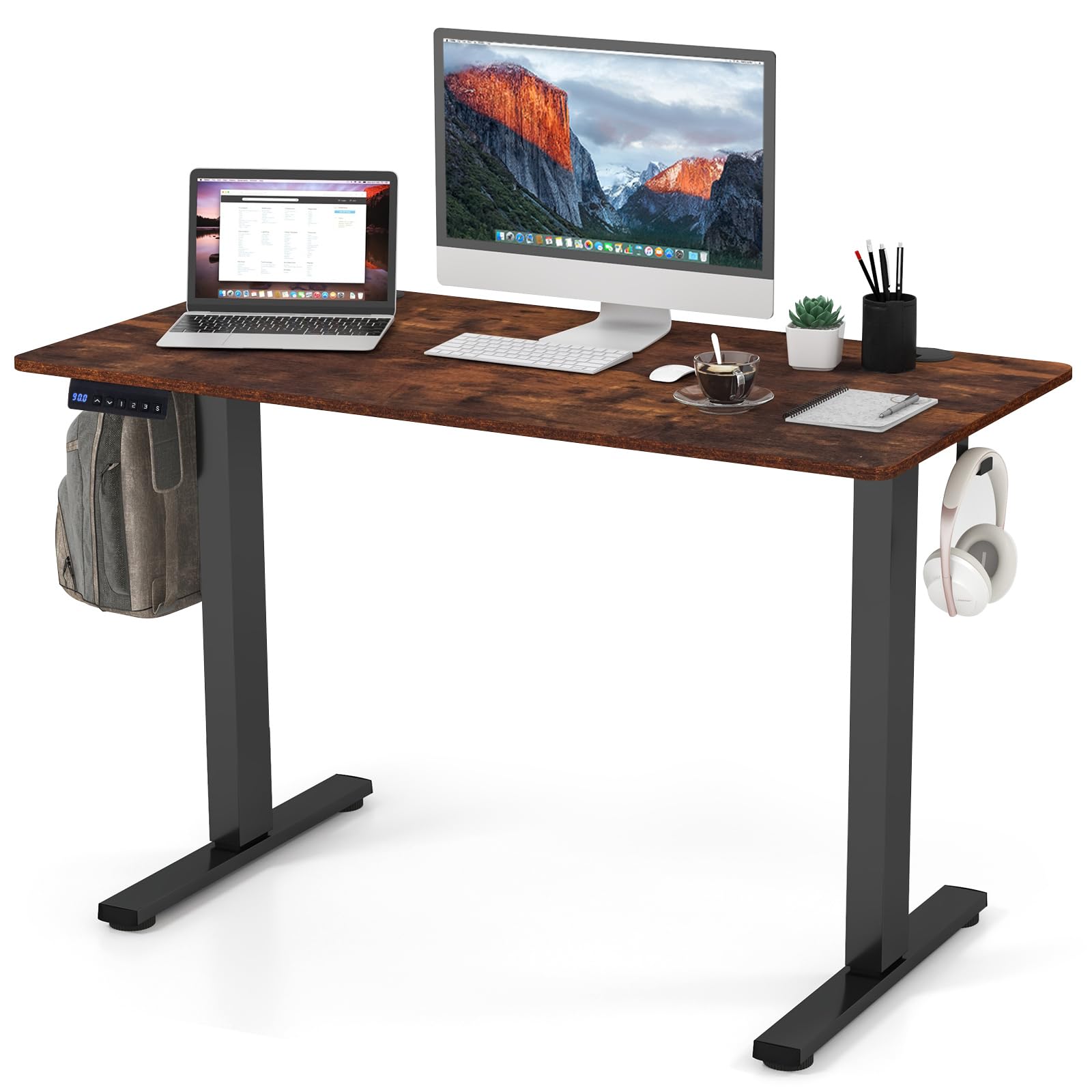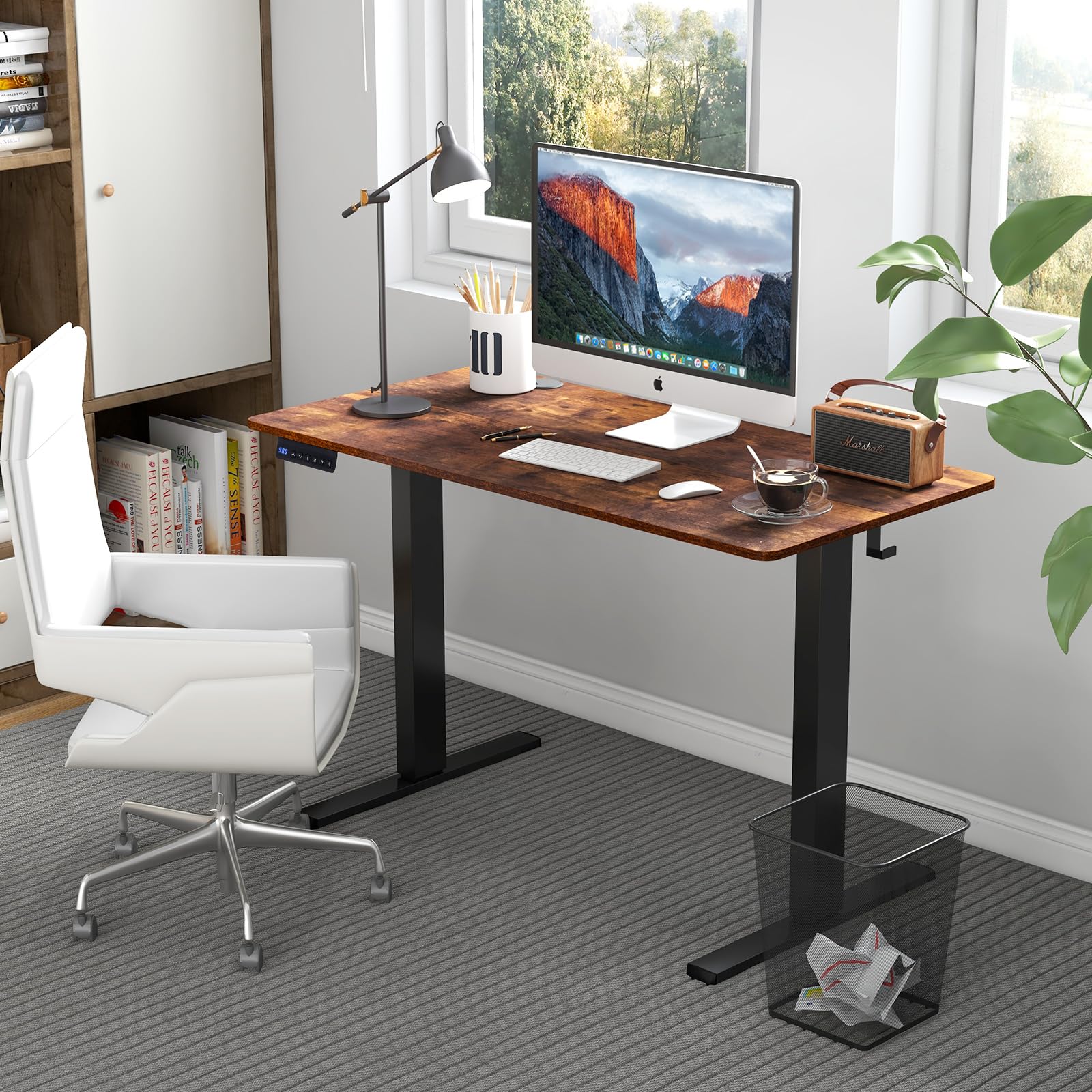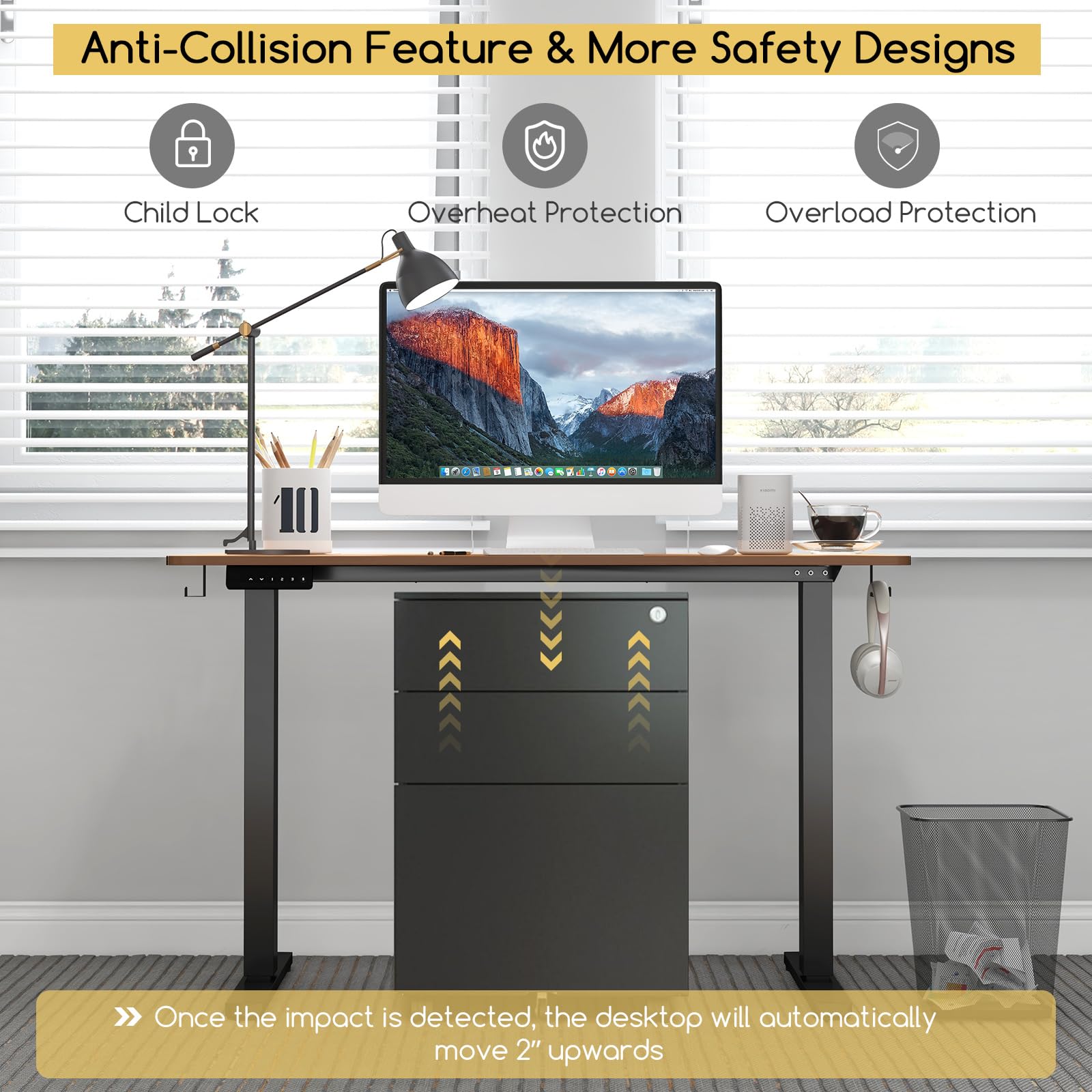 Elevate your workspace with a standing desk that adapts to your daily flow. This sit stand desk is mounted on a sturdy metal frame with adjustable foot pads and allows for height adjustments from 28.7” to 48”. With a strong motor, it can confidently bear a load of up to 176 lbs and satisfies different needs. The expansive 48”L x 24”W desktop is roomy for working, while having other user-friendly details to avoid chaos, including the smart cable management solutions and handy side hooks. Command your computer desk’s elevation with the intuitive control panel, complete with 3 present height levels and an LED display for exact positioning. Safety is paramount, with an anti-collision feature and more safety designs, like child lock, overheat protection, and overload protection. More premium details await your discovery.