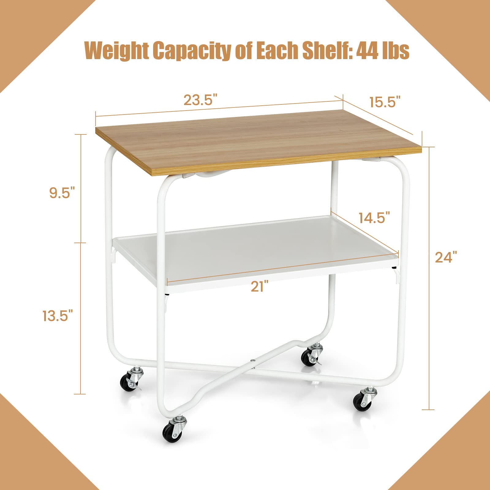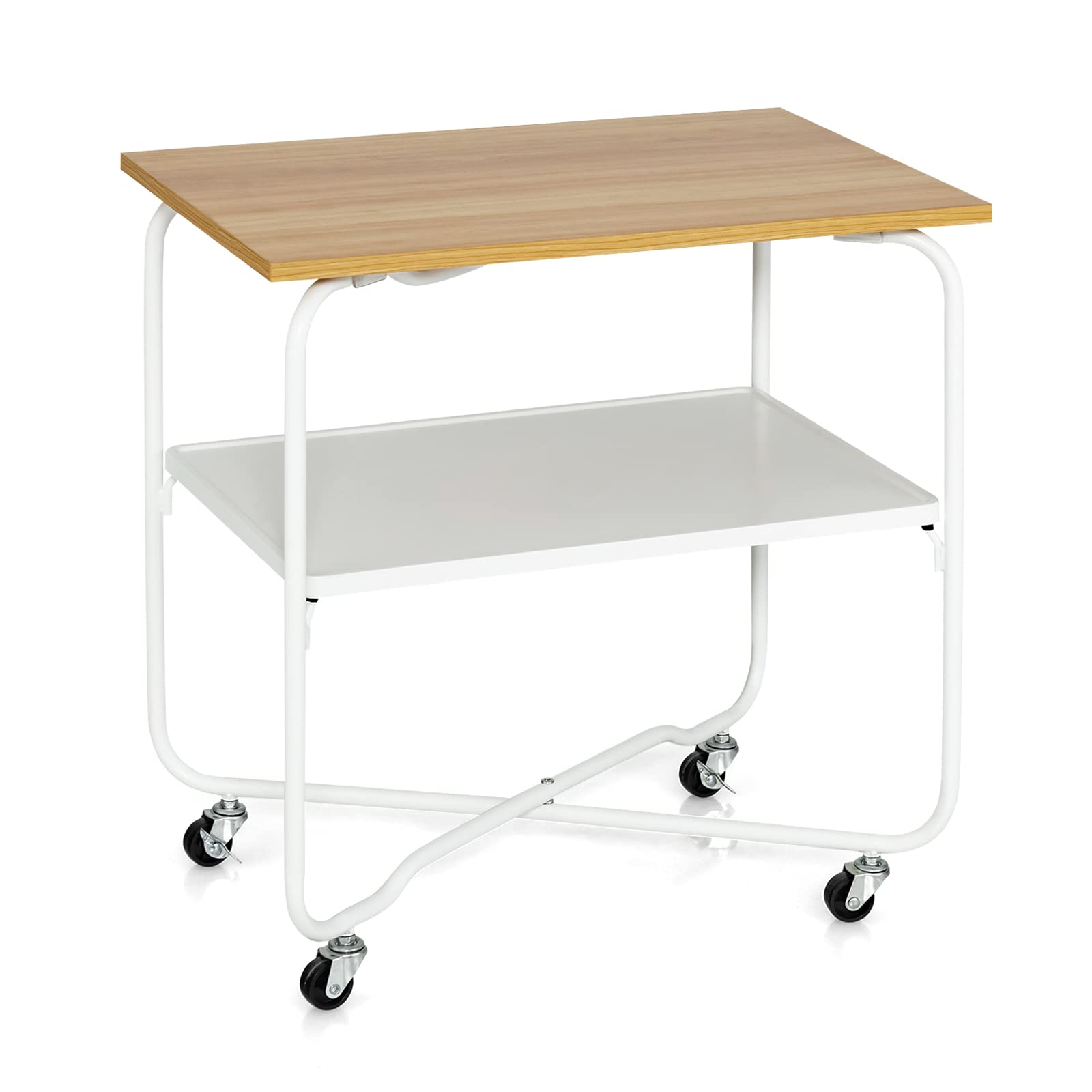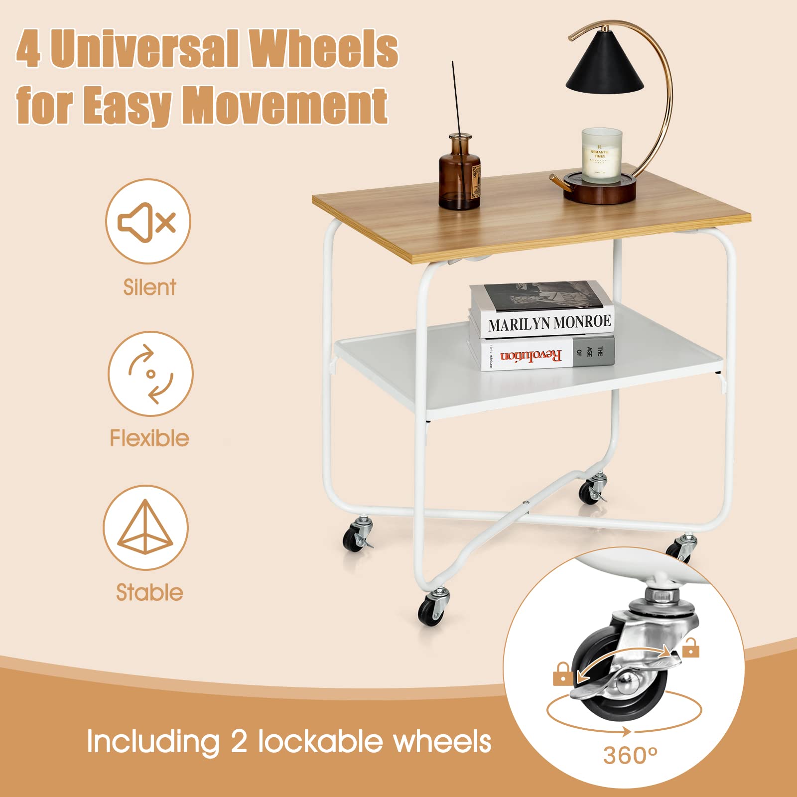 This 2-tier side table features a durable MDF top and a high-quality metal lower shelf and frame, which is sturdy and long-lasting. The 360° rotatable wheels allow you to move the cart anywhere, and 2 lockable casters make the cart not easy to wobble. It is hassle-free to install this rolling side table. You can easily assemble the shelves and wheels without any screws. The surface is also smooth and easy to clean when there are stains. This modern furniture is ideal to be used as a sofa side table, home bar coffee serving cart, nightstand, etc.