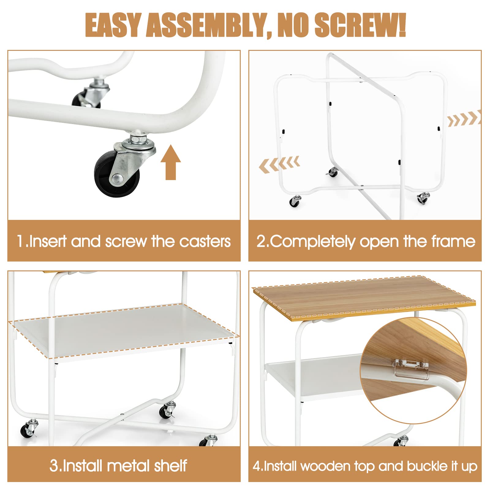 - [Assembly without Difficulty]: The entire assembly requires no screws. You just need to assemble the wheels, and then install the two shelves by aligning the grooves. When not in use, the foldable frame also enables you to easily disassemble and store the cart without taking up too much space.