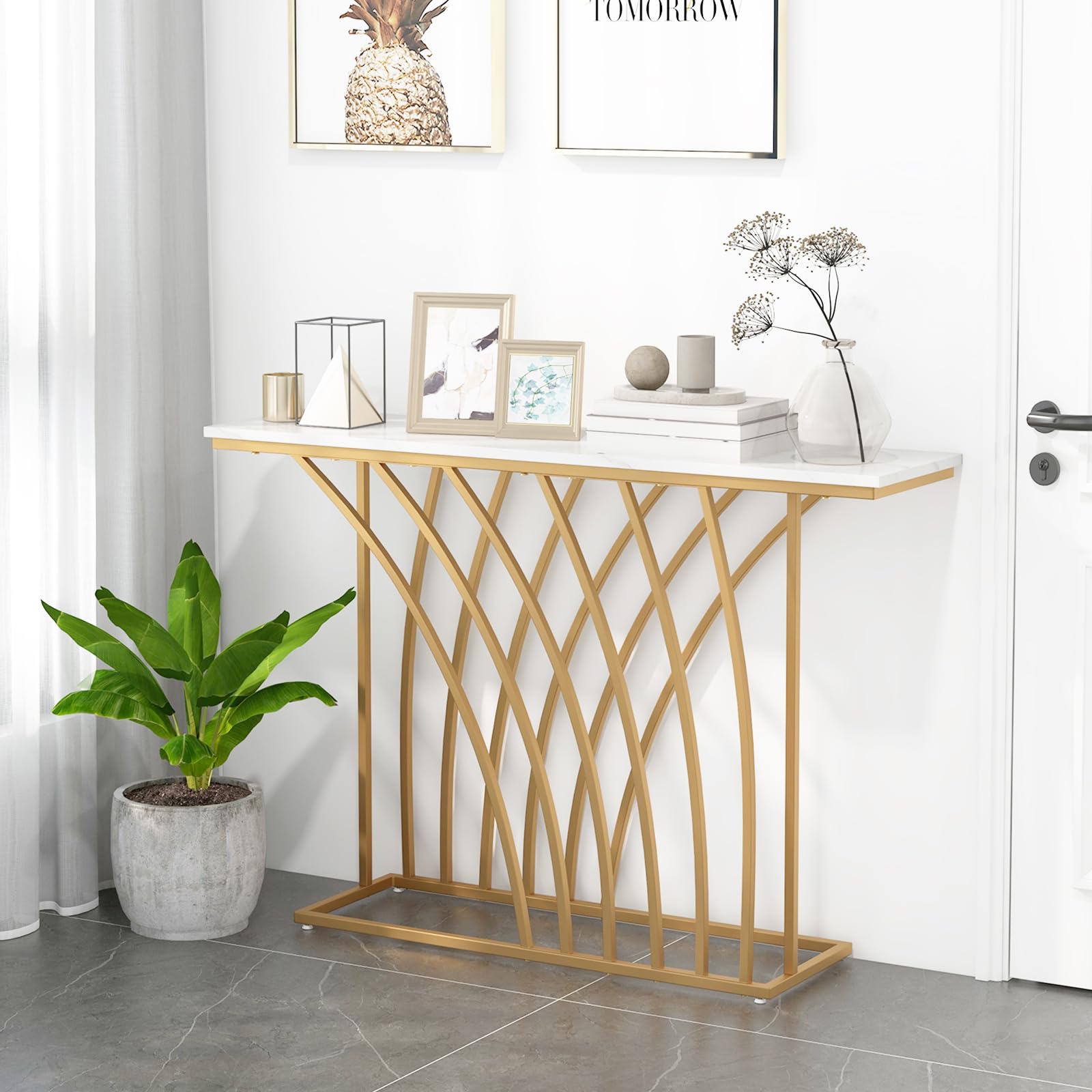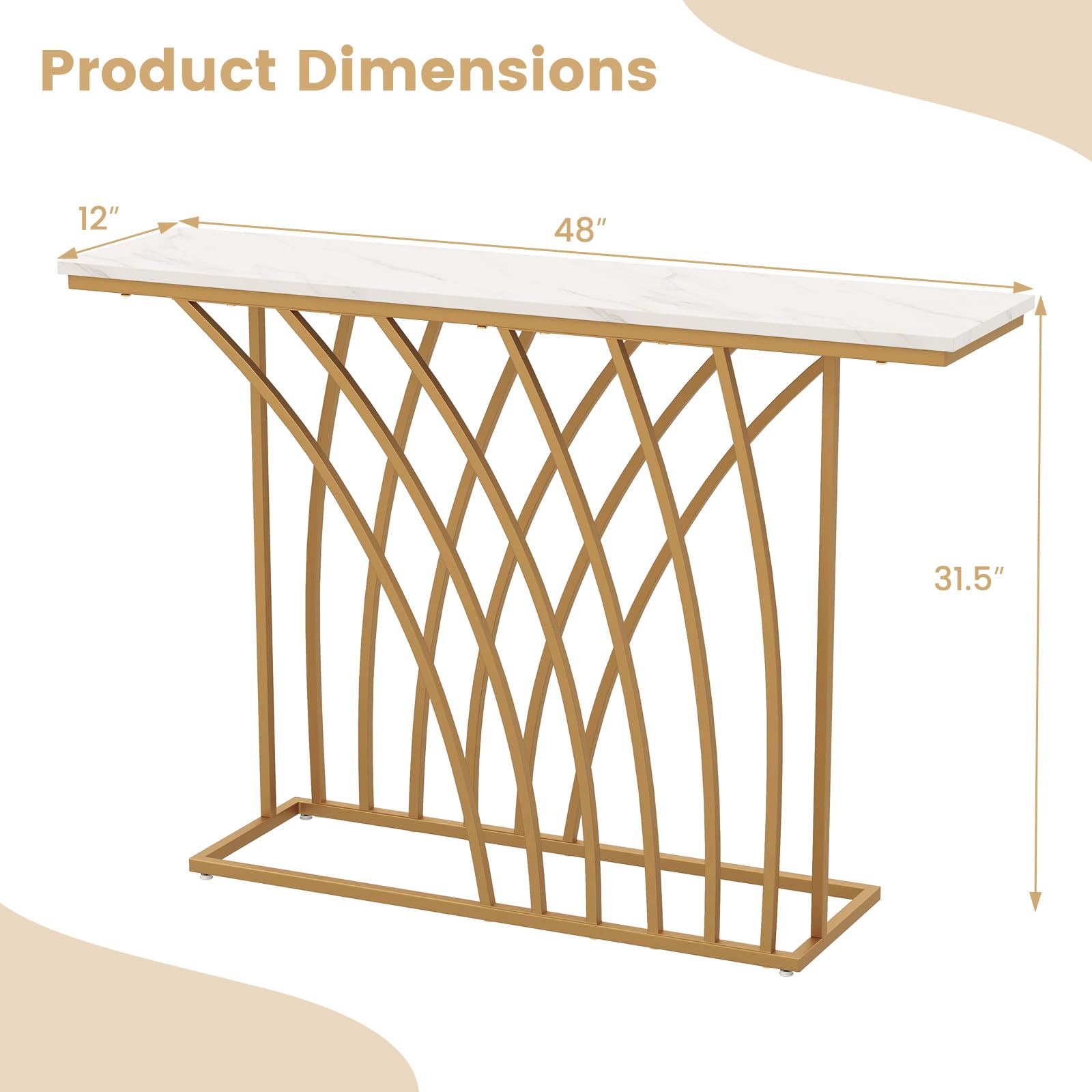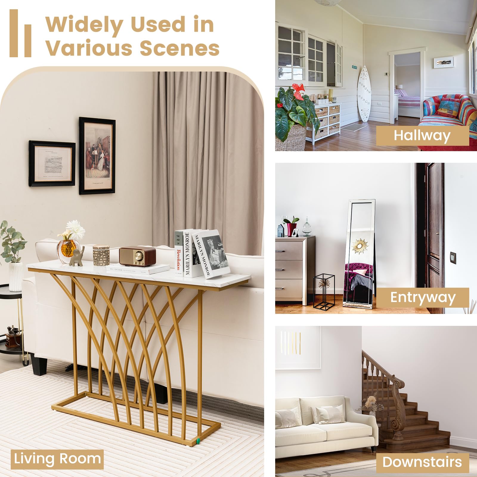 Enhance the sophistication of your home with our exquisite gold console table! With a spacious 48"x12" tabletop, this console table provides ample space to organize and display various items. Its strong metallic frame and faux marble board not only ensure durability but also add a touch of elegance to any room. Furthermore, we have incorporated an anti-tipping device and non-slip foot pads, making this entryway table safe and stable for your peace of mind. This versatile gold entry table can be used as an entry table for your hallway, a stylish couch table for your living room or bedroom, or even a modern storage bookshelf for your home office.
