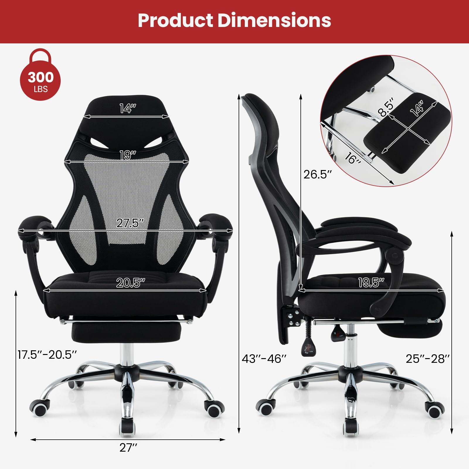 Product Dimensions: 27.5” x 27” x 43”-46” (L x W x H)