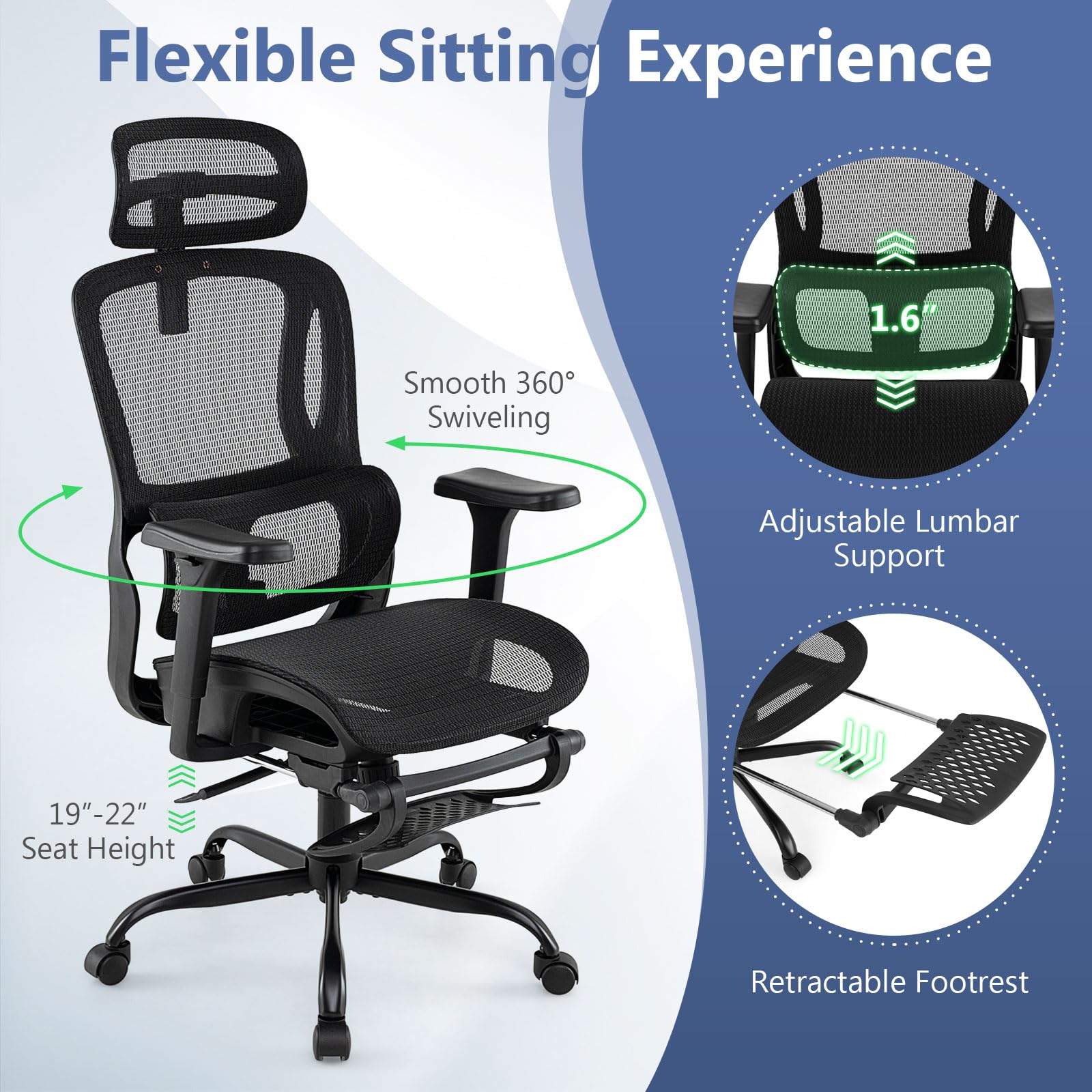 Enjoy the flexible sitting experience. Find the perfect support for your neck and head using the adjustable headrest that provides 45° rotation and 3.5" vertical adjustment. The 3D armrests are 360° rotating, 2.8" vertically adjustable, and 2.6" horizontally adjustable. Lock the rocking backrest at 90°, 115°, and 135° angles to comfortably work or relax, while the adjustable lumbar support and retractable footrest enhance ergonomic support. With an SGS gas rod, the computer desk chair ensures smooth height adjustment. Supported by a 5-claw metal base, the office chair can hold up to 330 lbs. The adjustable swivel design is perfect for people of different heights and makes it convenient to chat with colleagues. Made with breathable, tear-proof mesh fabric, this versatile chair is ideal for working, gaming, studying, or relaxing at home. The included universal wheels also make multi-scene use a breeze. More well-made details await your discovery.
