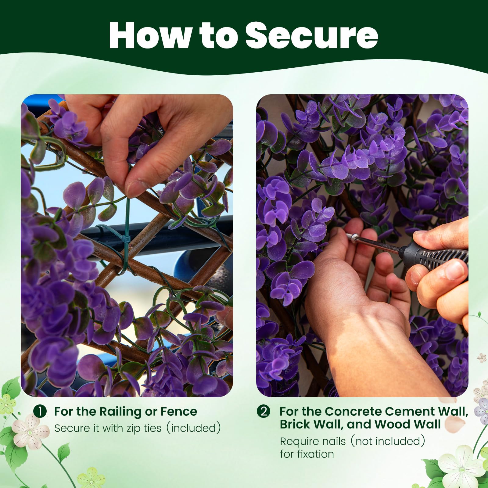 - 【2 Ways to Secure】: Each set includes 10 zip ties for a secure attachment of the expandable fence privacy screen to railings or fences. Additionally, you can choose to hang the greenery on walls using nails (not included) according to actual needs.