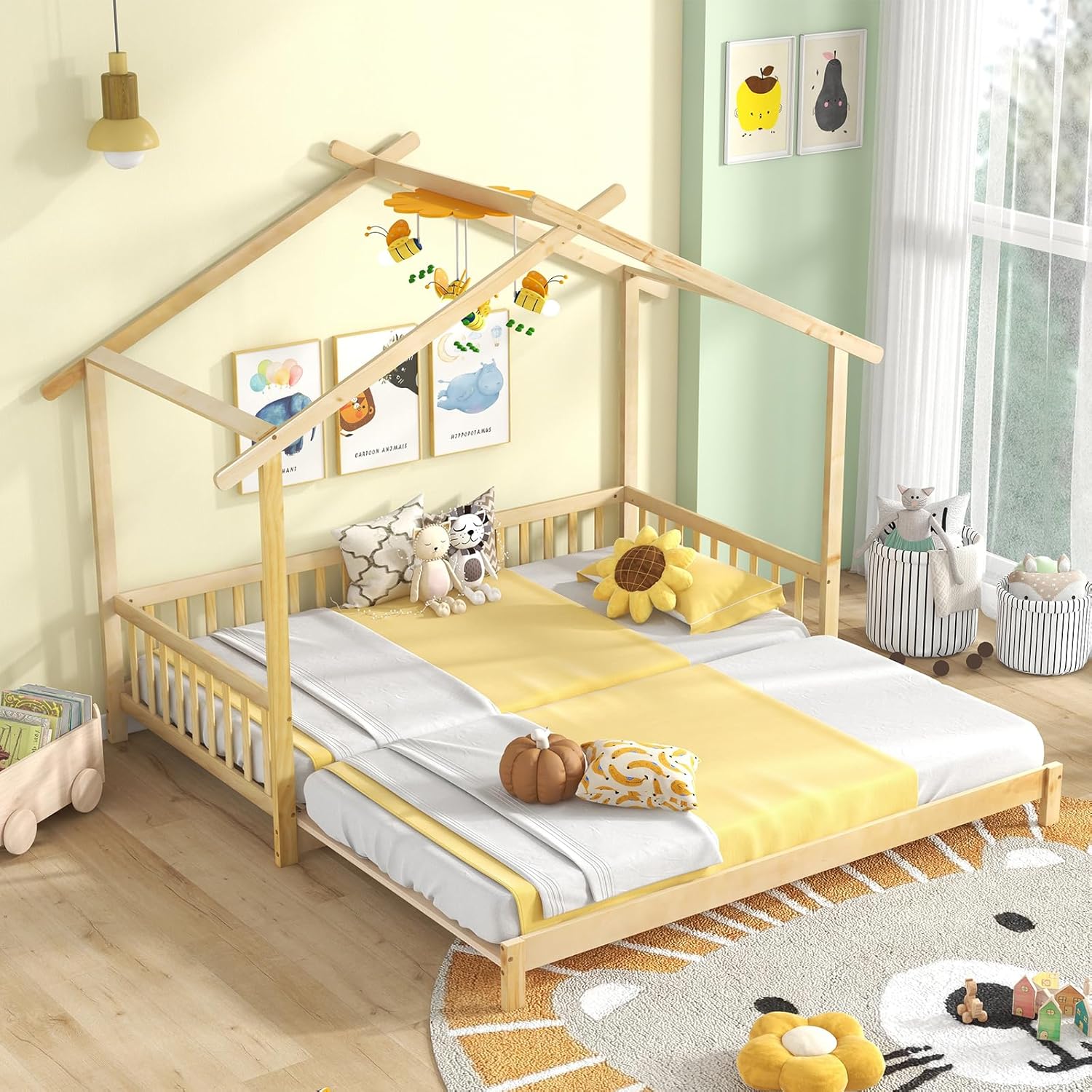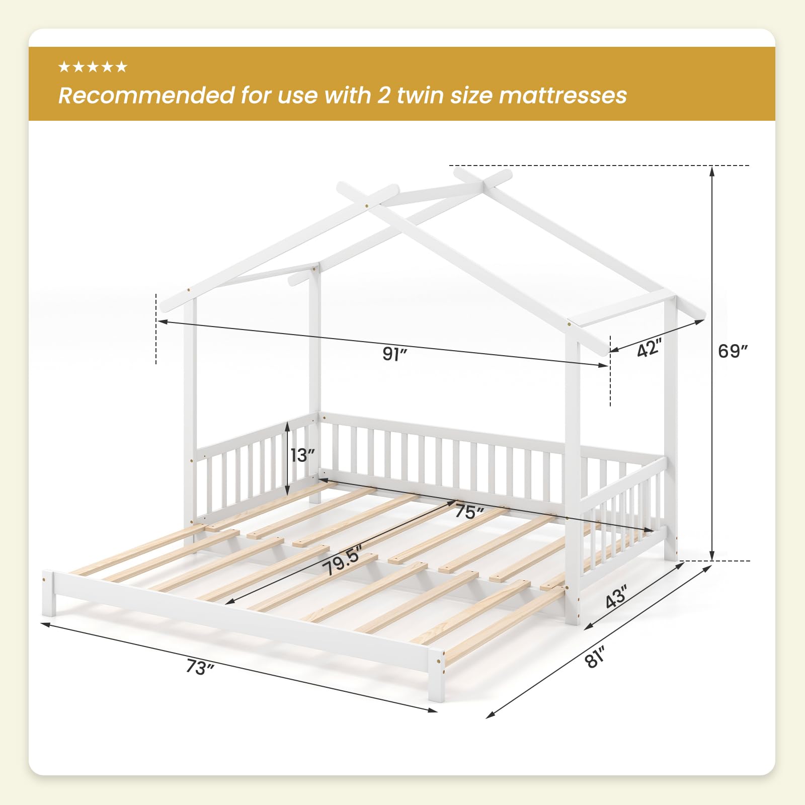 This twin to king house bed marries creativity with flexibility. Designed to grow with your family, this bed easily expands from a twin-size to a king-size, catering to your child’s needs from tot to teen. The imaginative bed features a playful roof that stimulates your kid’s imagination. Besides, crafted with sturdy plywood slats, the house bed presents excellent stability and durability. The safety features, such as the fence rails, offer peace of mind by helping prevent falls. The low-to-the-floor design promotes independence, making it easier for kids to climb in and out. Suitable for both boys and girls, the extendable house bed integrates seamlessly into any room decoration.