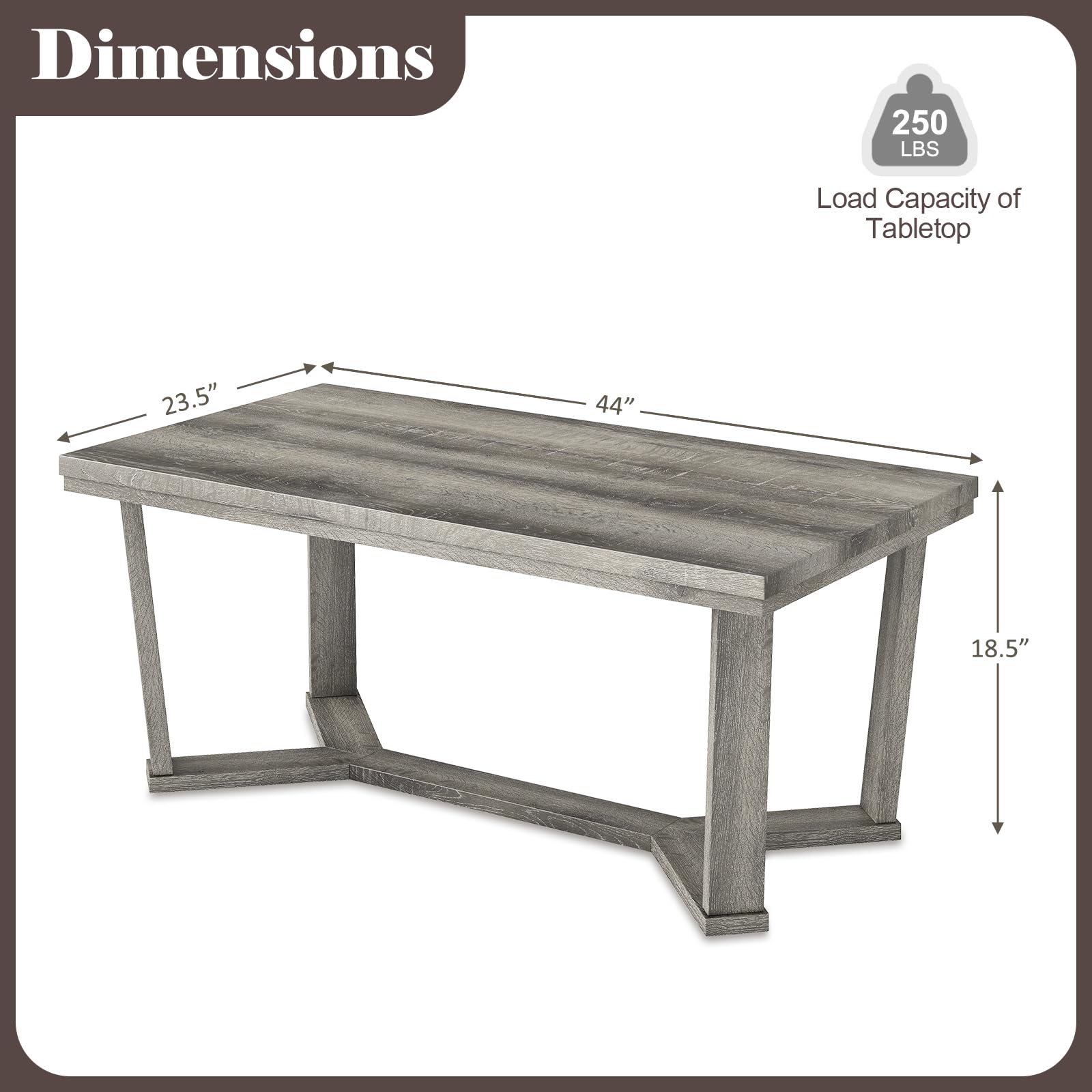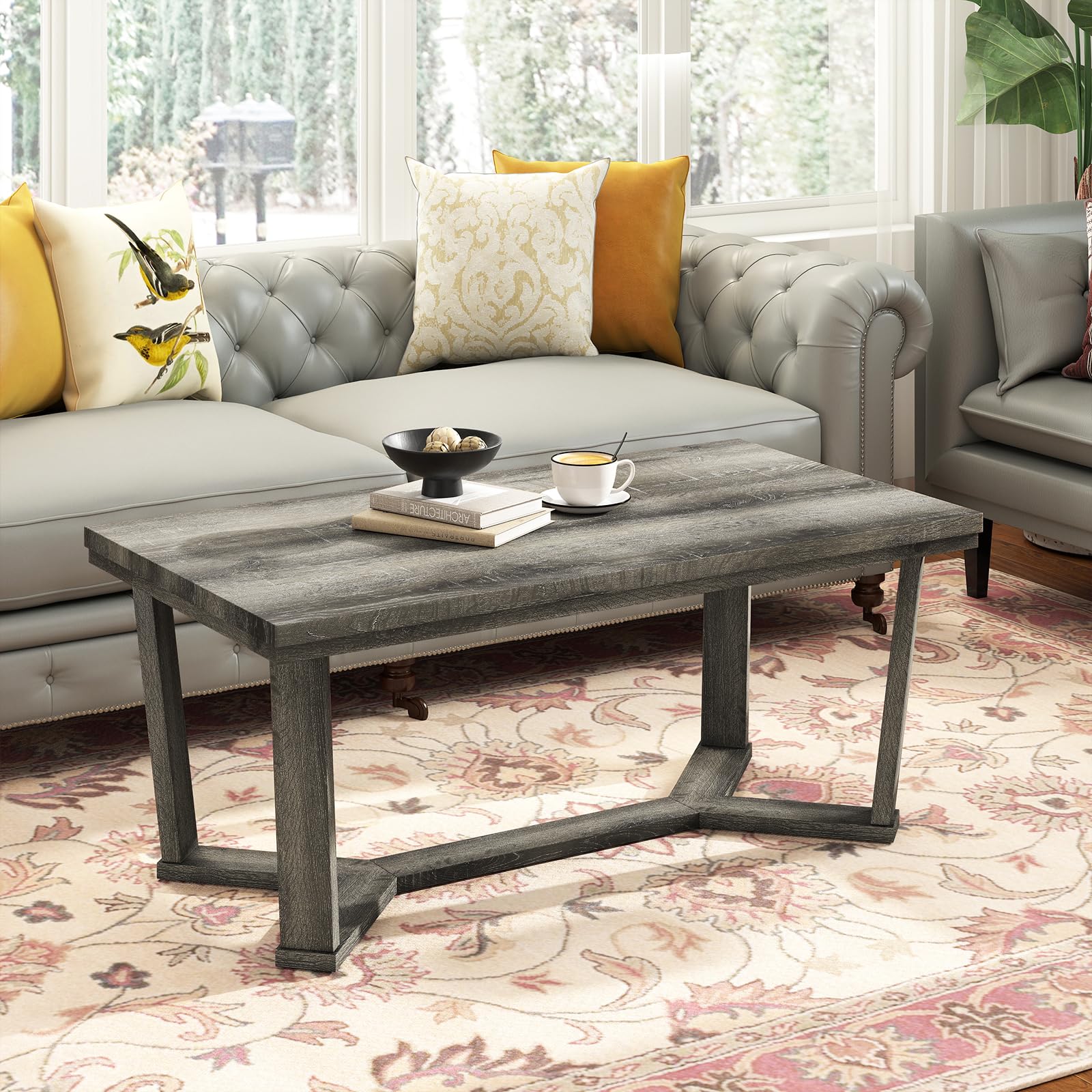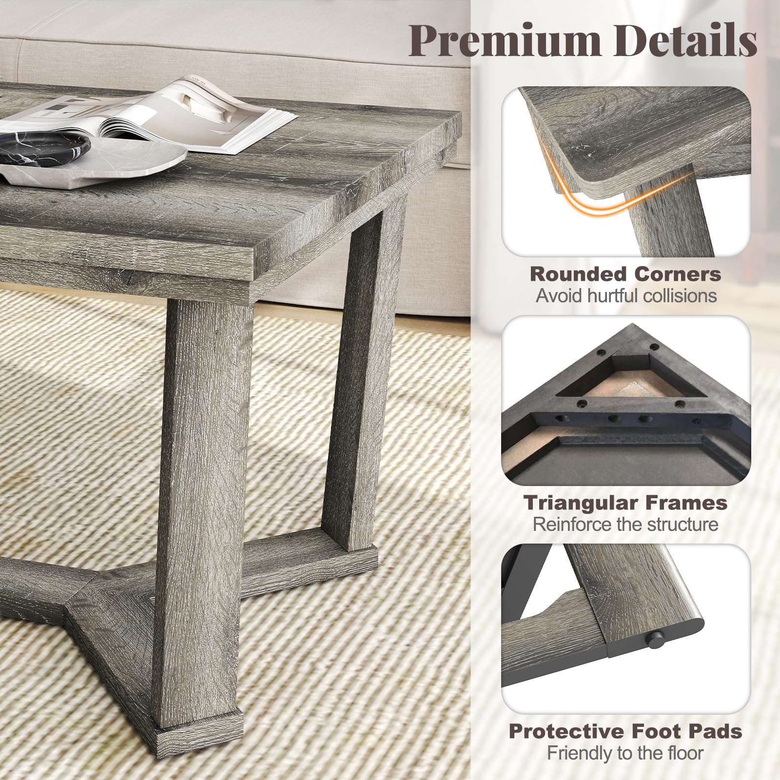 The coffee table provides ample tabletop storage for drinks, snacks, magazines, and decorations. The stable and sturdy structure features natural rubber wood. Its thick legs and cross-shaped base promote the load capacity up to 250 lbs. Its rustic farmhouse charm adds elegance and versatility, fitting seamlessly in living rooms, bedrooms, studies, or reception areas. Premium details, such as protective foot pads, rounded corners for safety, and sturdy triangle frames, enhance the table’s durability and functionality, making it a stylish and reliable centerpiece for a variety of spaces.