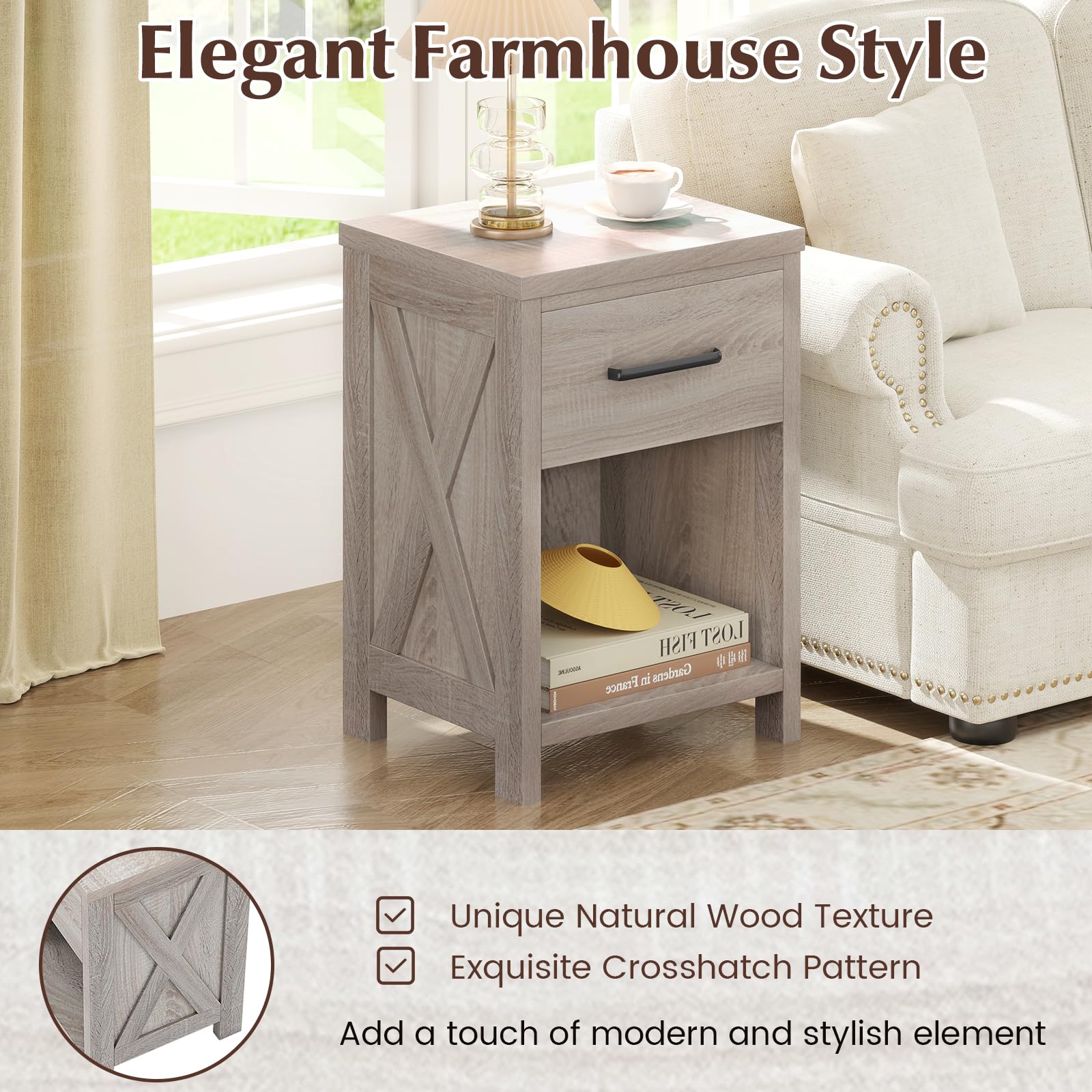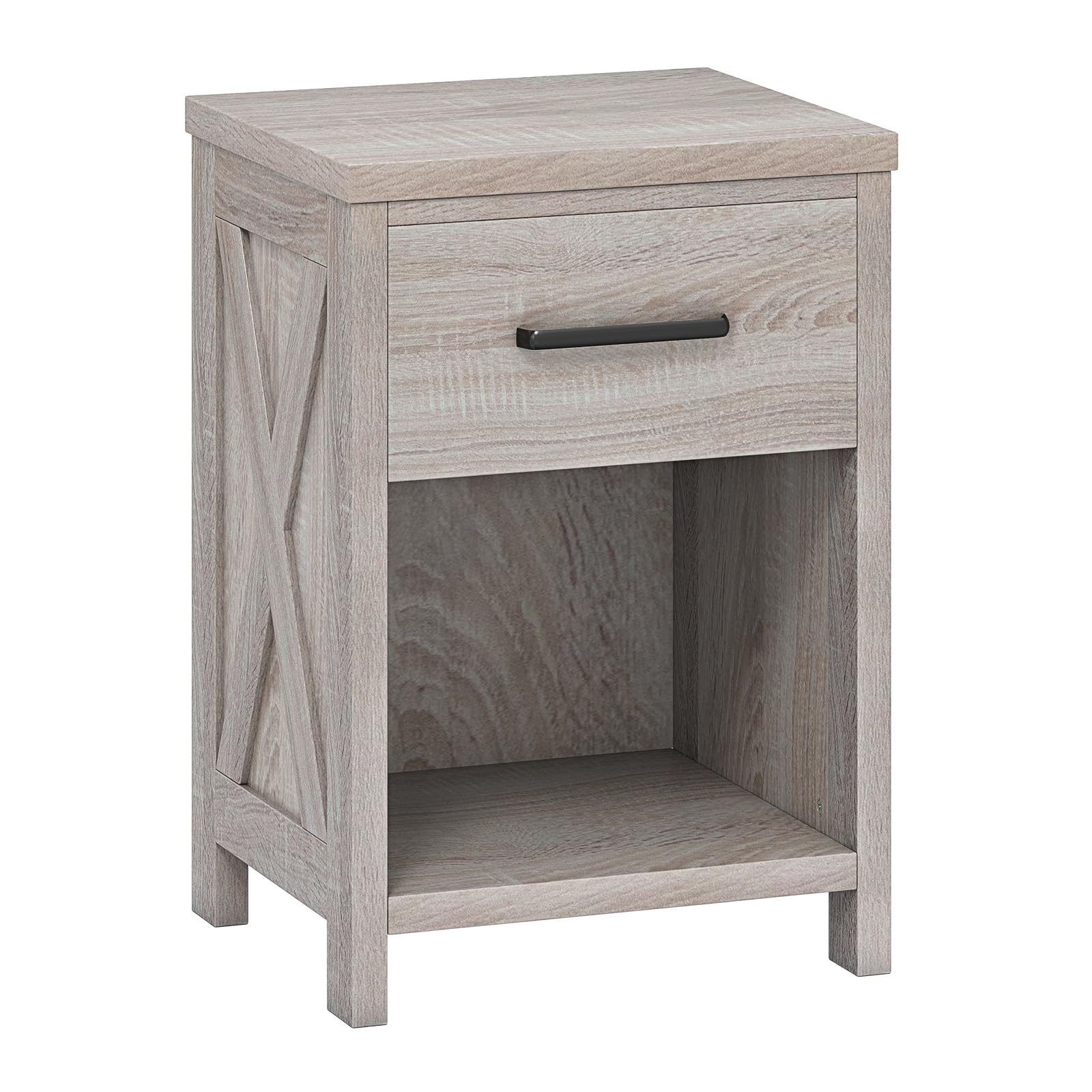 Bring charm, function to your space with this beautifully crafted 18"L x 15.5"W x 26.5"H farmhouse-style nightstand. Thoughtfully designed for everyday convenience, it features a spacious tabletop for your bedside essentials, a deep drawer for private storage, and an open lower shelf perfect for books, décor, or baskets. Built with a sturdy wood frame and reinforced with metal screws and fasteners, this nightstand is made to last. The signature X-pattern side panels add a rustic farmhouse flair, blending warmth and elegance effortlessly. Whether placed in the bedroom, living room, or guest room, it serves as a reliable nightstand, side table, or accent piece.