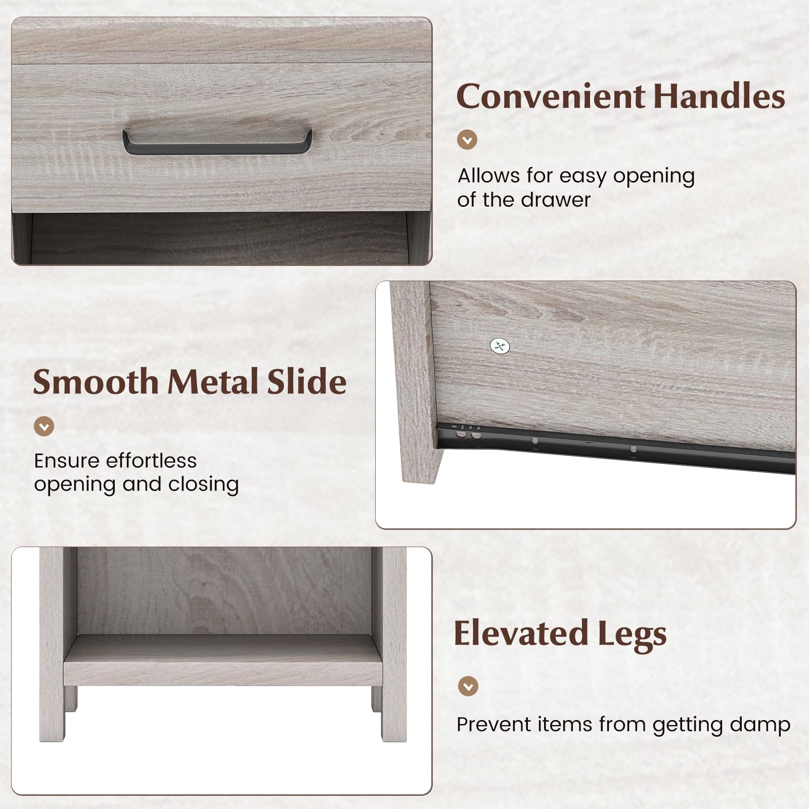 Designed with user comfort in mind, it includes smooth-glide metal drawer slides, a sleek metal handle, and protective foot pads that prevent floor damage. It's a multifunctional, stylish solution for your home organization needs.