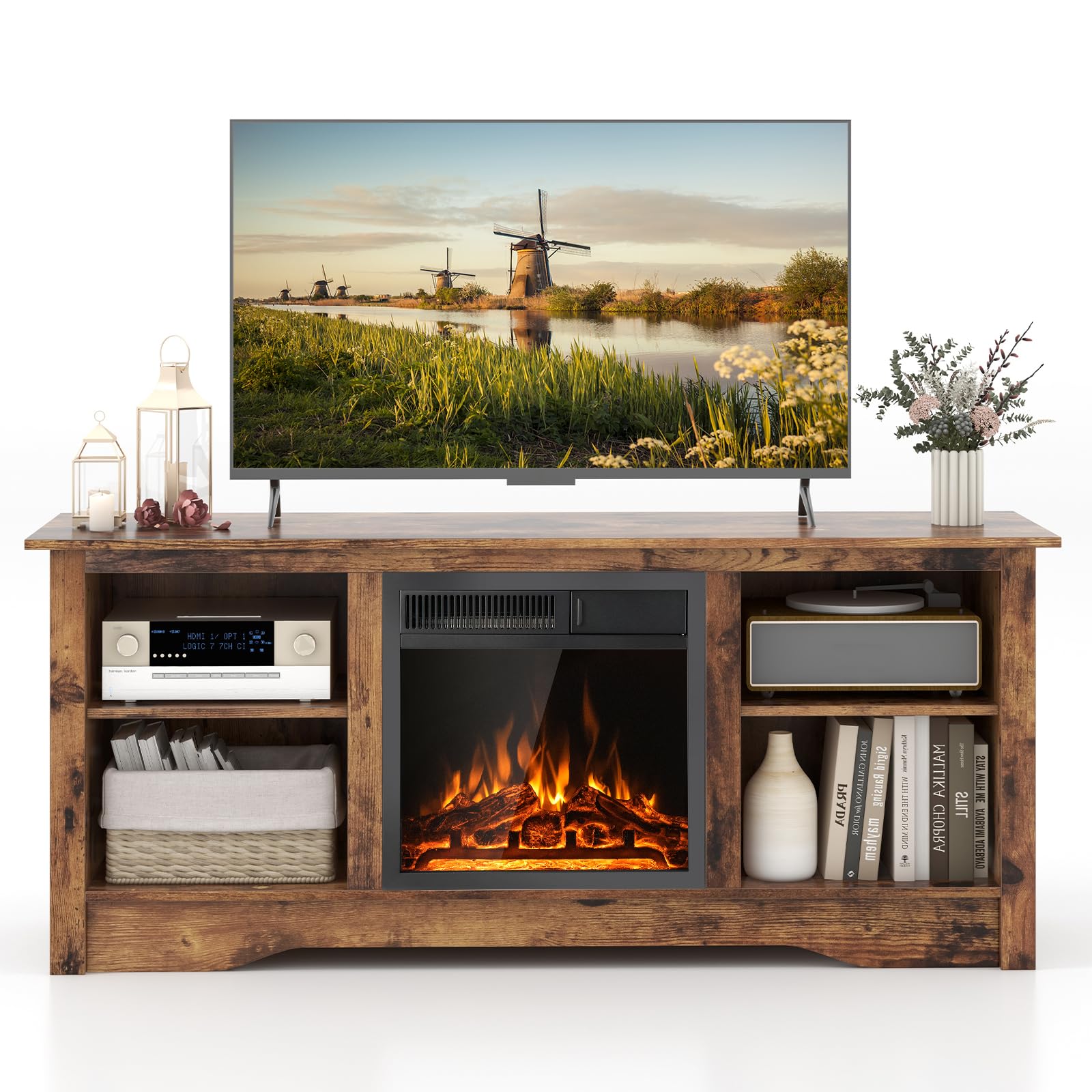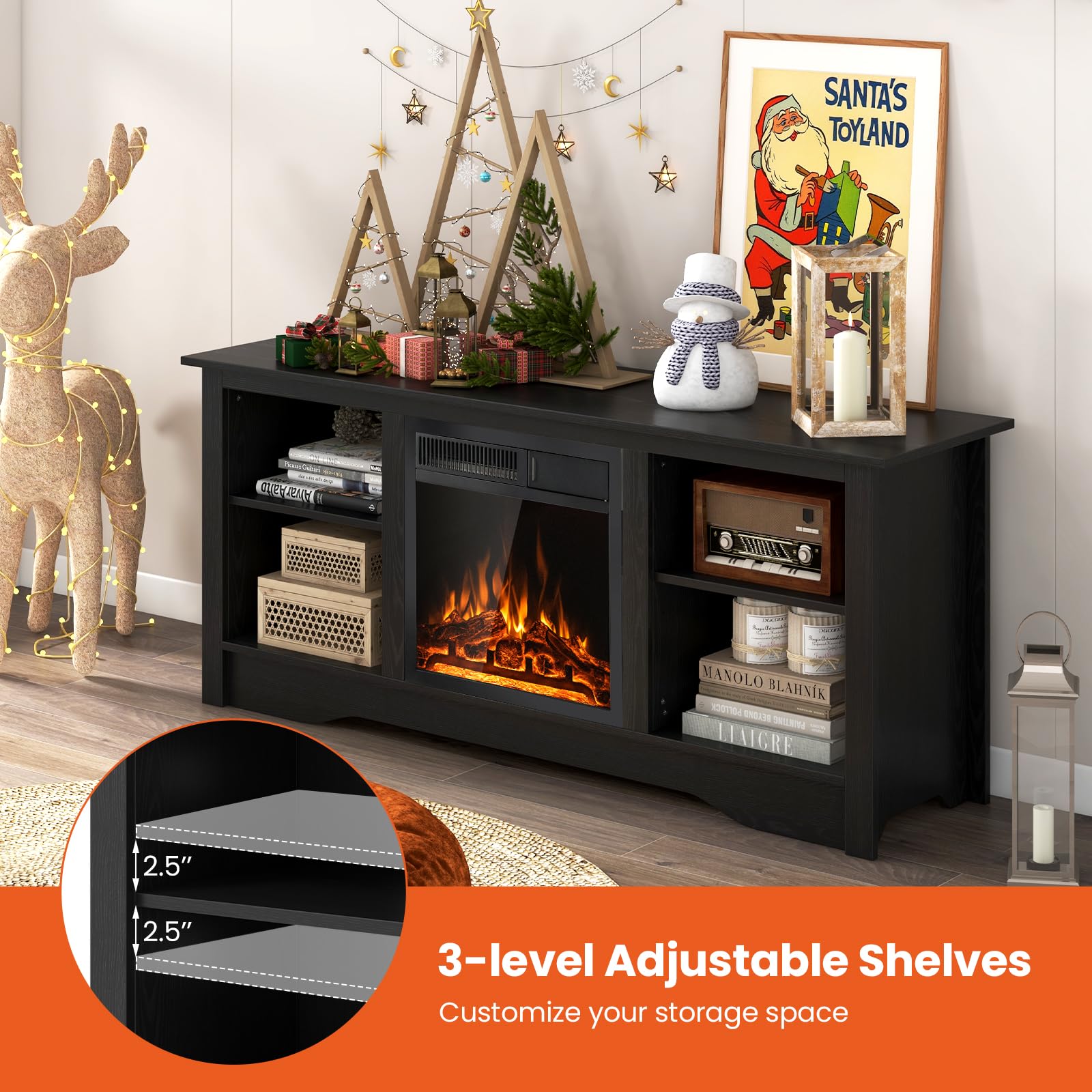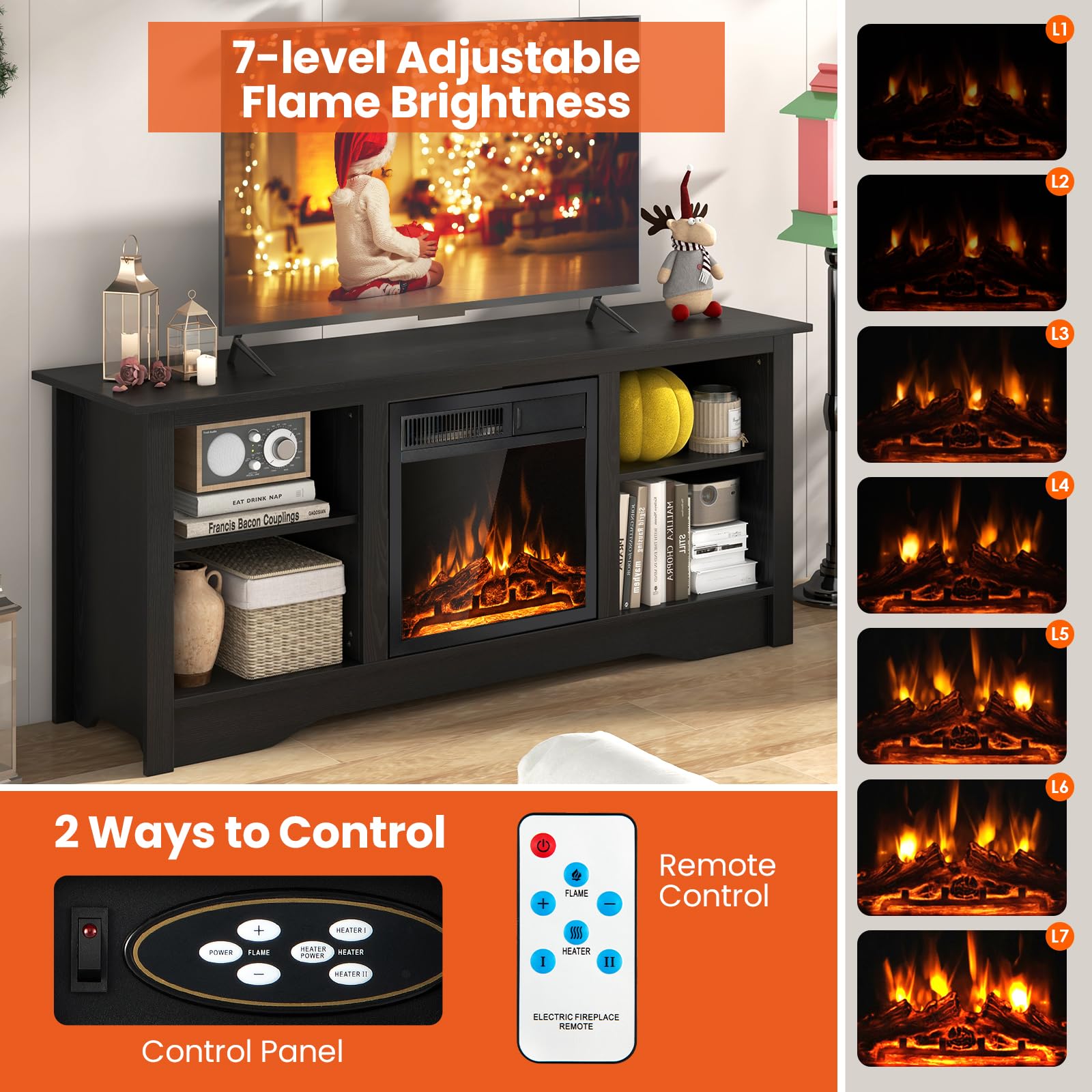 This media console table supports your TV up to 65 inches while housing an 18” electric fireplace for the fusion of functionality and ambiance. The 3-level adjustable shelves add customized storage space to accommodate items of different heights. When the chill sets in, the powerful 5100 BTU fireplace heater effortlessly spreads warmth across an expansive 400 sq ft. And you can choose between a 750W and 1500W setting based on your actual heating needs. The 7-level flame brightness ignites a serene atmosphere, allowing you to adjust to your preference for ambiance with or without heat.