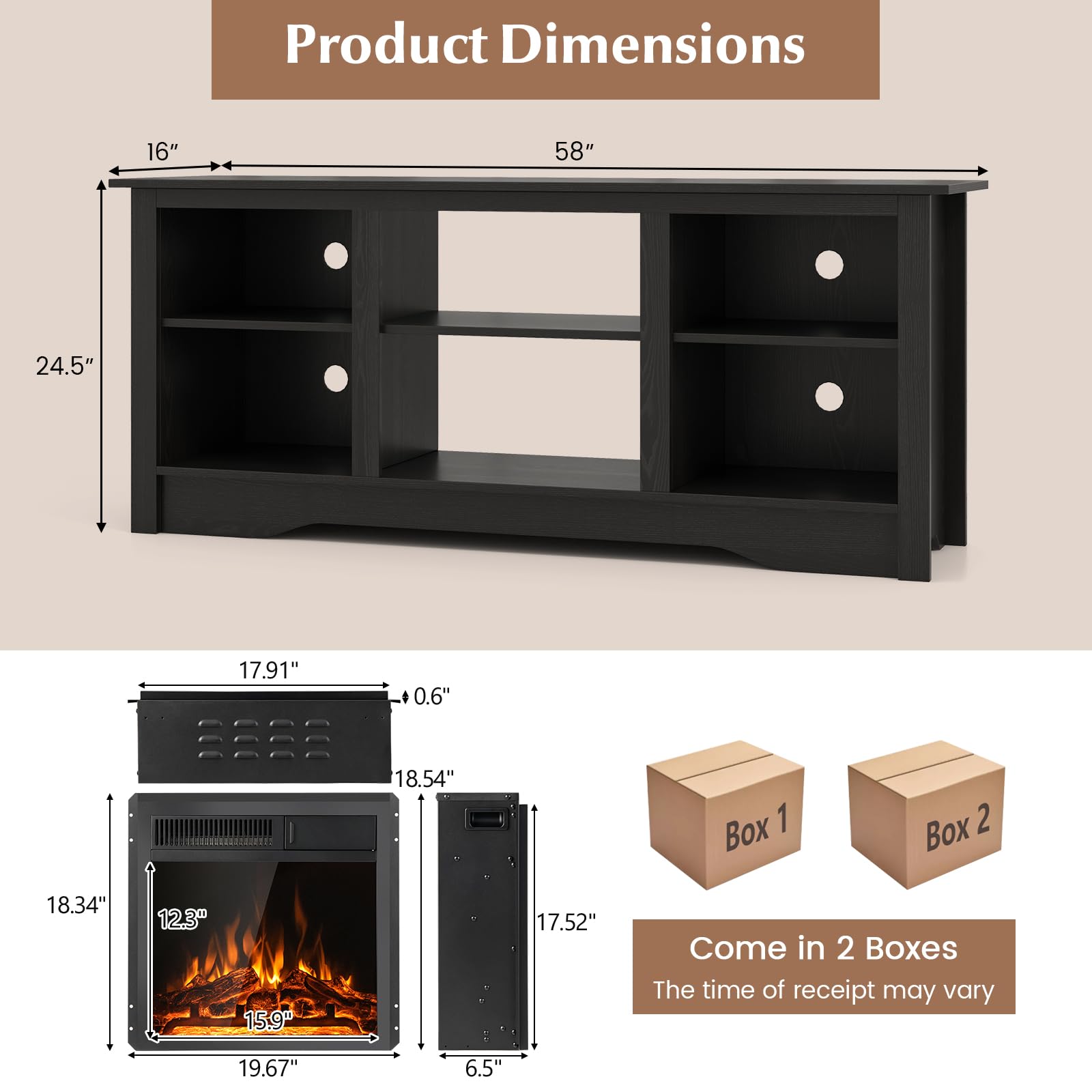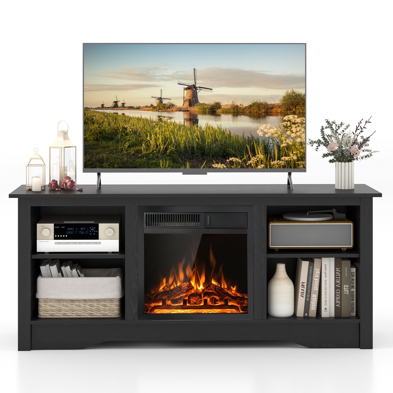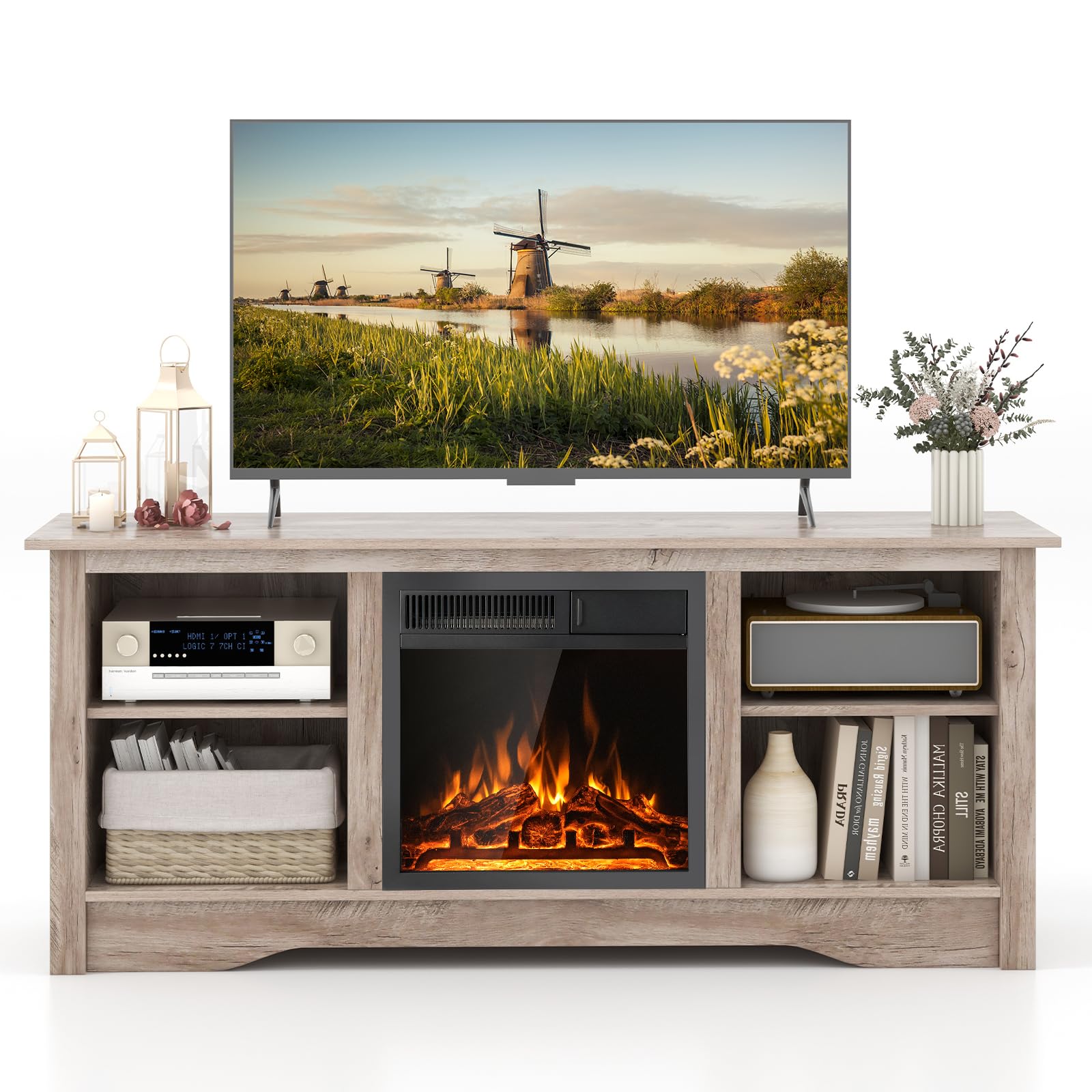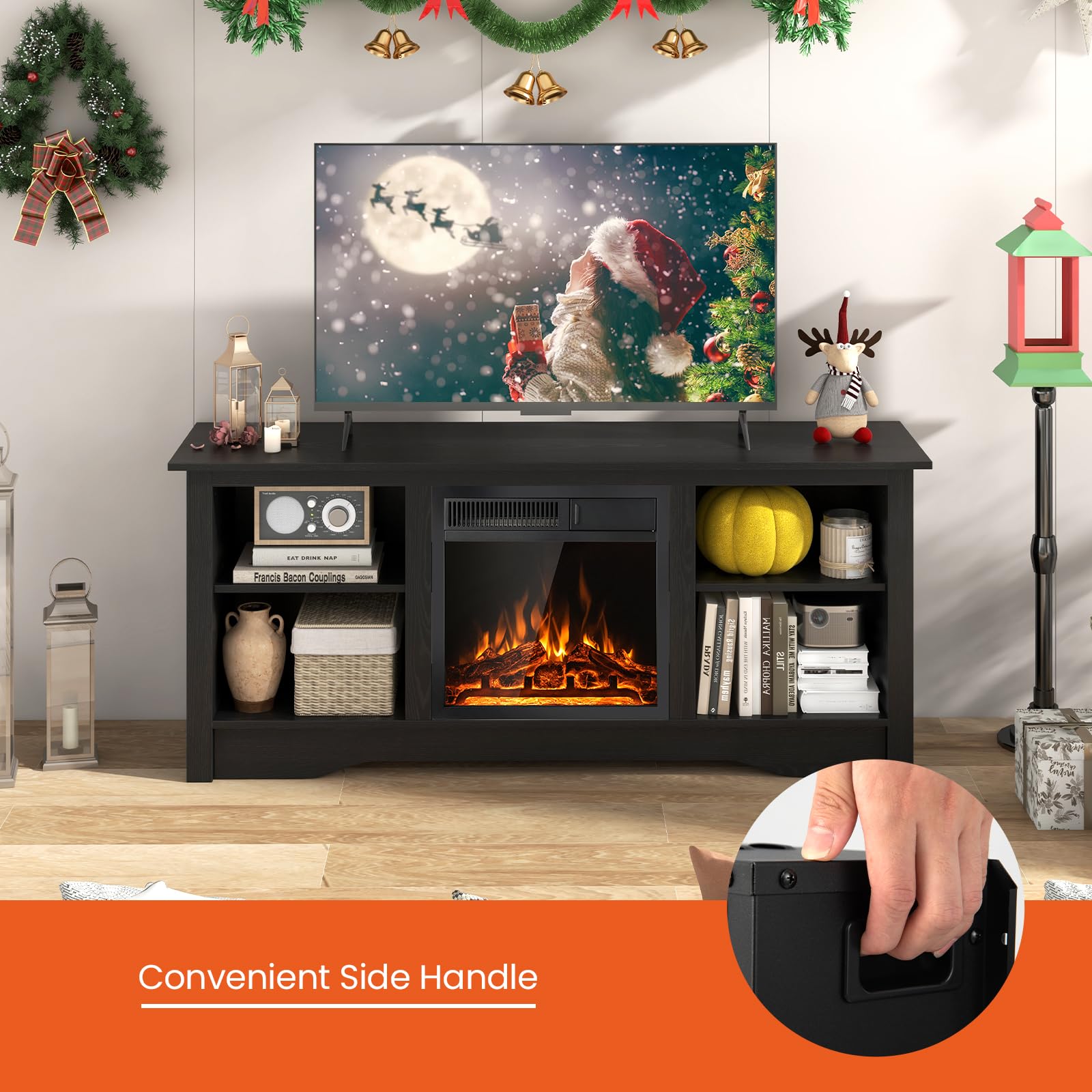 This media console table supports your TV up to 65 inches while housing an 18” electric fireplace for the fusion of functionality and ambiance. The 3-level adjustable shelves add customized storage space to accommodate items of different heights. When the chill sets in, the powerful 5100 BTU fireplace heater effortlessly spreads warmth across an expansive 400 sq ft. And you can choose between a 750W and 1500W setting based on your actual heating needs. The 7-level flame brightness ignites a serene atmosphere, allowing you to adjust to your preference for ambiance with or without heat.