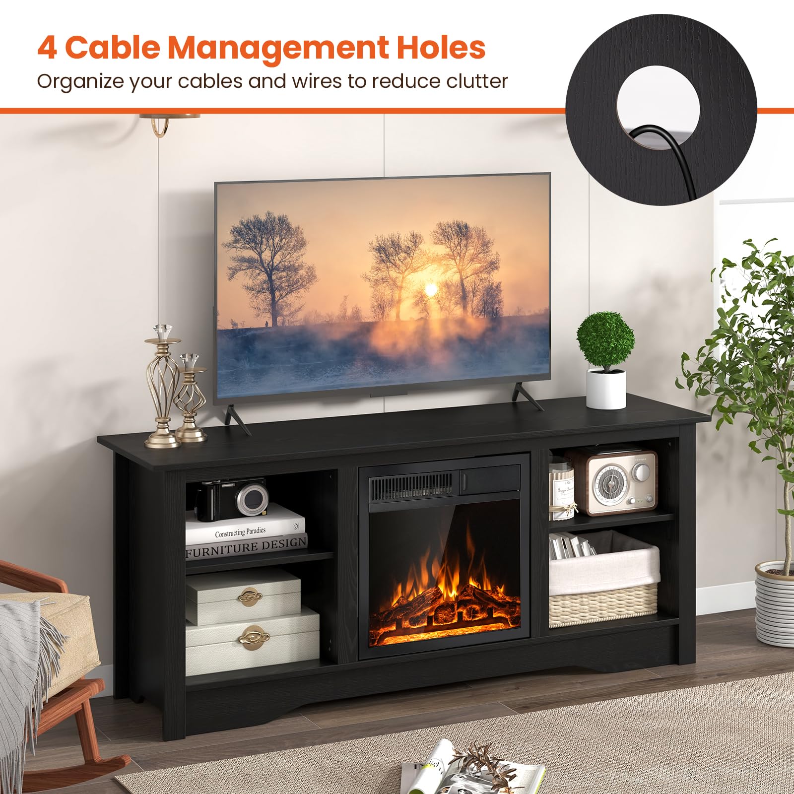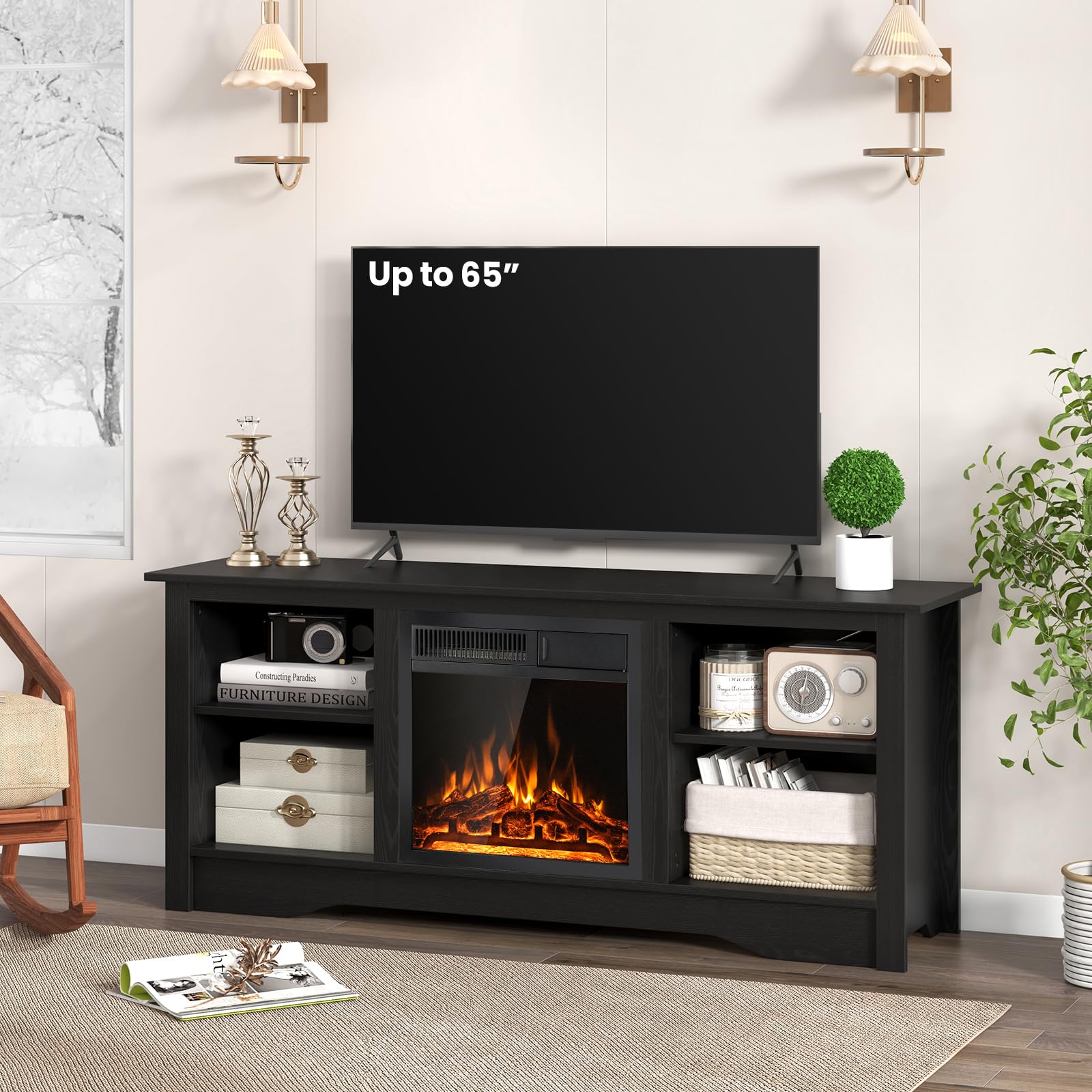 • TV Stand with Fireplace: This fireplace TV stand offers a built-in 18” electric fireplace that not only enhances your space with a cozy glow but also provides supplemental warmth when needed, all while supporting your TV up to 65 inches in style.