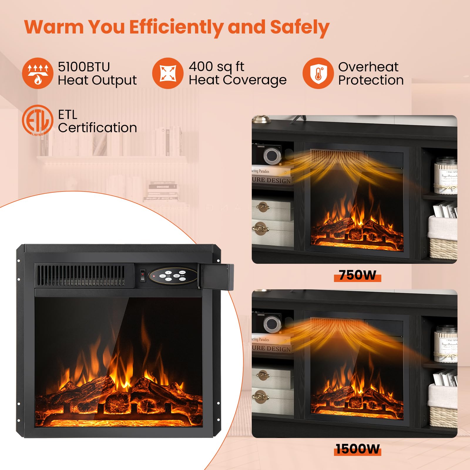 • Customized Comfort: This fireplace heater features 750W and 1500W heat settings for your options, adding warmth to your space during chill evenings. And the impressive 5100 BTU is capable of efficiently heating an area of up to 400 sq ft.