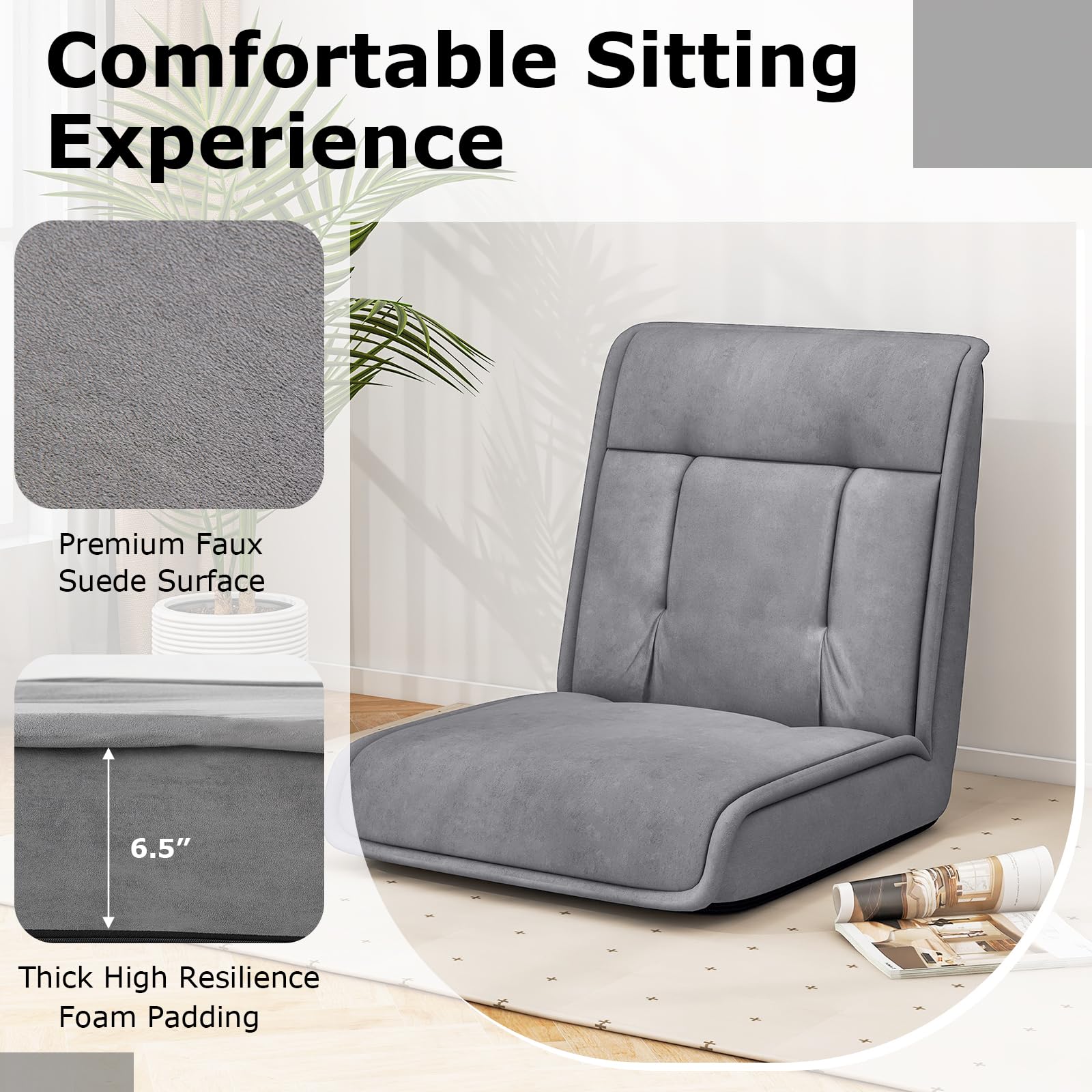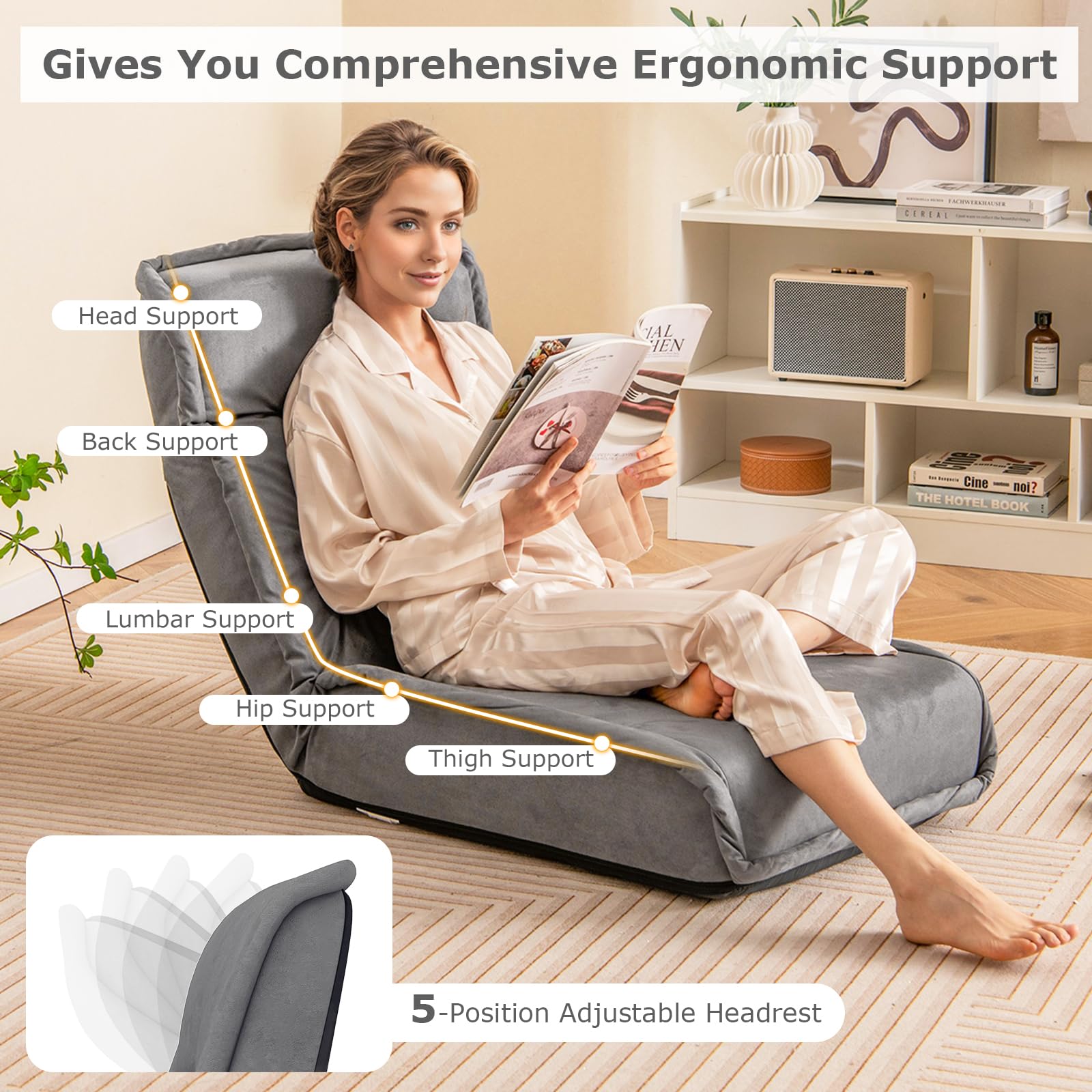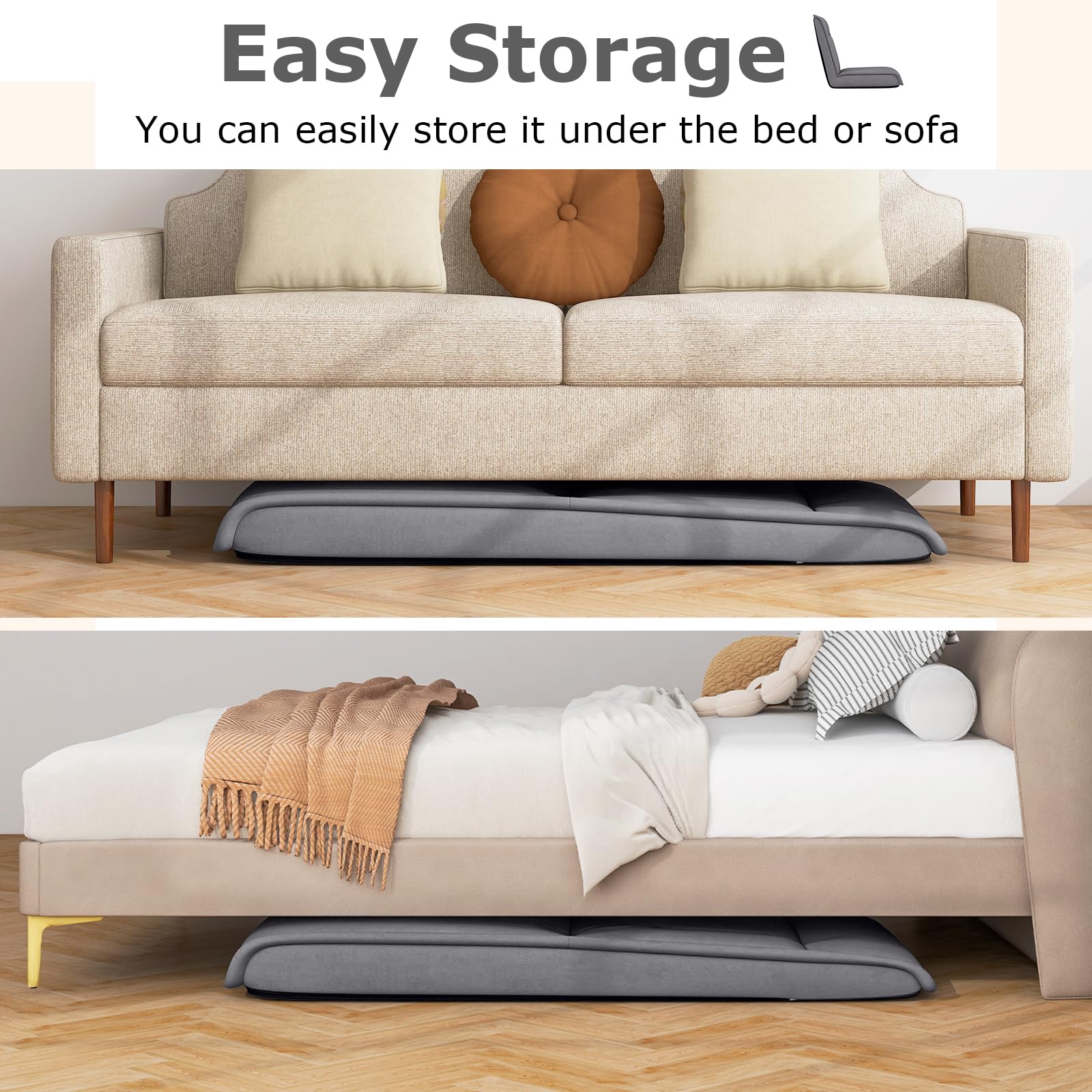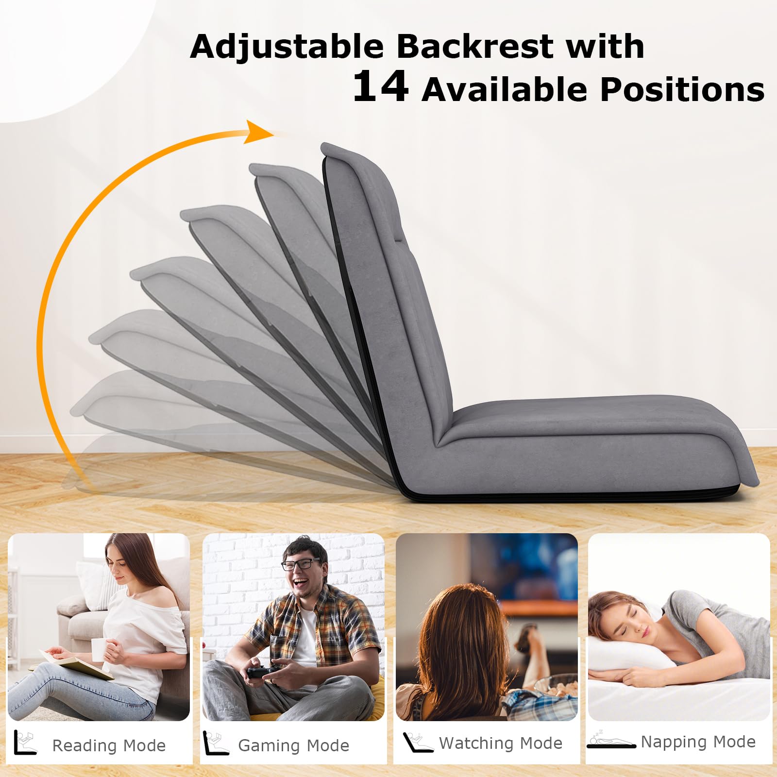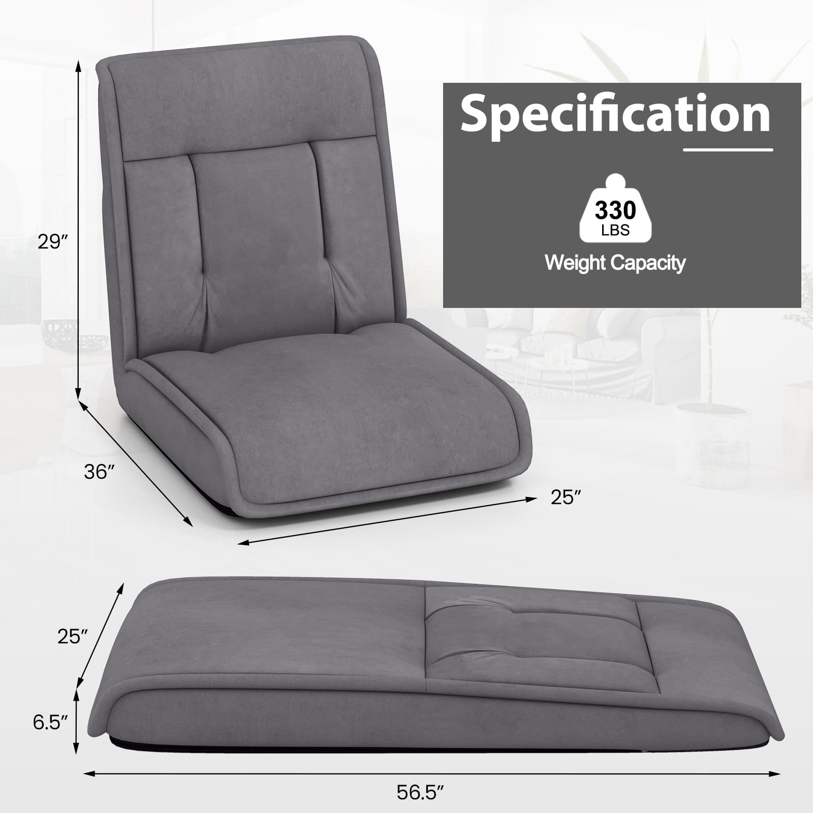 Revamp your living space effortlessly with our multifunctional 3-in-1 convertible floor sofa chair. Seamlessly shifting between a floor chair, lounger, and bed, this chair adapts to your ever-changing preferences. With a 14-position adjustable backrest and 5-position adjustable headrest, you can easily find an optimal angle for activities such as gaming, reading, watching TV, or napping, ensuring a tailored comfort experience. Constructed with a deluxe faux suede surface and thick sponge padding, our sofa chair offers a plush feel for extended sitting periods. The sturdy metal frame provides durability and stability, accommodating up to 330 lbs for reliable daily relaxation. When not in use, this compact floor chair conveniently folds into a space-saving size of 56.5" x 25" x 6.5" (L x W x H), perfect for storing under a bed or sofa. Versatile and chic, this elegant chaise lounge is suitable for the living room, bedroom, or dorm, adding a touch of style to your home decor while delivering maximum comfort and support for all your lounging needs.