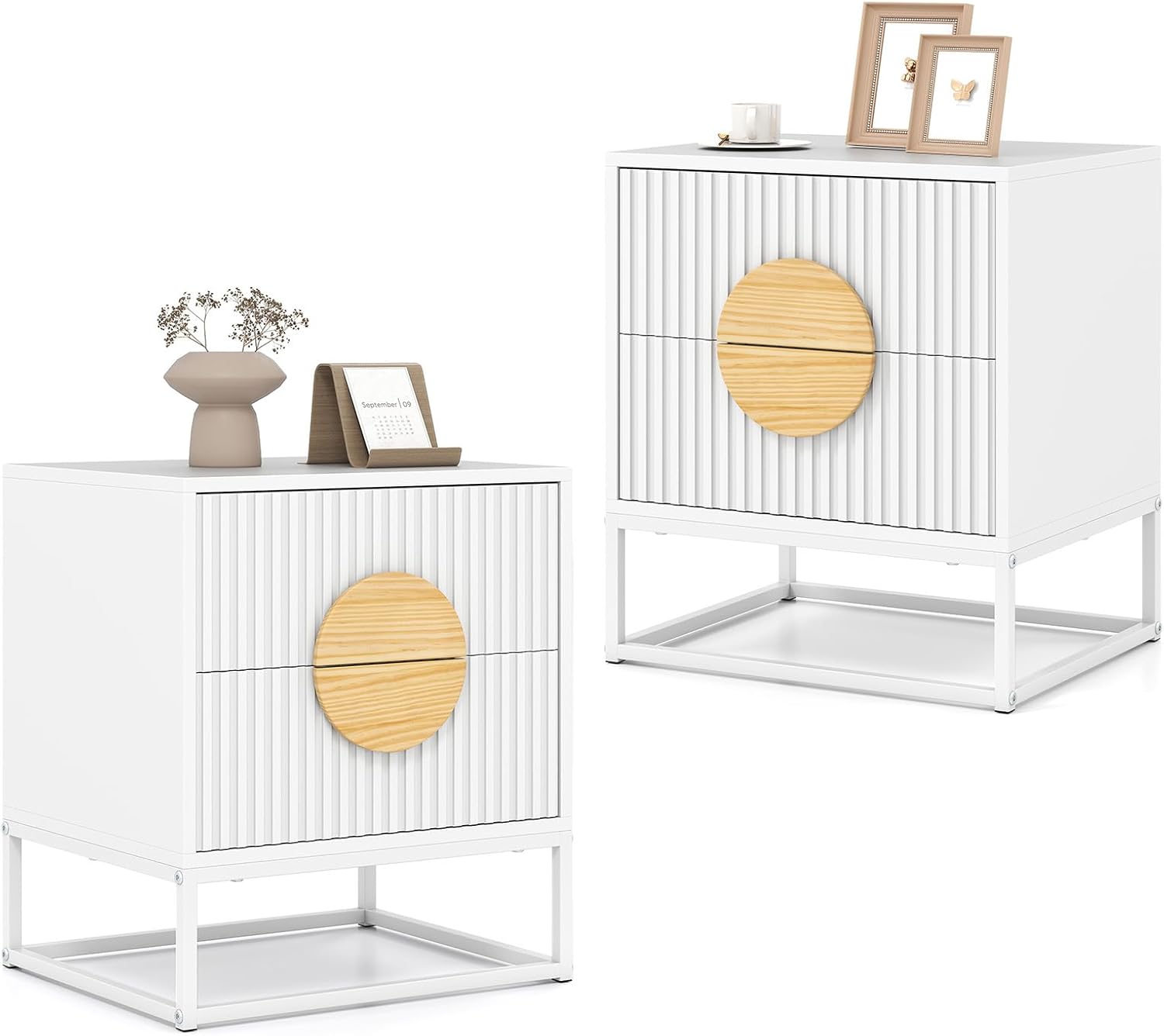 Add a touch of sophistication to your space with this chic side table boasting a stylish fluted design. Equipped with a spacious tabletop and dual drawers, it can help you create a perfect storage system. The sturdy metal structure ensures stability, supporting up to 132 lbs effortlessly, while protective foot pads prevent floor scratches. For easy access, solid pine wood handles and smooth metal drawer slides are included. This versatile table can serve as an end table, nightstand, or side table in different rooms of your home, blending functionality with modern flair.