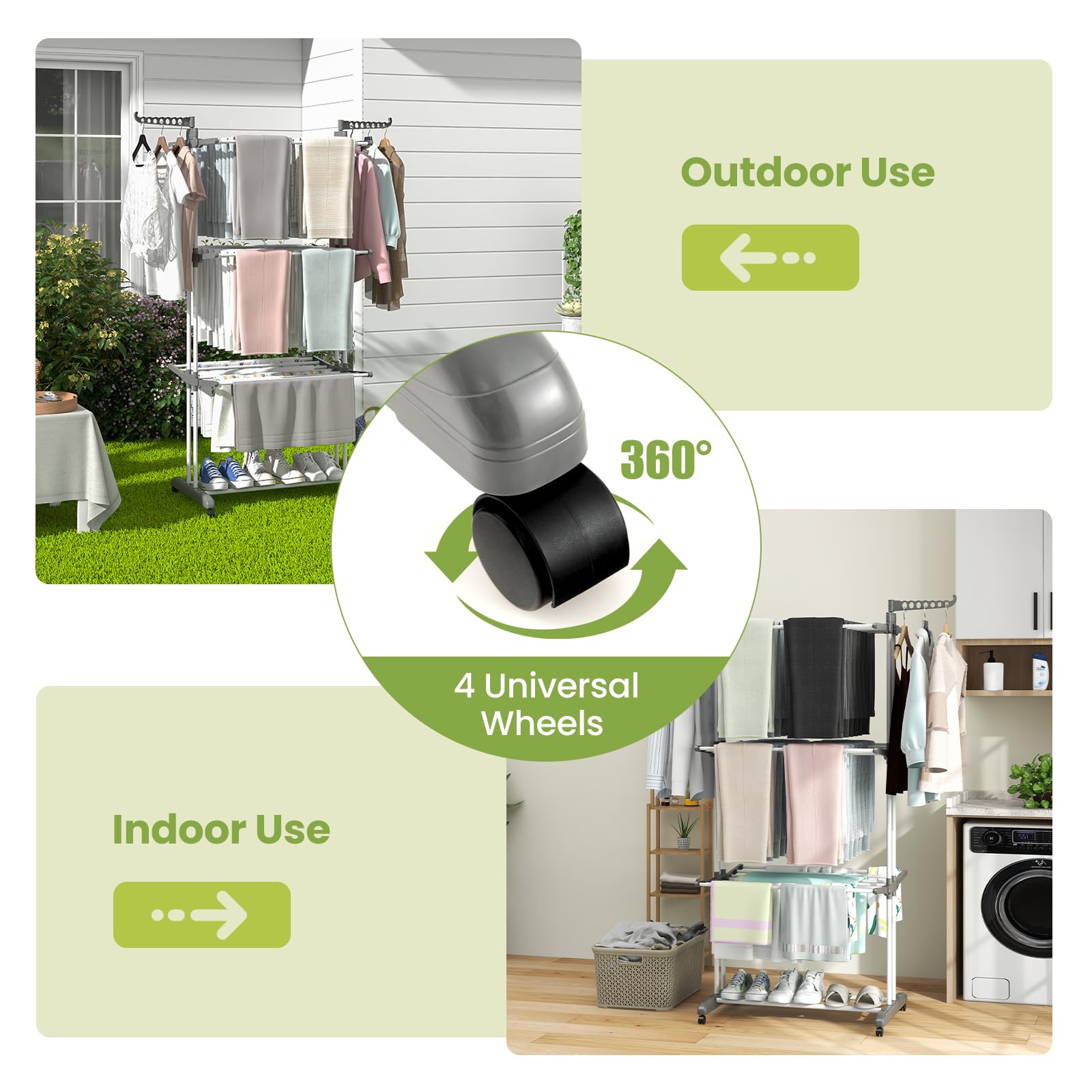 • [4-Tier Oversized Clothes Drying Rack]: The 4-tier design laundry dryer provides classified drying space and can fit a large amount of clothing. It features 2 hanger holders(7 holes on each side), 3 drying racks, and 1 shoe rack, which are perfect for drying towels, socks, clothes, quilts, or shoes.