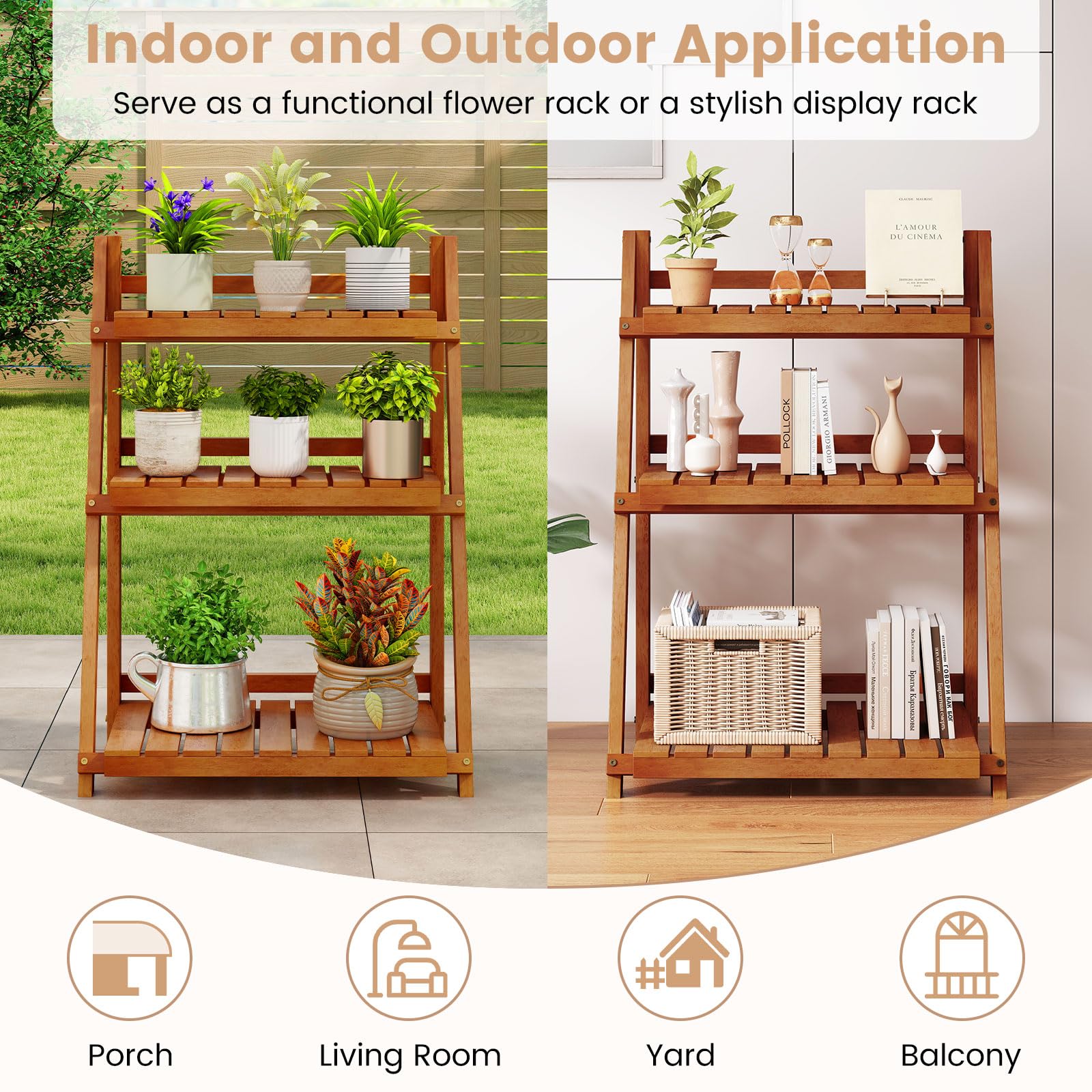 Our wooden plant stand is crafted from solid wood that holds a PEFC certification, protected with teak oil, ensuring it withstands various weather conditions while maintaining its elegant appearance. The 3-tier laddered design elevates your plants, allowing sunlight to reach each one effectively, ideal not only for enhancing the growth of your potted plants but also for showcasing your cherished books and decorative pieces. Furthermore, it could fold flat in 1 second, no assembly required, designed with your convenience in mind. From your garden and balcony to your home office or living room, it enhances both functionality and visual appeal. Enjoy a touch of nature and a dash of modern flair with this exquisite flower rack.