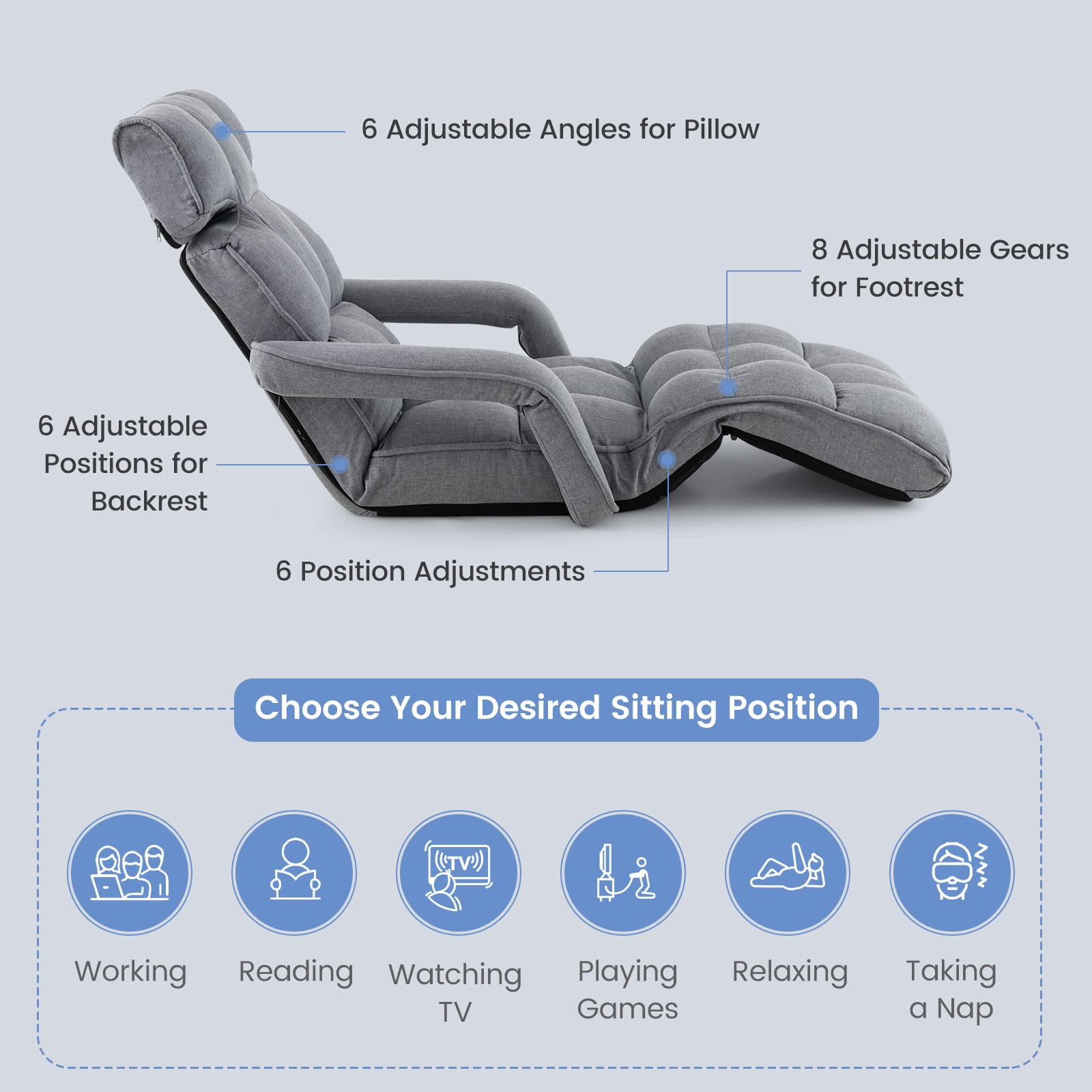 The headrest and backrest can be separately adjusted in 6-position, and the footrest is 8-position adjustable to meet your different needs. By pulling the armrests, you can completely lay the floor chair flat, or turn it into a chaise lounger or a recliner. The heavy-duty metal frame provides great strength, while the high resilience sponge and skin-friendly surface give you a comfortable sitting experience. More, you can fold this sofa chair to carry or store it. Suitable for all kinds of decoration styles! You can put this convenient floor chair in your study, living room, bedroom or children's room.