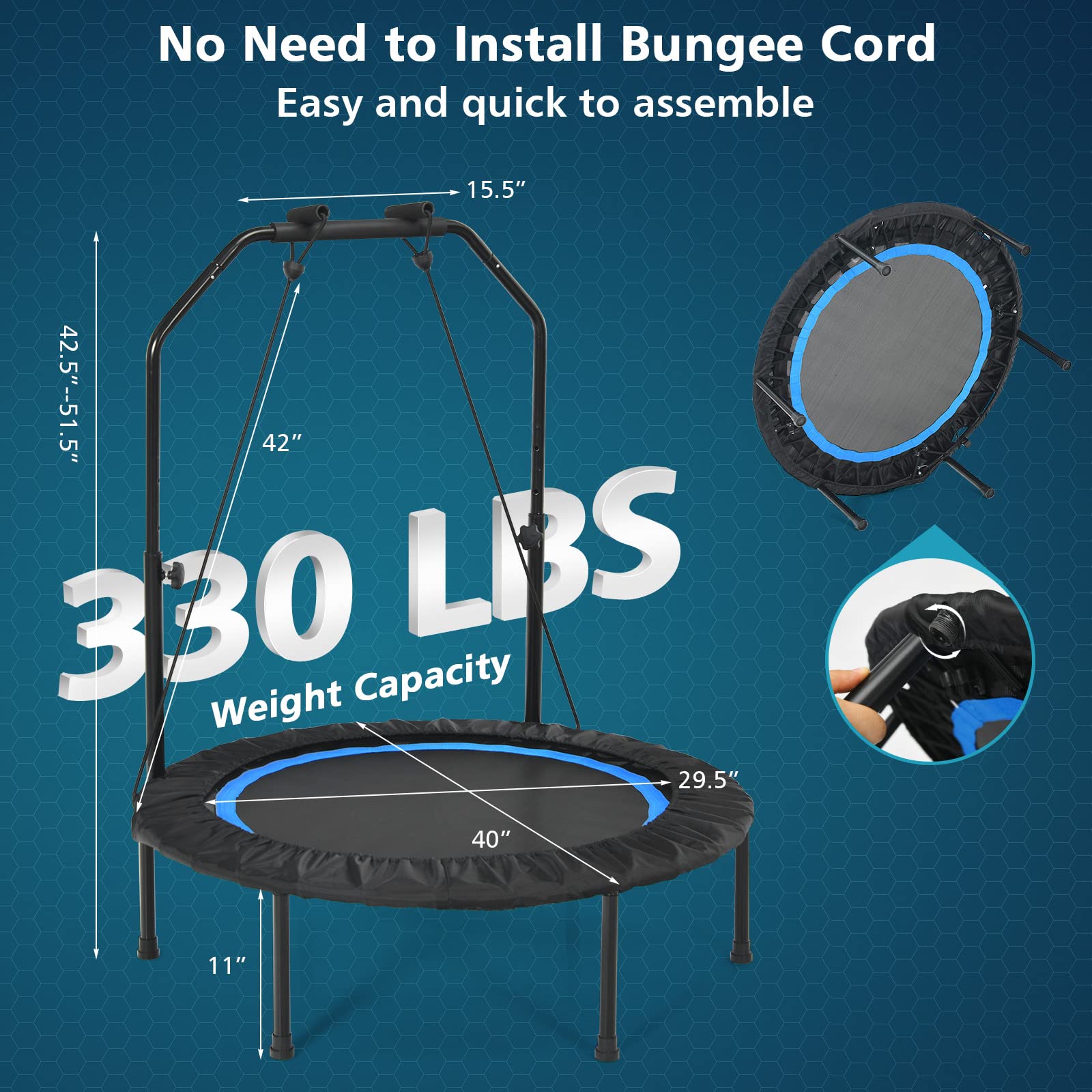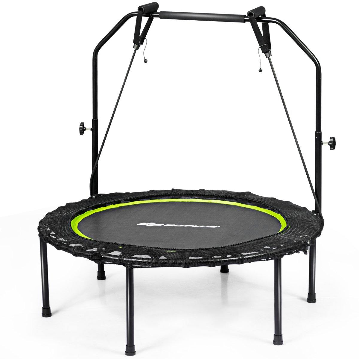 - [Multi-Use Mini Trampoline]: This mini trampoline is perfect for home workout, including yoga, cardio and strength training. Also, 4-level height adjustable handlebar is suitable for family members in all ages. 2 resistance bands are included in the package for stretching and more.