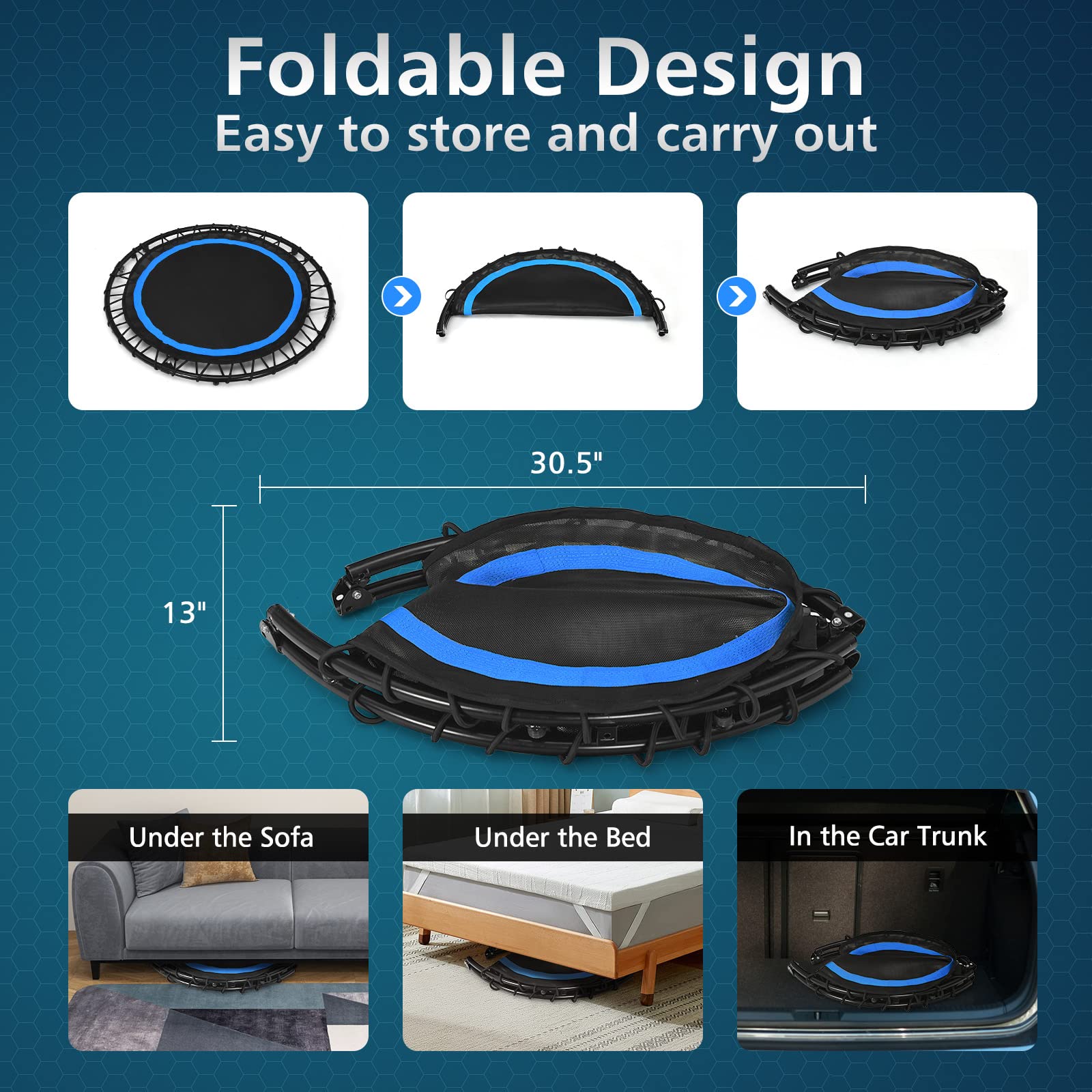 - [Foldable Design]: Giantex fitness trampoline can be folded into a compact size (30.5" x 13"), which makes it easy to store and carry out. The folded fitness trampoline is able to be stored under the sofa or bed, or placed in the car trunk.