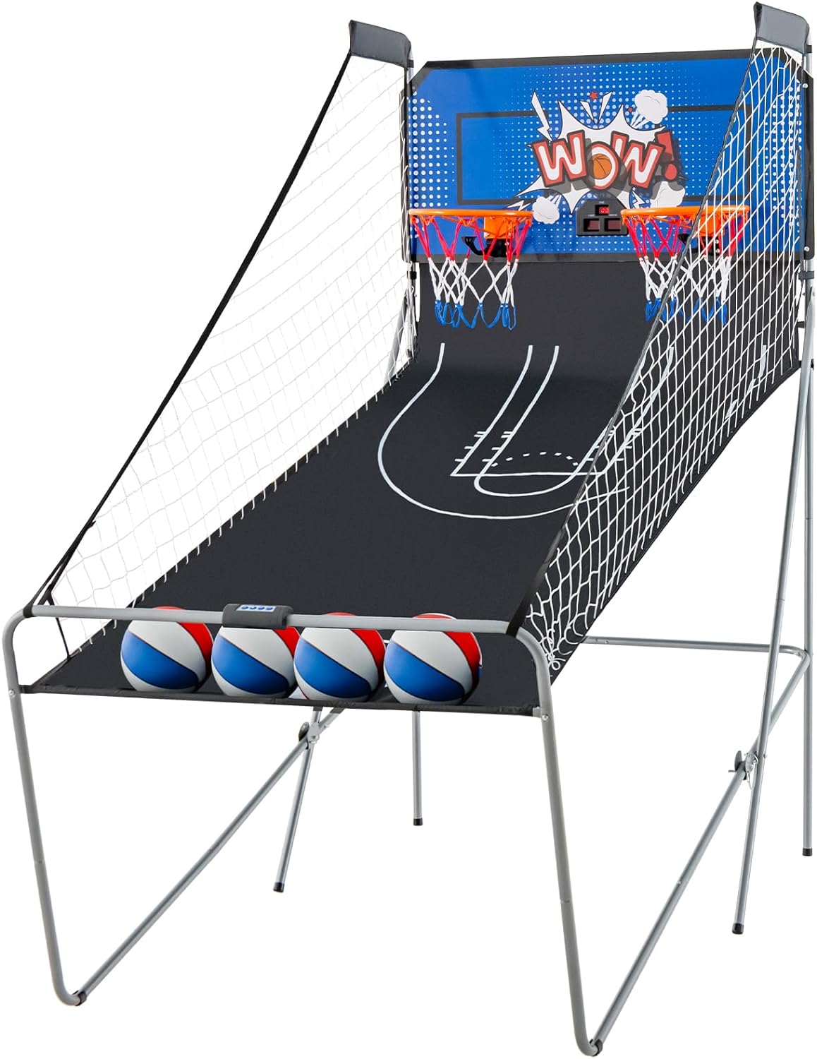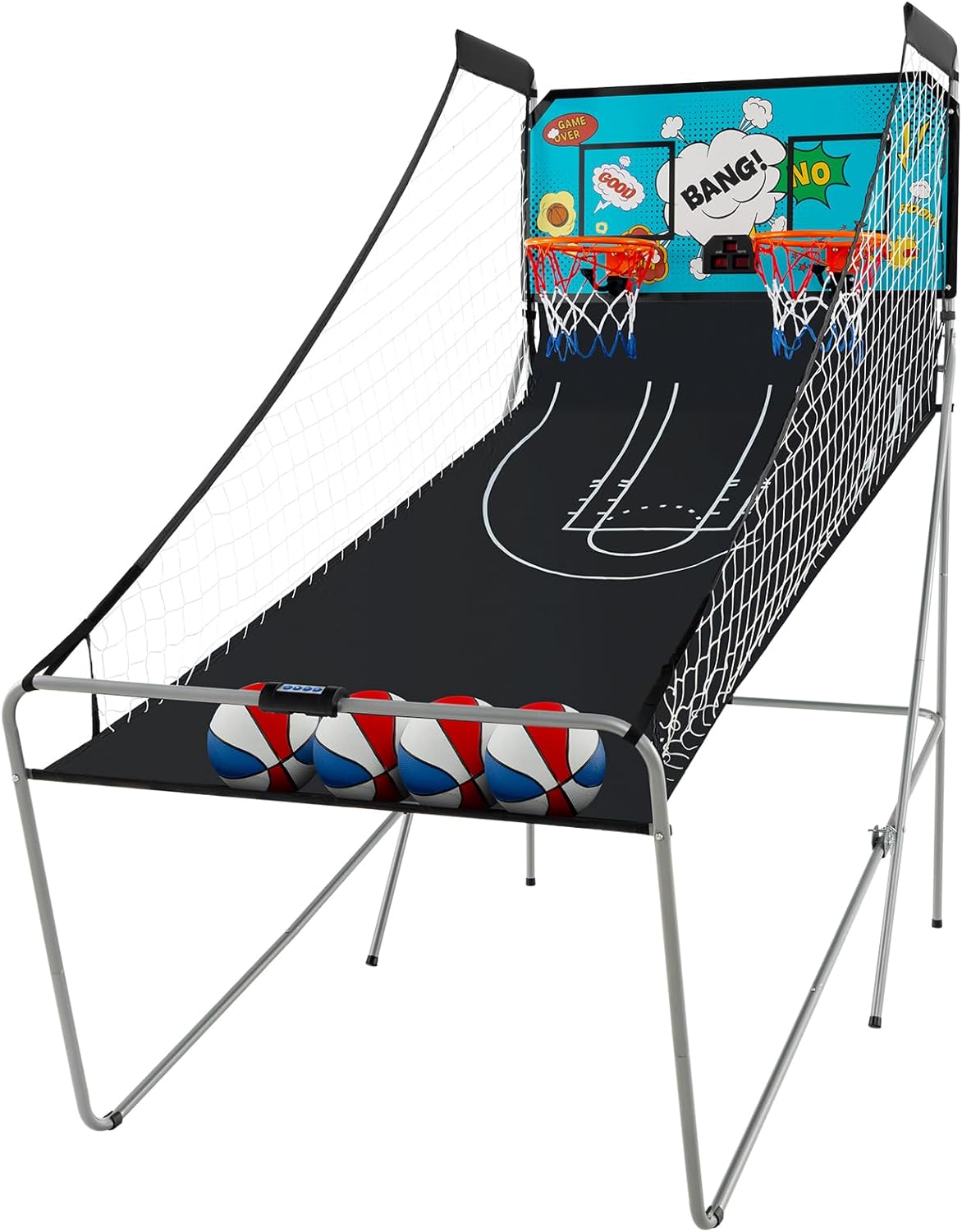 - [Thrilling Basketball Experience]: Featuring a clear LED electronic scoreboard and exciting goal scoring sound effects, this basketball arcade game can take your game to next level of fun. Plus, the side protective net and smooth polyester ramp enhance the overall gaming experience, ensuring safety and smooth gameplay. (Note: 3 AA batteries are not Included).