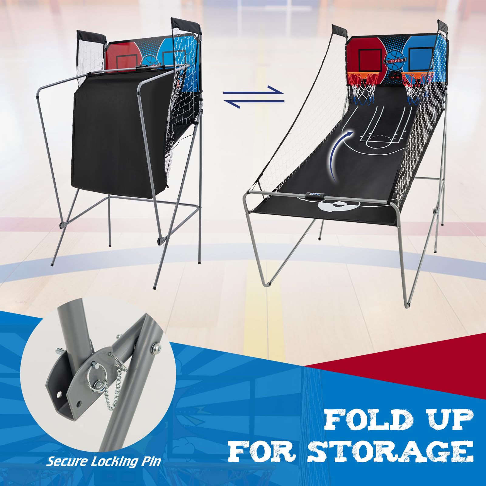 - [Convenient Folding Design]: With its user-friendly design, this basketball game machine can be easily folded up for convenient storage. In addition, the secure locking pin ensures that the frame of basketball game will remains firmly in place when not in use, providing peace of mind.