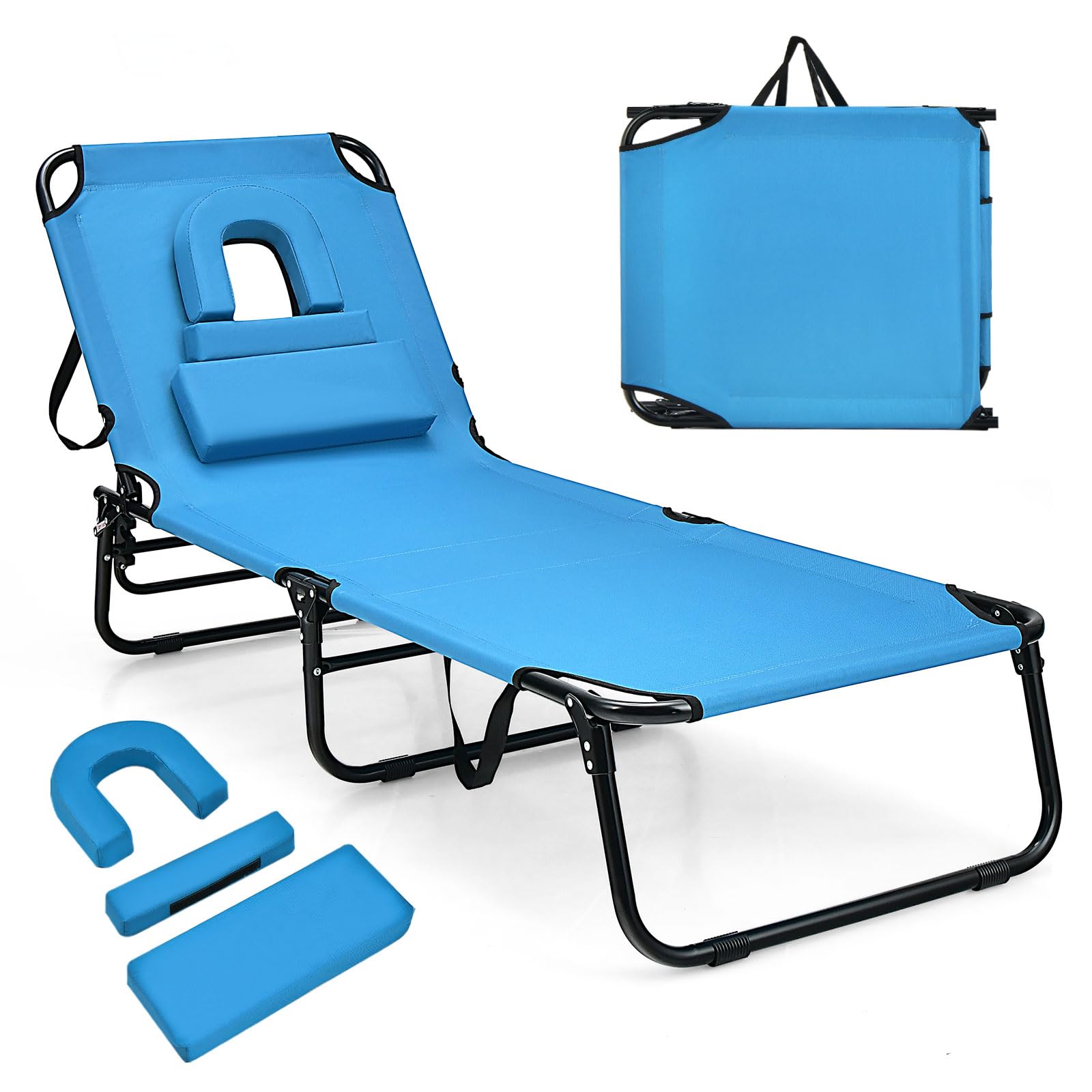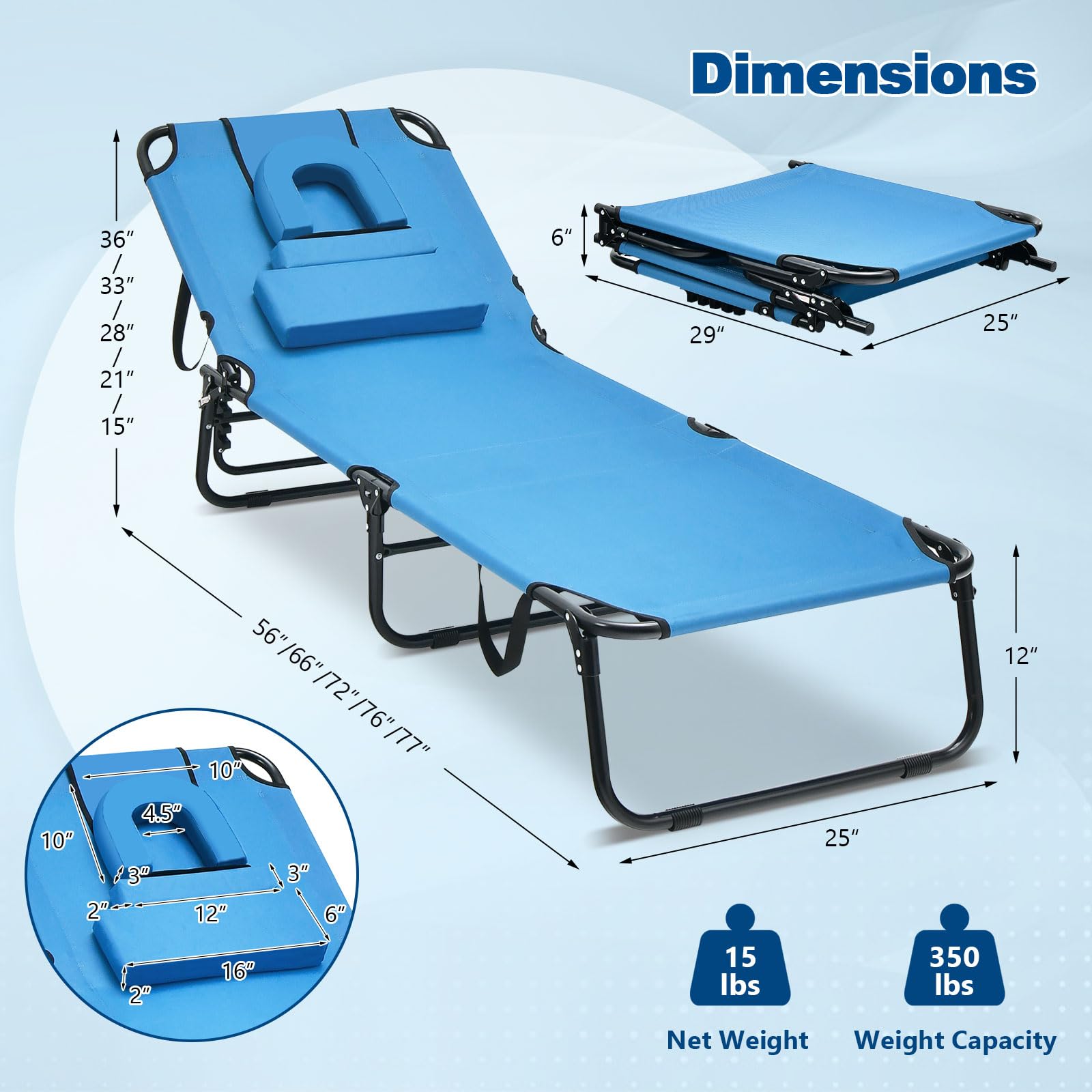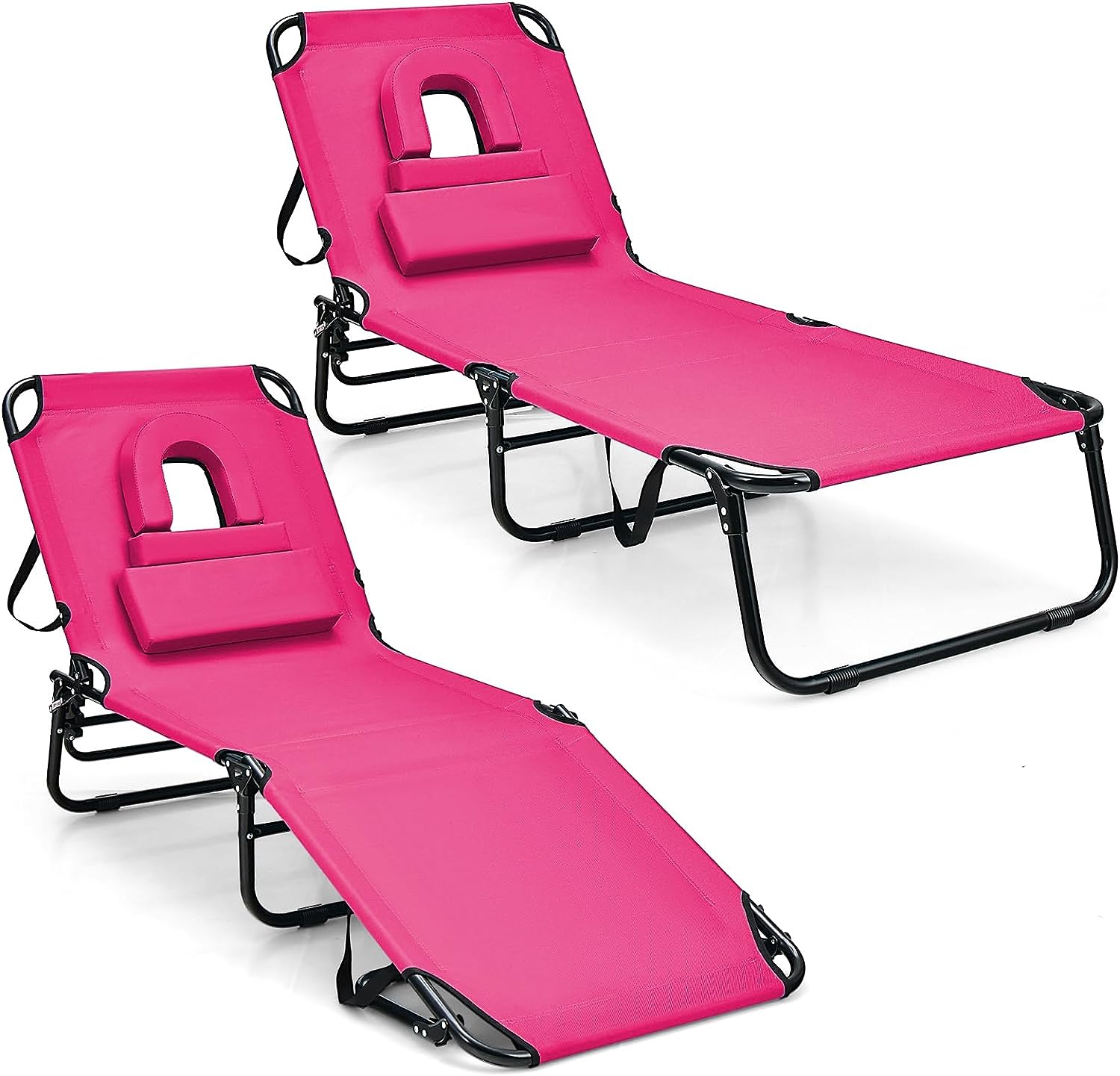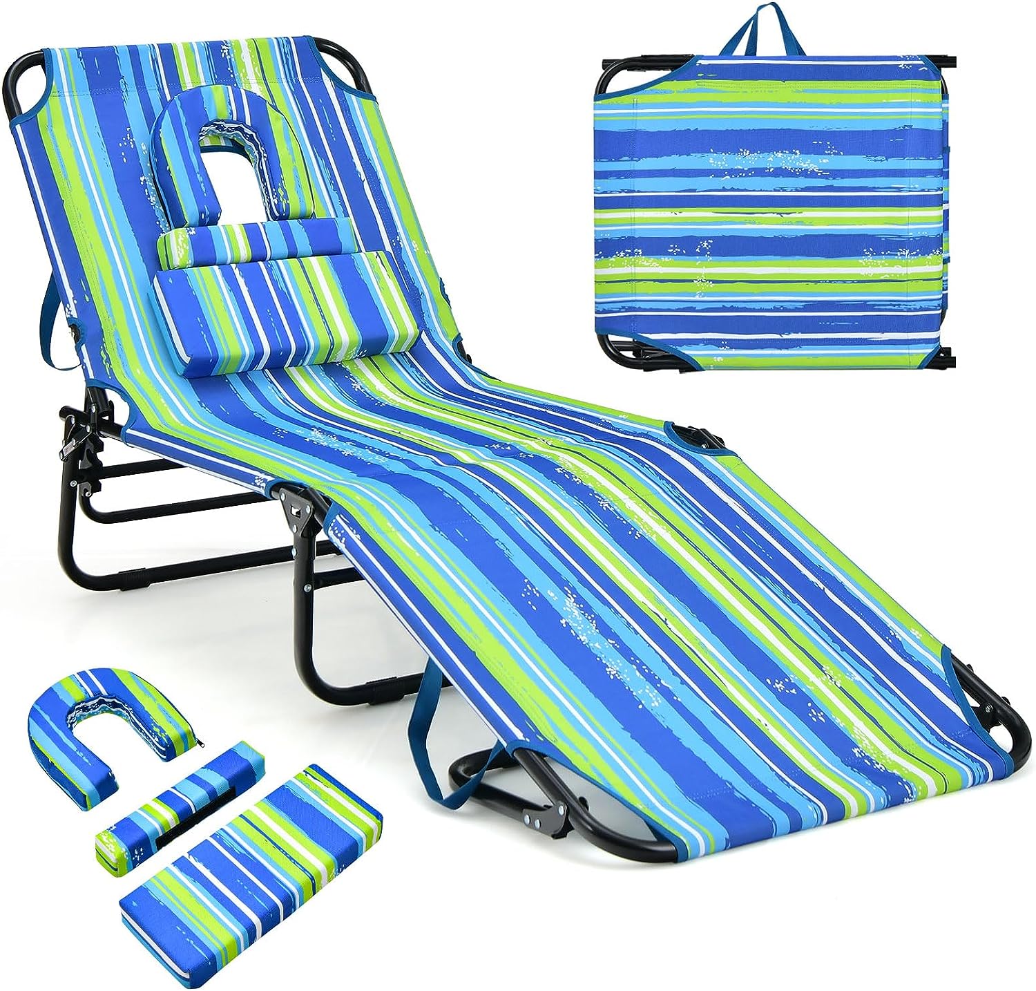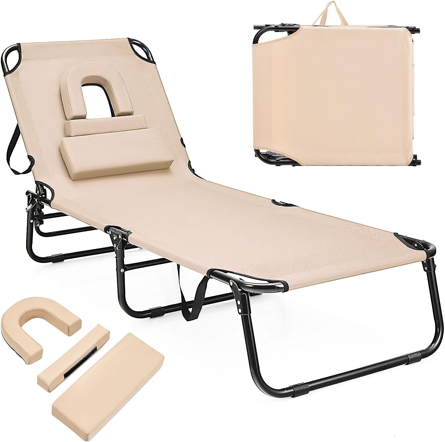 Indulge in ultimate relaxation with our beach chaise lounge chair and make the most of your summer vacation! This sun lounger offers a 5-position adjustable backrest and a folding footrest, allowing you to find your perfect sitting, reclining, or lying position. It features a convenient face hole, allowing you to comfortably rest your face while lying on your stomach. The chair also comes with three fluffy and detachable pillows for added support and softness.