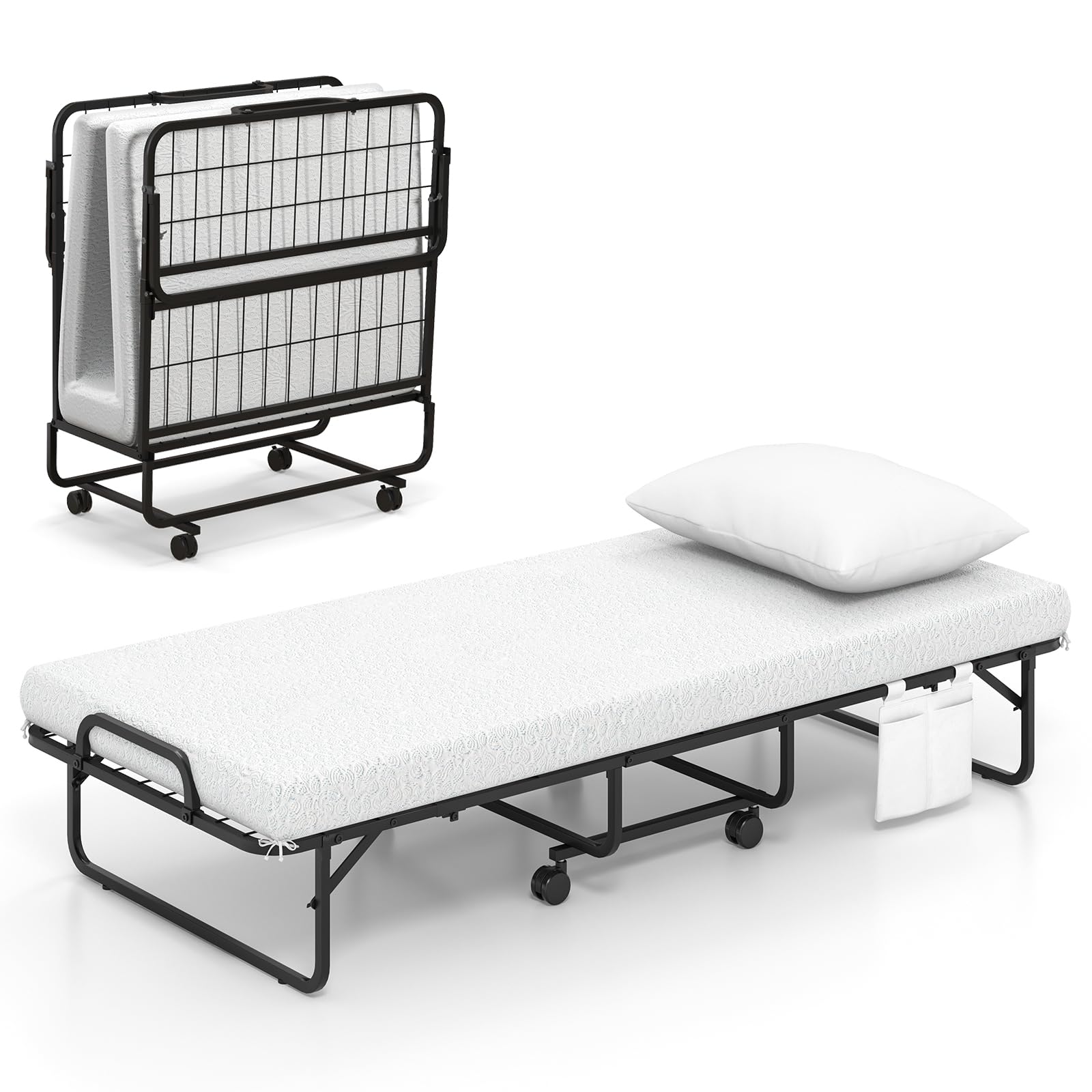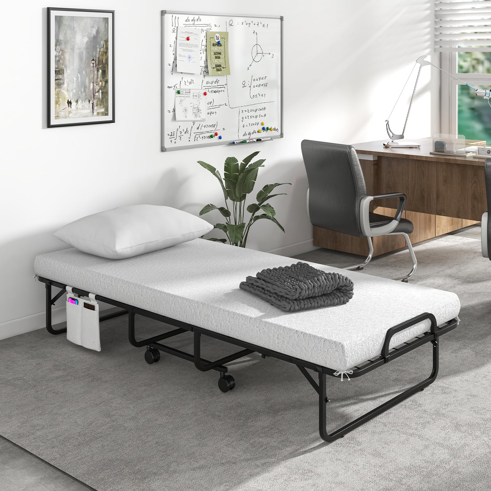 Transform your home with the perfect sleeping solution - our luxurious folding guest bed! Say goodbye to restless nights thanks to the plush memory foam mattress and pillow. Strong, sleek, and built to last, its robust metal frame and secure, non-slip legs ensure stability and peace of mind. When not in use, it folds discreetly into a slim, dust-free package, perfect for tight spaces. Ready for guests? Glide this bed into place with its smooth casters, locking it down with effortless brakes. Plus, the built-in side pocket keeps essentials close yet organized. Ideal for making any room a dream retreat, bring this foldable gem home and indulge in the perfect blend of convenience, comfort, and chic design!