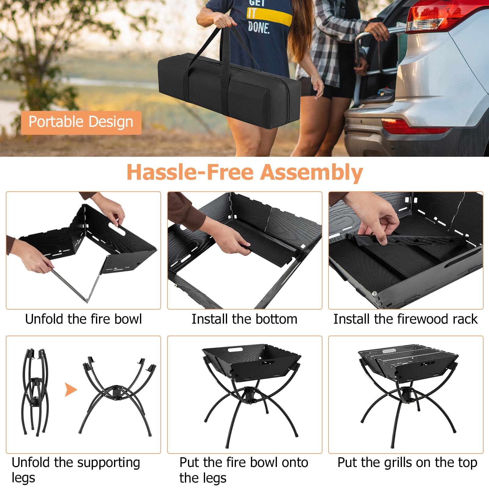 - 【Portable Campfire Grill with Carry Bag】: This fire pit is easily disassembled and folded, allowing it to be conveniently stored in a compact carrying bag measuring only 24'' x 6'' x 6'' (L x W x H). Its portable design enables effortless transportation and storage.