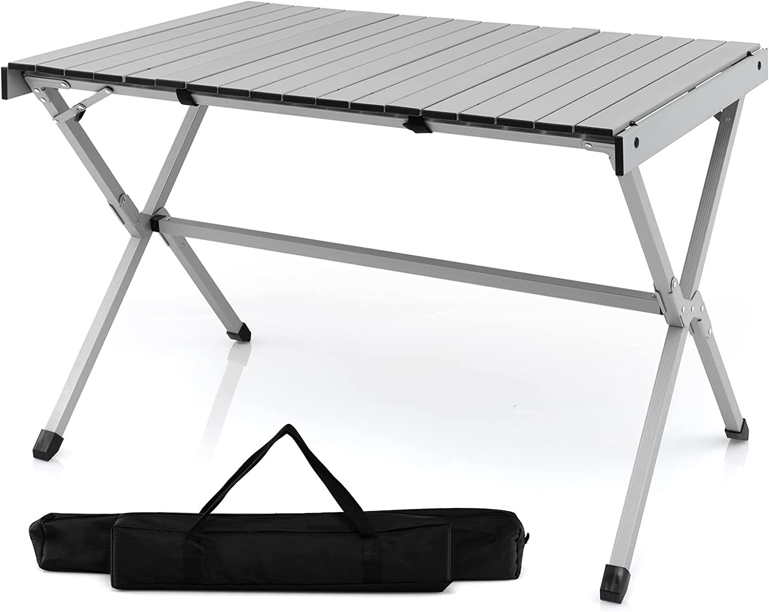 When you open the package, this camping table is already for you to carry because the roll-up tabletop and the folded frame are well packed in the carrying bag. Therefore, you can put it in your trunk for your wonderful outdoor trip. And the installation of this outdoor folding table will be very fast without using any tools. What's more, the selected aluminum material makes this camp table withstand changing weather so that you can leave it outside if you want to rest in the tent. The sturdy triangular constructions and anti-slip foot pads keep this aluminum folding table stable.