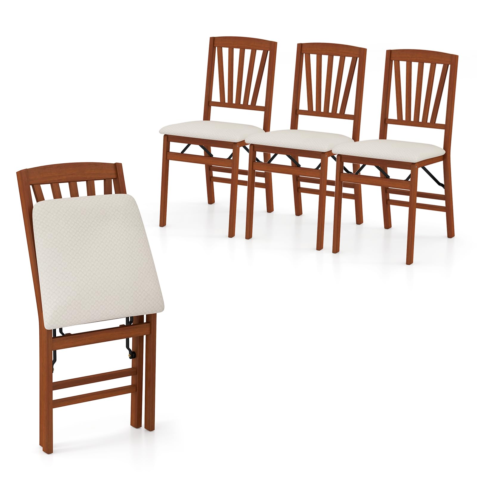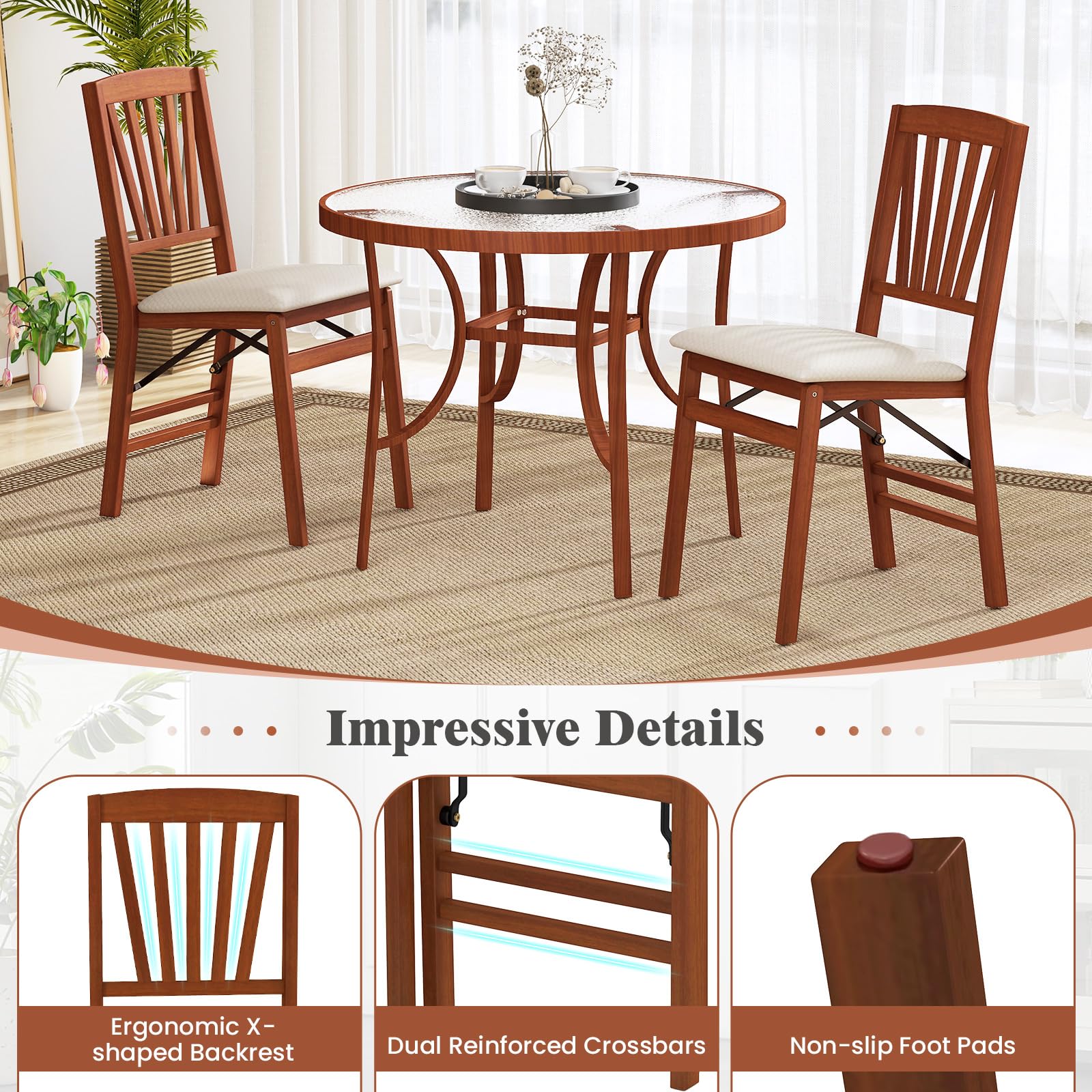 Crafted with rubber wood, the frame of our dining chair stands as a testament to superior sturdiness and longevity. The slatted backrest of our dining chair is not just a visual delight but serves a crucial purpose in providing ergonomic support to the sitter. The padded seat is covered with linen fabric, which is breathable for a cozy sitting experience. Additionally, the sponge filling further ensures fatigue is kept at bay even after extended use. The dining room chairs feature reinforced crossbars, ensuring a maximum load capacity of 400 lbs. Thanks to the folding design, the armless kitchen chair is a more space-efficient choice for your dining area. Moreover, there are impressive details like anti-slip pads, which will protect the floor from scuffs.